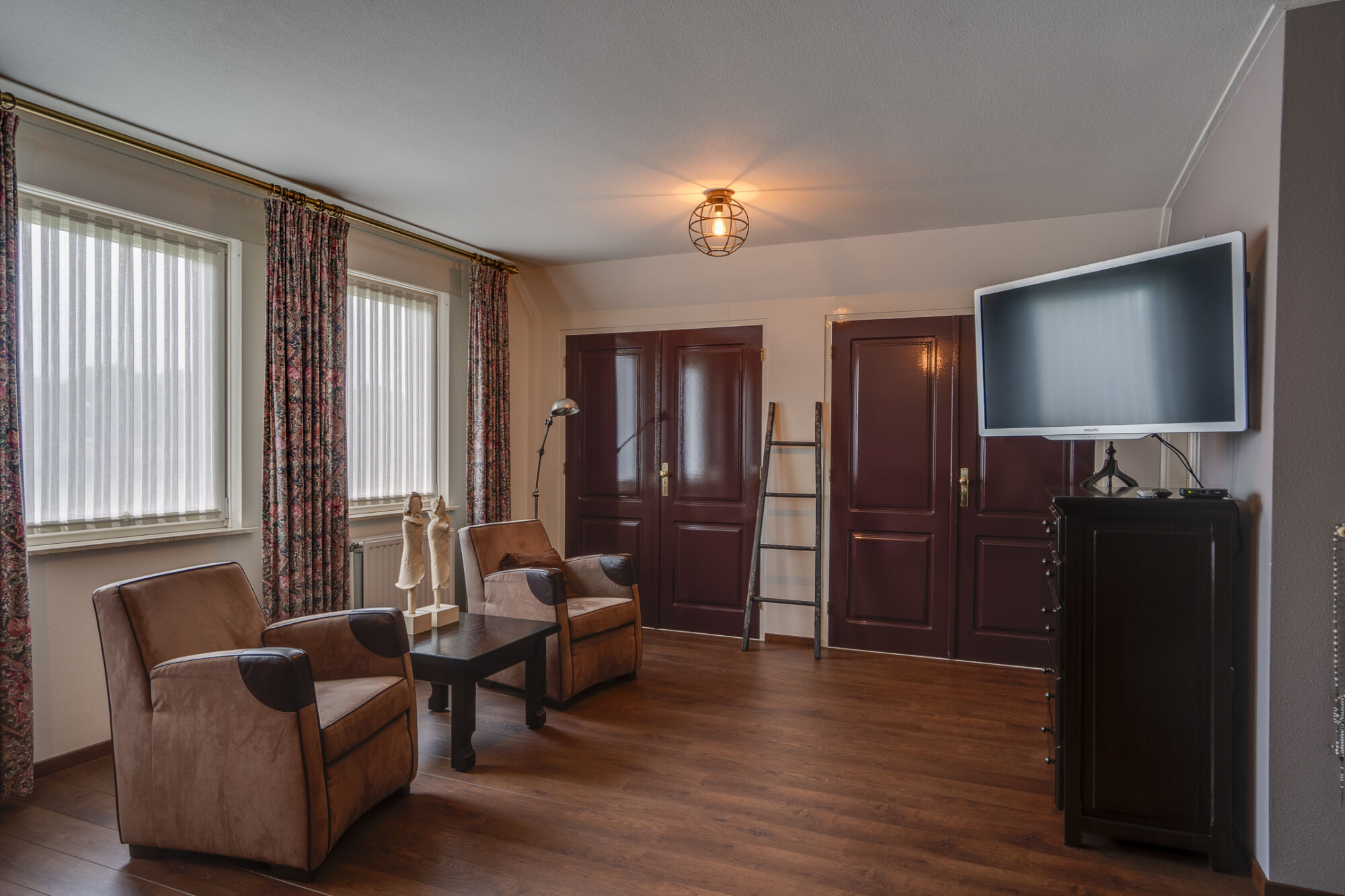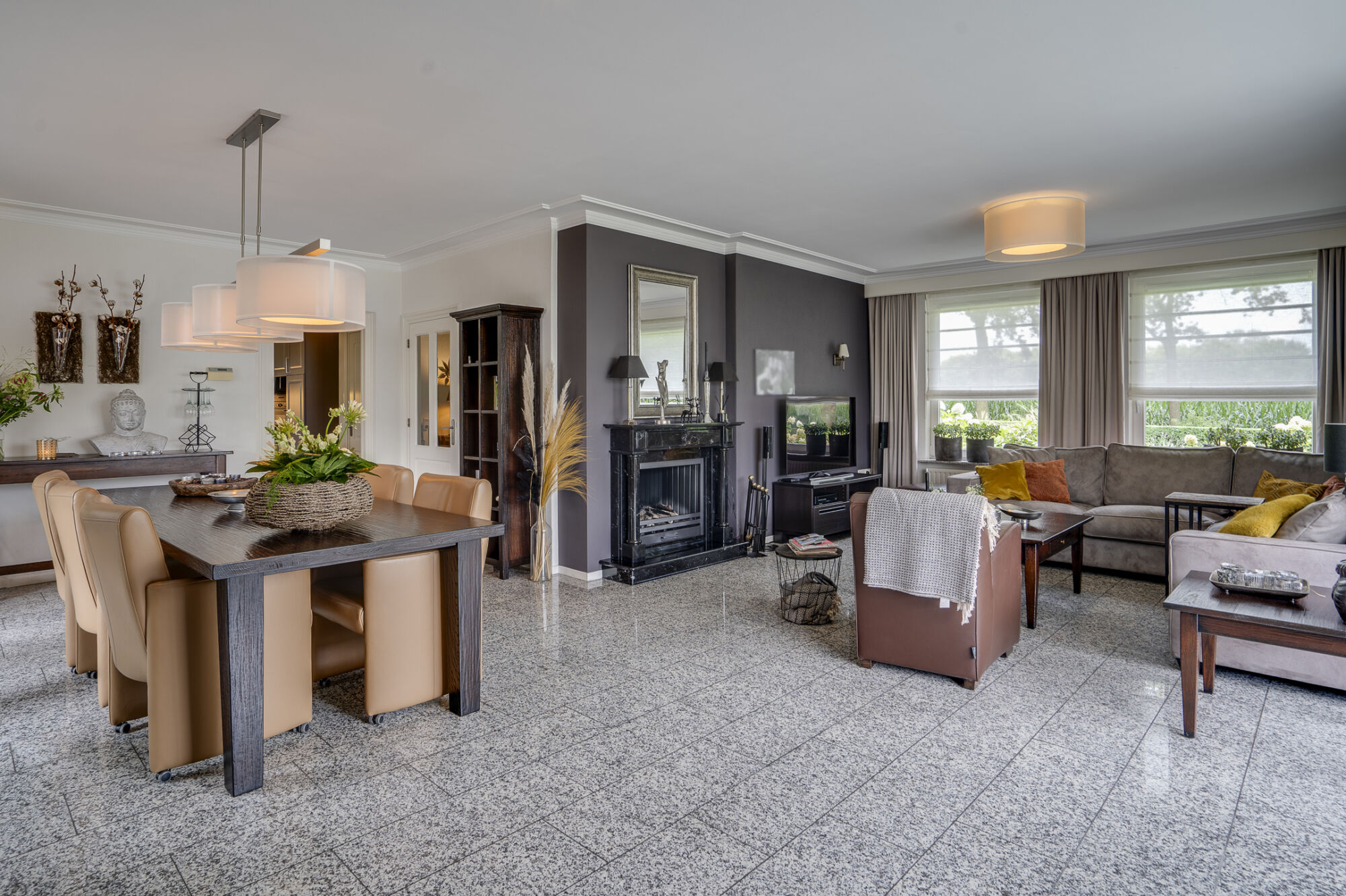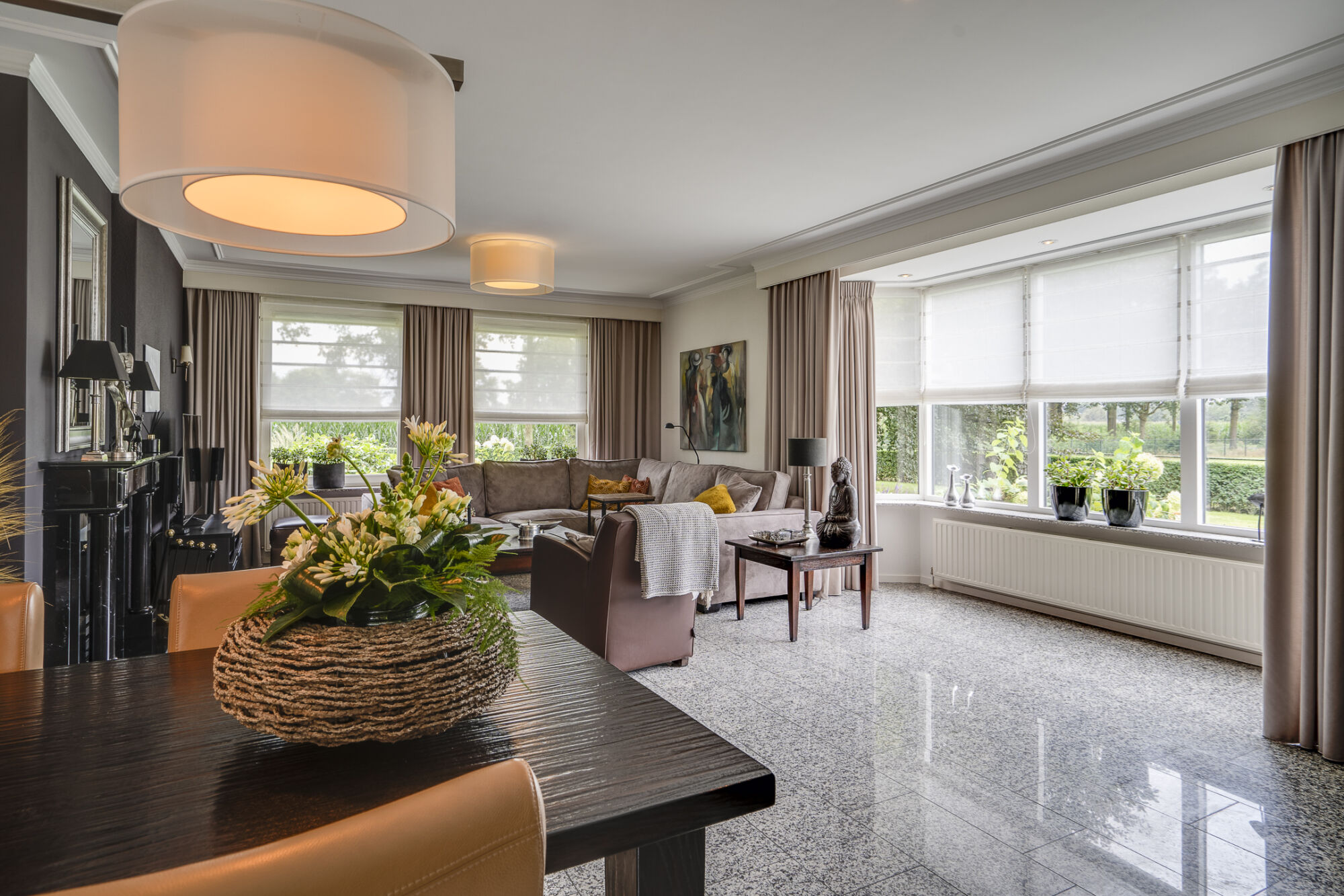 De woonkamer is voorzien van een schuifpui, natuurstenen vloer, sierlijsten, ruime erker en een gashaard. Door de grote ramen en de schuifpui is er een uniek vrij uitzicht over de tuin en naastgelegen landerijen.