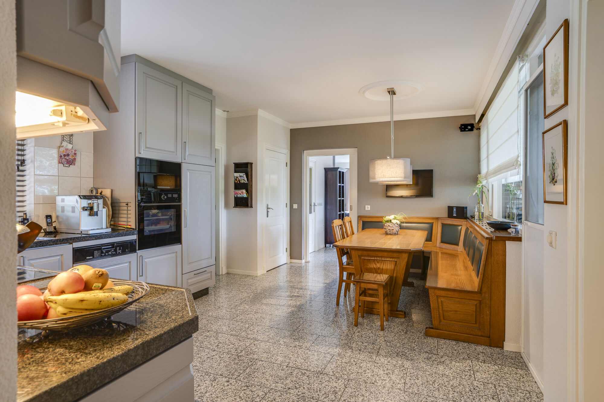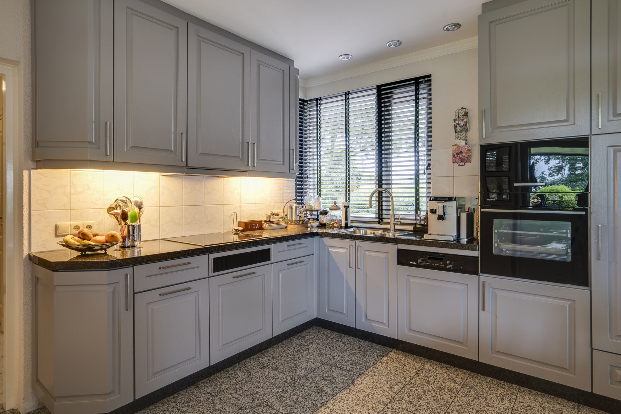 Direct vanuit de woonkamer is er toegang tot de ruime woonkeuken. De tegelvloer, welke ook is gelegen in de woonkamer, is in zijn geheel doorgetrokken in de keuken. De keuken is geplaatst in hoekopstelling en is voorzien van de volgende apparatuur: hogedruk stoomoven, oven, vaatwasser, koelkast, inductiekookplaat, 1,5 spoelbak met Quooker.