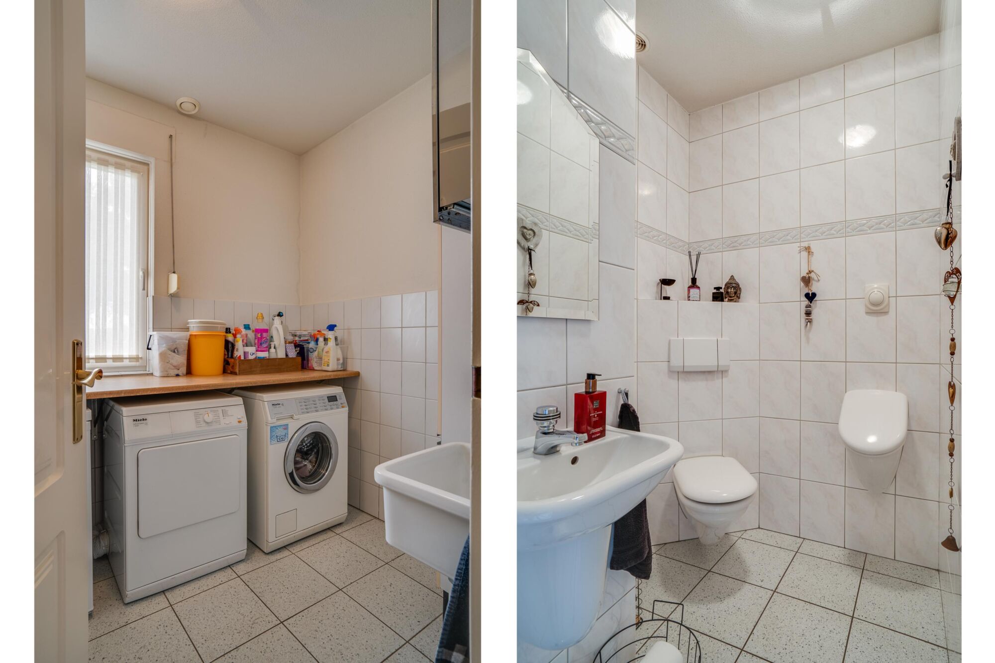 Het portaal geeft toegang tot de wasruimte (welke is voorzien van witgoedaansluitingen) met uitstortgootsteen en het toilet met urinoir en fonteintje.