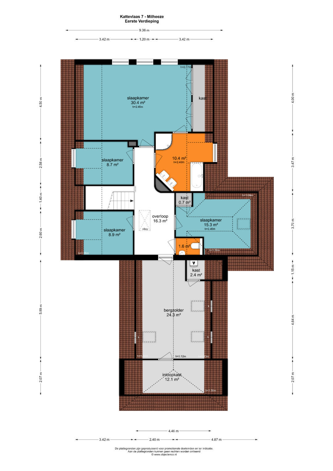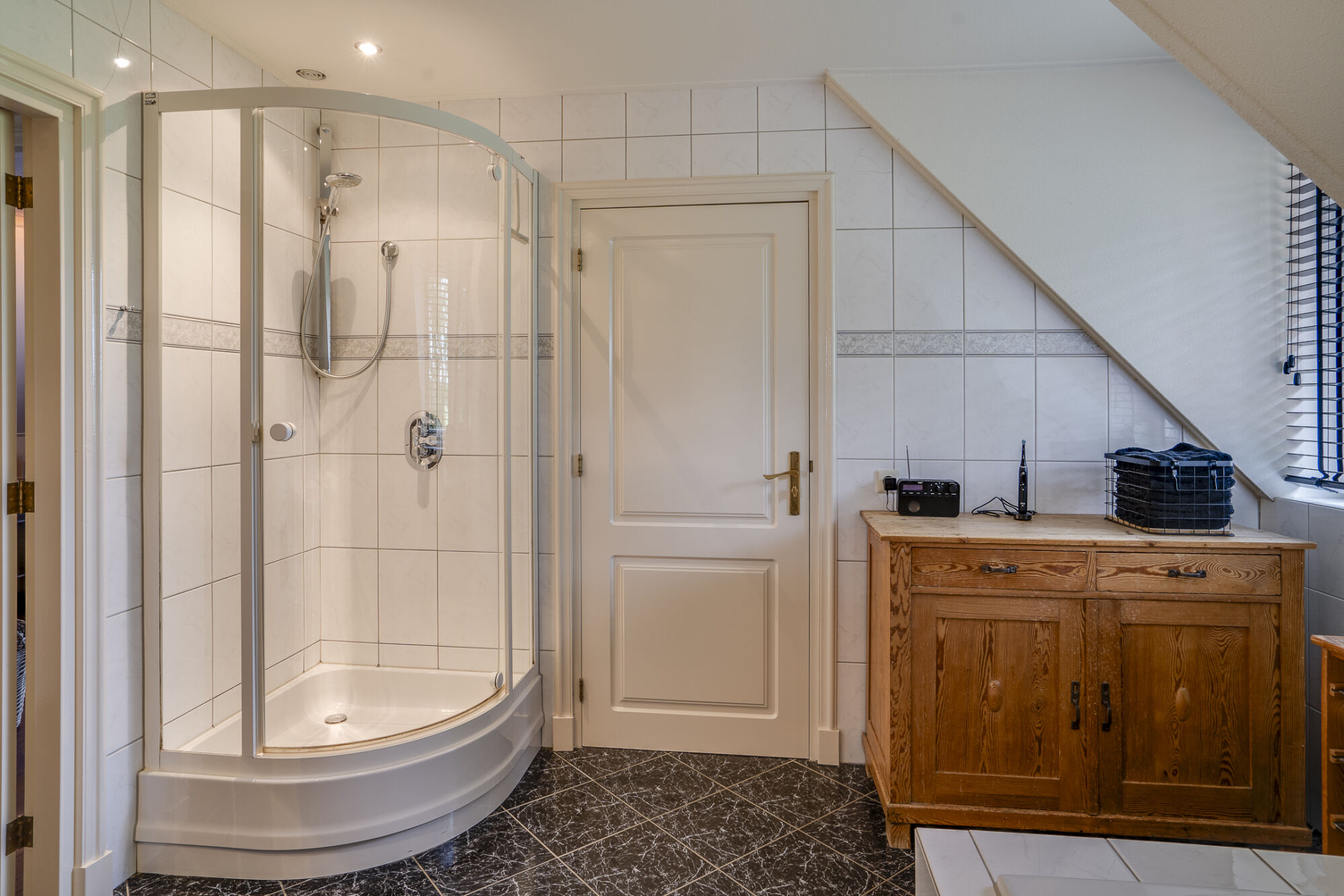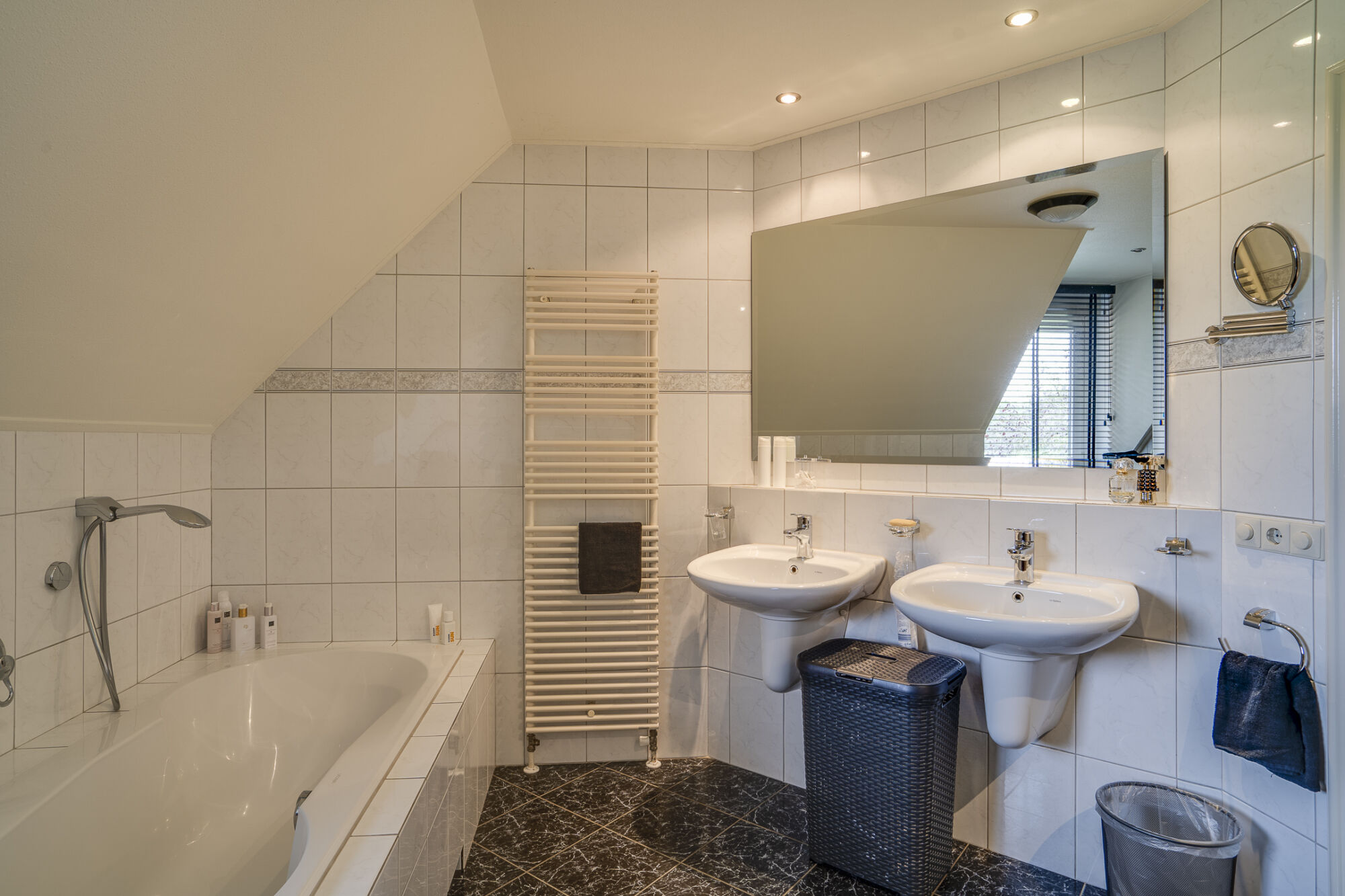 De badkamer is bereikbaar vanuit de masterbedroom en de overloop. Deze is voorzien van een ligbad, douche, dubbele wastafel en vloerverwarming.