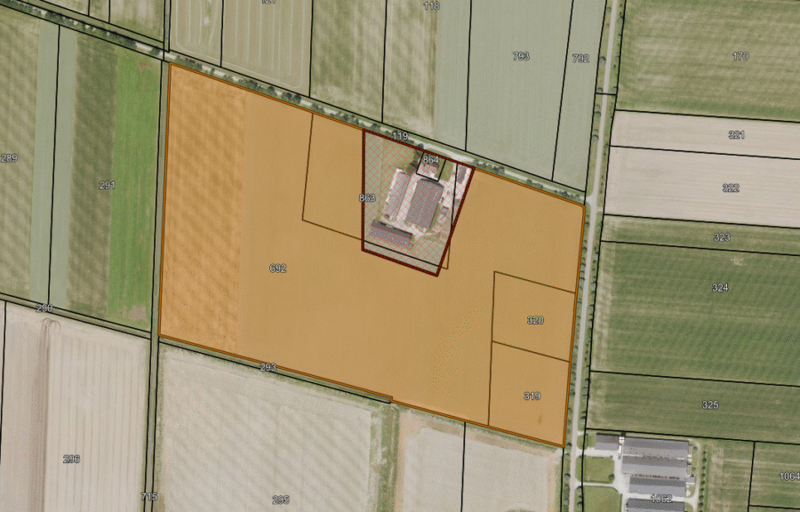 – Voorafgaand aan de inschrijfprocedure is een kadastrale splitsing opgestart om de bovengenoemde percelen kadastraal te splitsen. Daarbij zal de locatie Spapenhoefstraat 1, inclusief het onderliggende bouwblok, een eigen kadastraal nummer verkrijgen. De totale oppervlakte van het perceel dat te koop wordt aangeboden bedraagt hierdoor circa 11.11.50 hectare. Eventuele meer- of minderoppervlakte zal naar evenredigheid worden verrekend. De locatie Spapenhoefstraat 1 met ca. 1,30.00 ha. ondergrond behoord derhalve niet bij de verkoop.