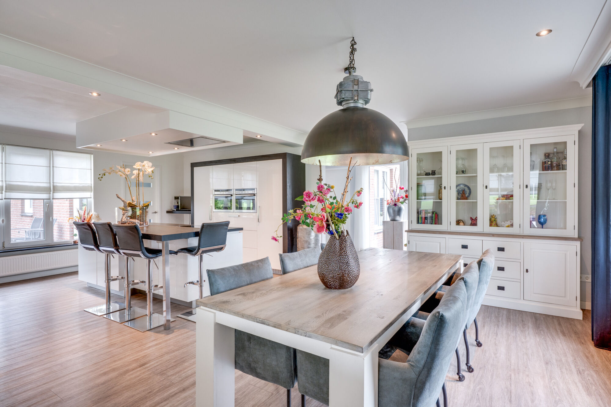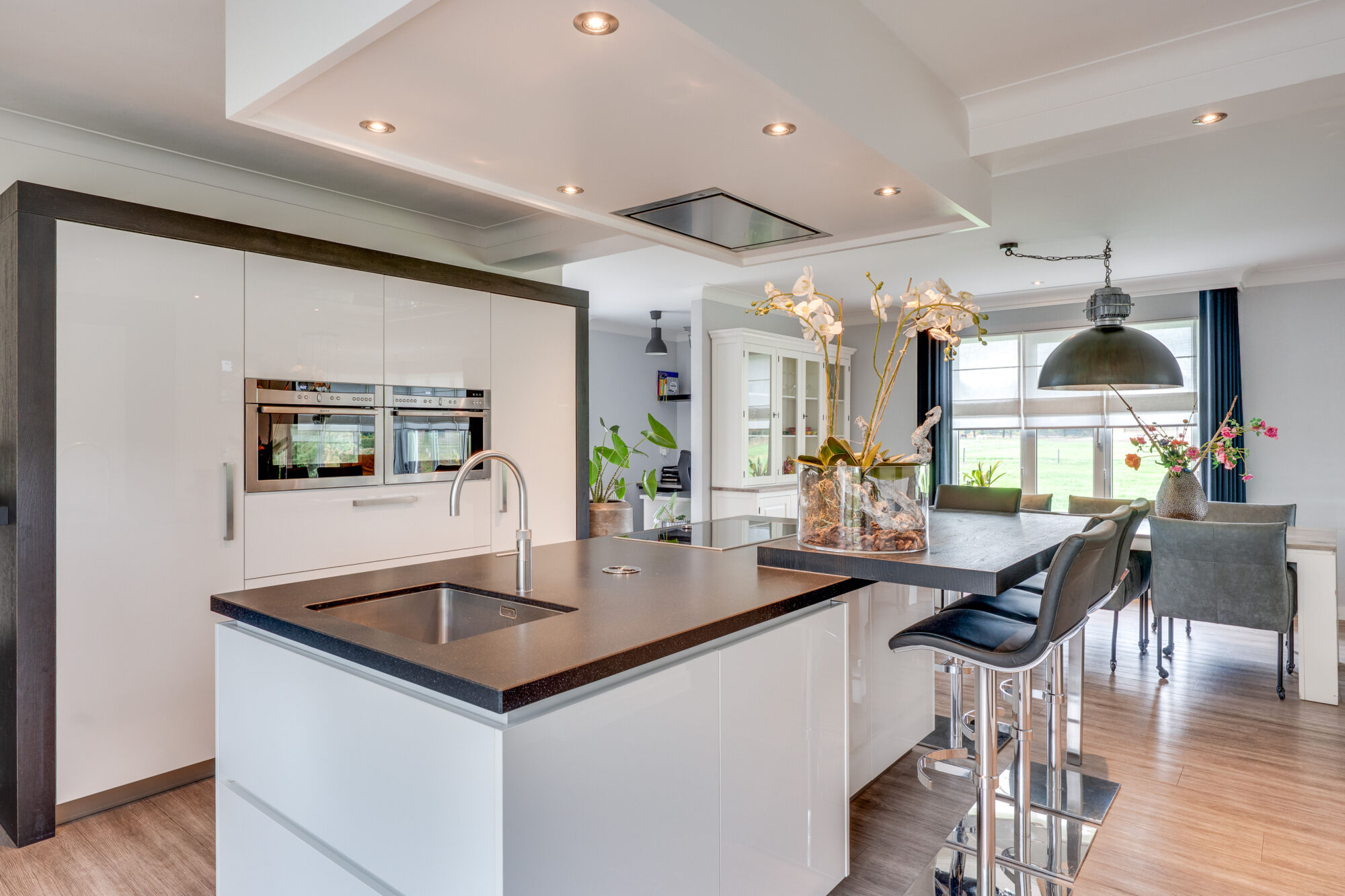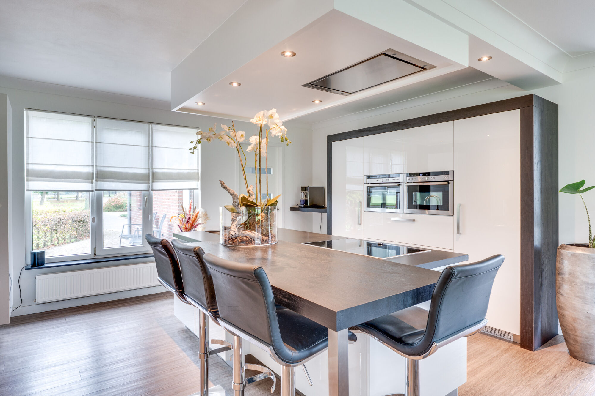 In open verbinding met de woonkamer vindt u de royale keuken met kookeiland. De keuken is van alle gemakken voorzien: inductiekookplaat, combi- stoomoven/ magnetron, Quooker en koelkast. De schuifpui zorgt ervoor dat het terras te bereiken is.