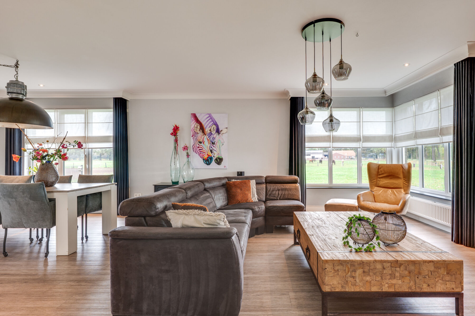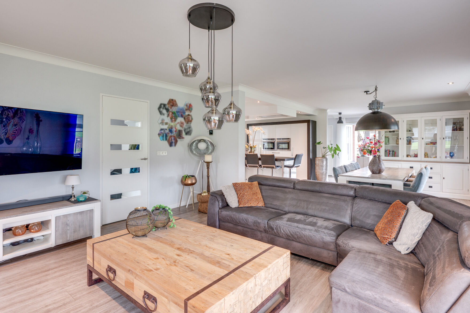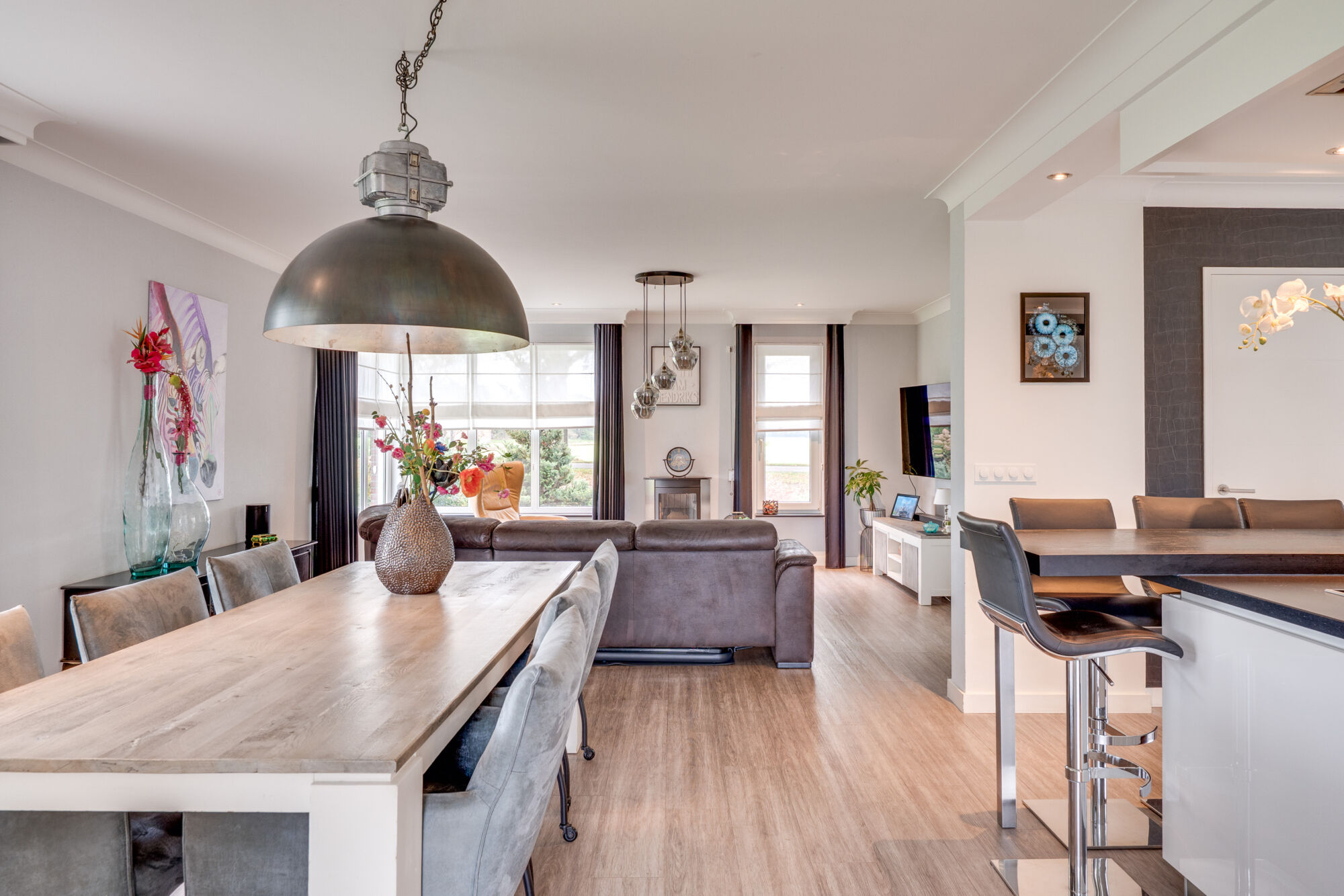 De woonkamer is voorzien van ruime raampartijen wat zorgt voor een open gevoel en waardoor de woning is voorzien van veel lichtinval. Wat voor een extra gezellige sfeer zorgt is de gashaard welke zich in de zithoek bevindt.