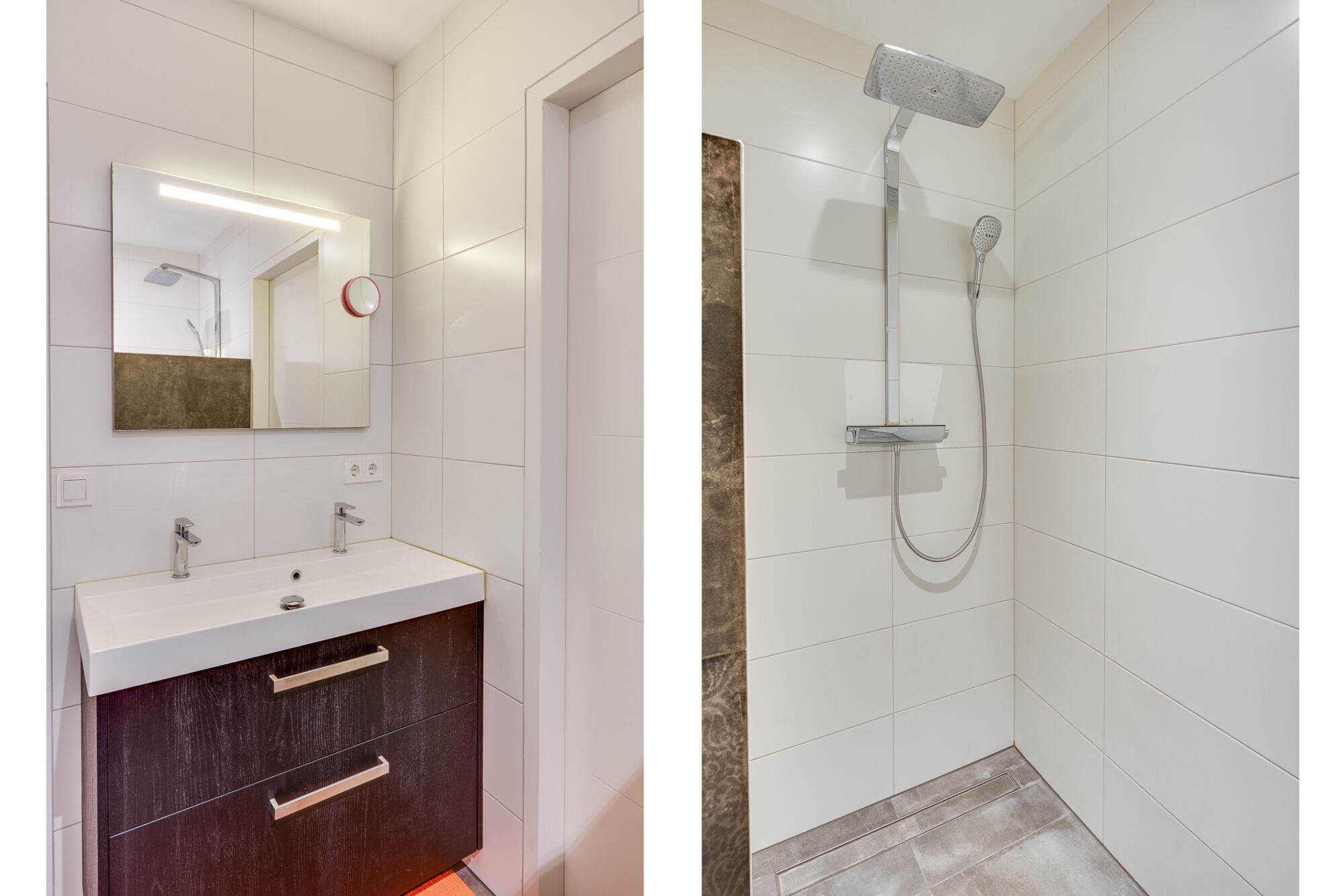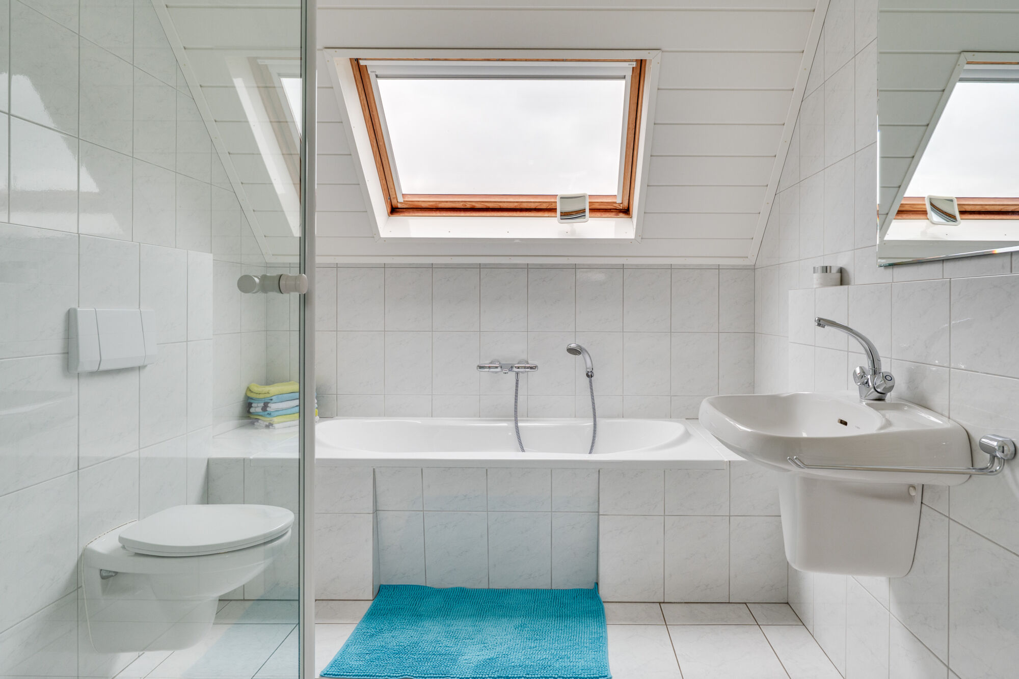 De badkamer is geheel betegeld en voorzien van een toilet, wastafel, douche en ligbad. Ook is de badkamer voorzien van vloerverwarming.