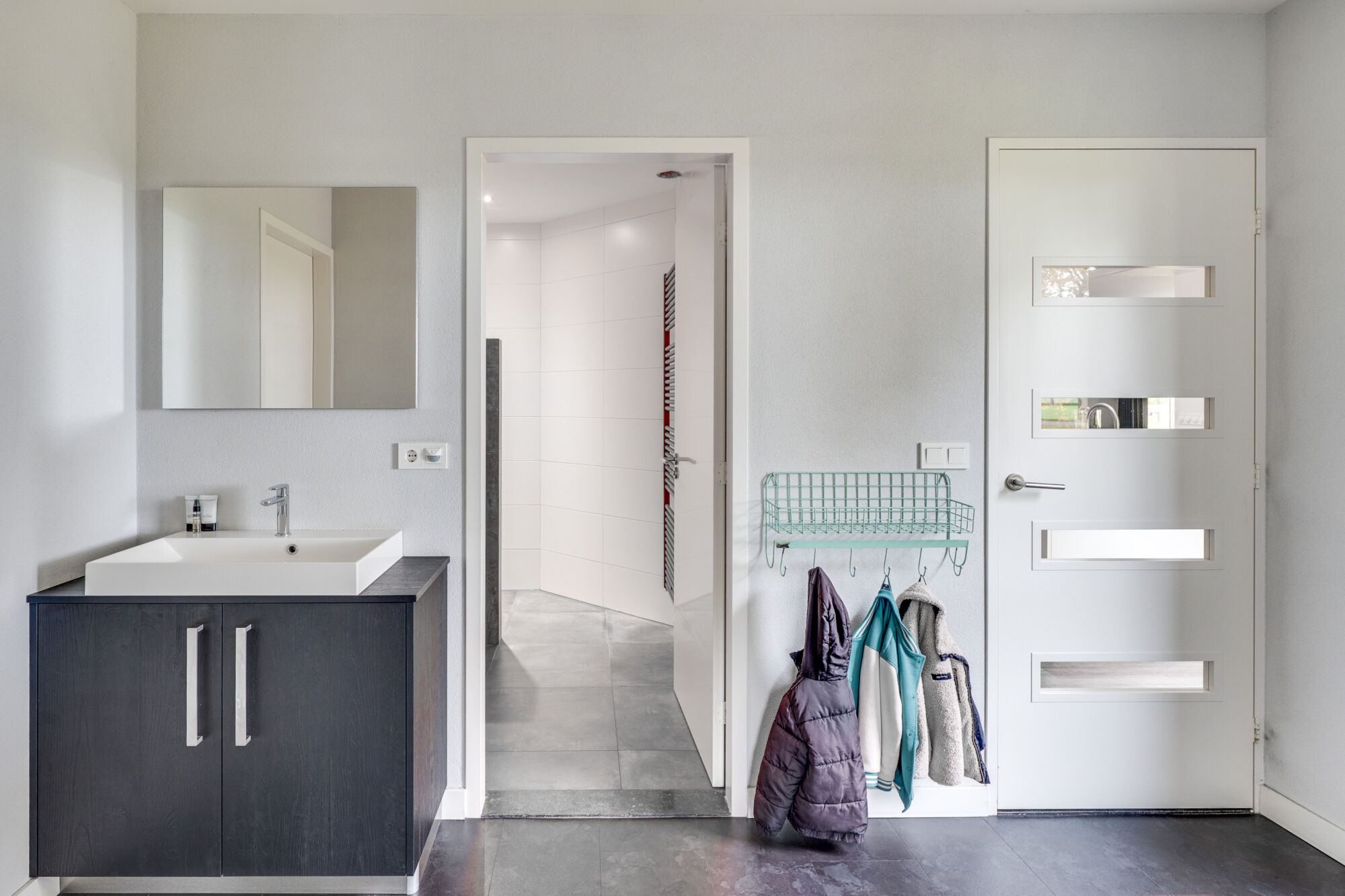 Vanuit de keuken en de ensuite badkamer van de slaapkamer is de achterhal met witgoedaansluitingen en toilet te bereiken.