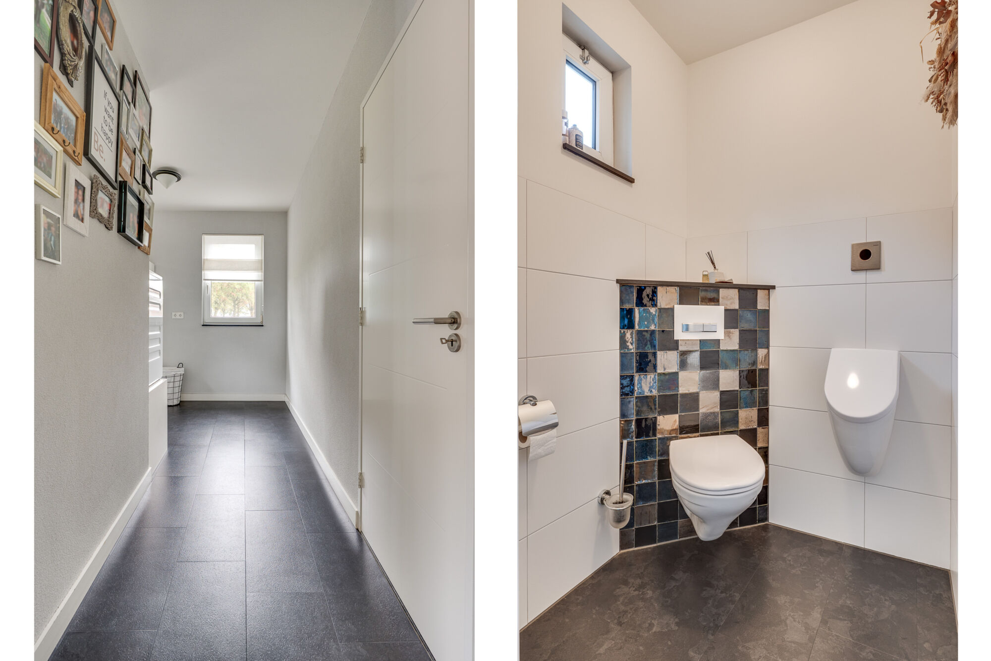 Het toilet is deels betegeld en is voorzien van een urinoir.