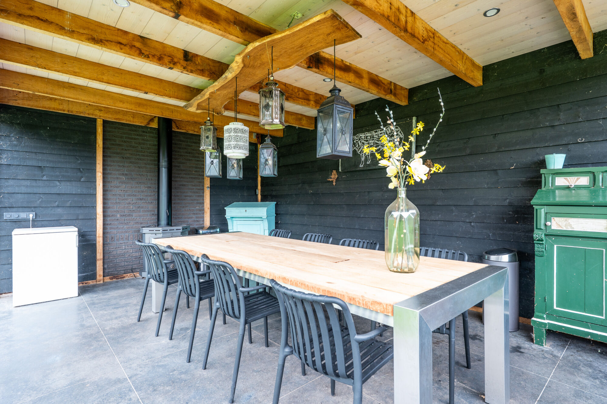 De serre is over de gehele lengte voorzien van glazen schuifdeuren. Tevens bevindt zich in de serre een houtkachel.