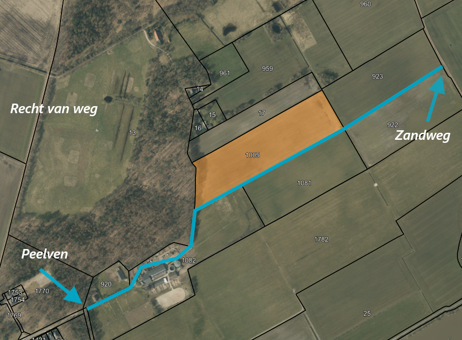 – Het perceel is ontsloten middels een recht van weg (overpad) en hierdoor te bereiken vanaf twee zijden. Via de inrit van Peelven 2 en middels achtergelegen zandweg. Aan de rechter zijde van het perceel bevindt zich een betonpad (kavelpad) welke overgaat in gras.