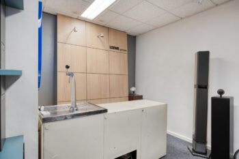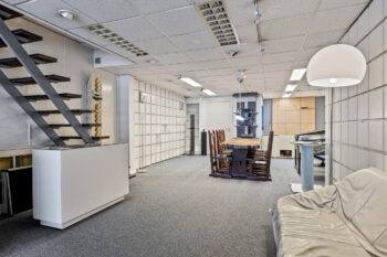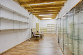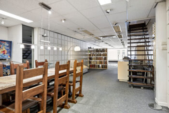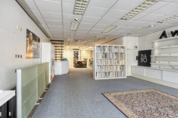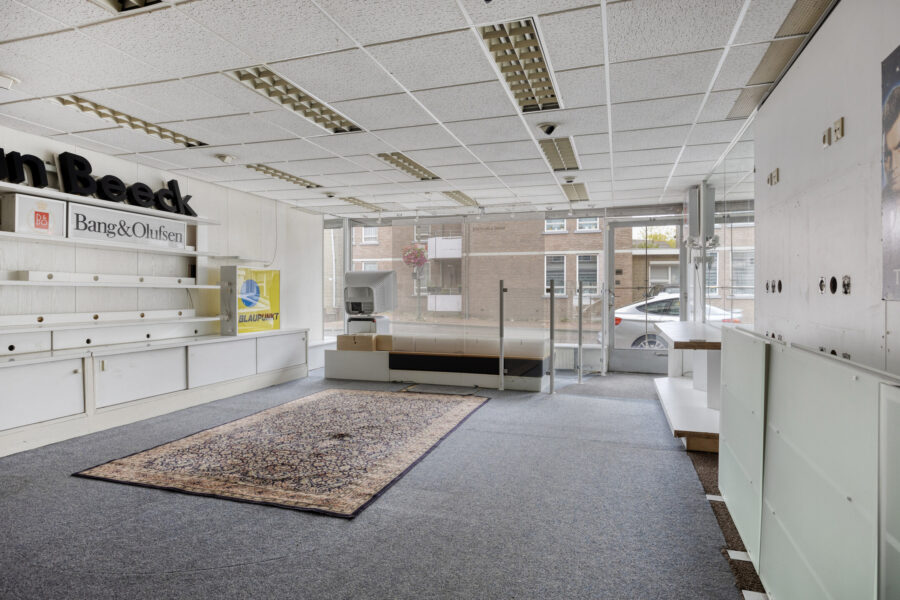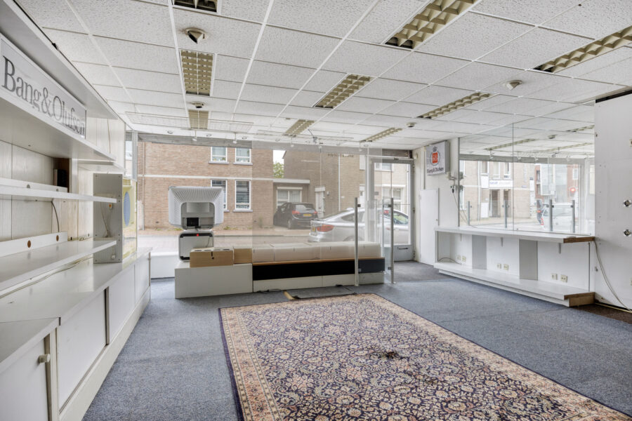 Wanneer u voor het pand staat kijkt u recht de winkelruimte in. Door middel van een glazen pui van bijna 5,5 meter (incl. de glazen deur) wordt u praktisch de winkel in getrokken. Via de glazen loopdeur komt u het pand binnen in de gigantische voormalige showroom. Deze showroom loopt als één grote, open ruimte erg ver door naar achteren. Eenmaal achter aangekomen treft u een praktische kantineruimte, een administratief kantoor (ca. 25 m²) en een toiletruimte.