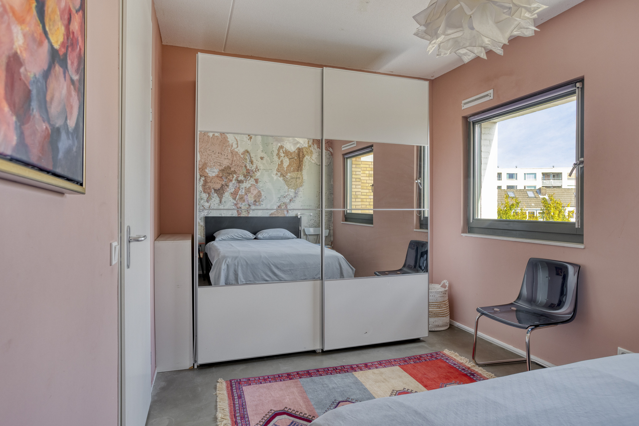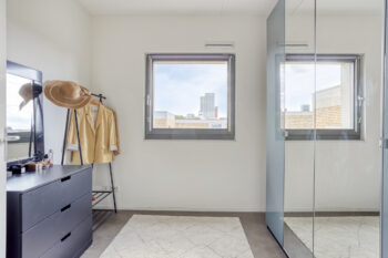 De ouderslaapkamer is ruim genoeg voor een tweepersoonsbed en een flinke kledingkast. Vanuit de ouderslaapkamer heb je uitzicht op het dakterras en het parkeerterrein achter de woning met op de achtergrond de skyline van de stad! Stuk voor stuk leuke kamers met strak gestucte wanden en een mooi uitzicht. Een van de kamers is nu in gebruik als kleedkamer.