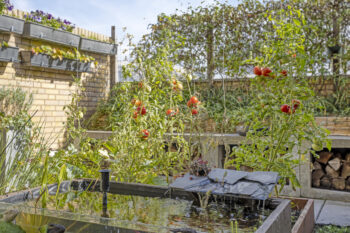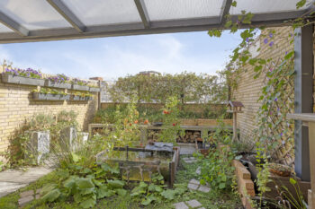 Vanuit de woonkamer/keuken loop je zo het dakterras op. Direct aan de woning is een aluminium veranda met een border van cortenstaal en leuke terrasbestrating zodat je daar een loungeset kunt plaatsen en al in het voorjaar van de eerste zonnestralen kunt genieten. Het is een echte stadstuin met een vijver met wateruitloop, leuke borders, houtopslag, een moestuin en vaste beplanting afgewisseld met plantenbakken. Een klimop aan de achterzijde zorgt voor extra privacy.