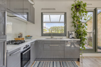 De keuken staat in een hoekopstelling en kijkt uit over het dakterras. Er is volop werk- en bergruimte in deze keuken. De keuken is voorzien van een koelkast en vriezer, een gaskookplaat met daarboven een afzuigkap, een oven en een vaatwasmachine. De keuken heeft daarnaast genoeg ruimte voor een mobiel werkeiland of hakblok.