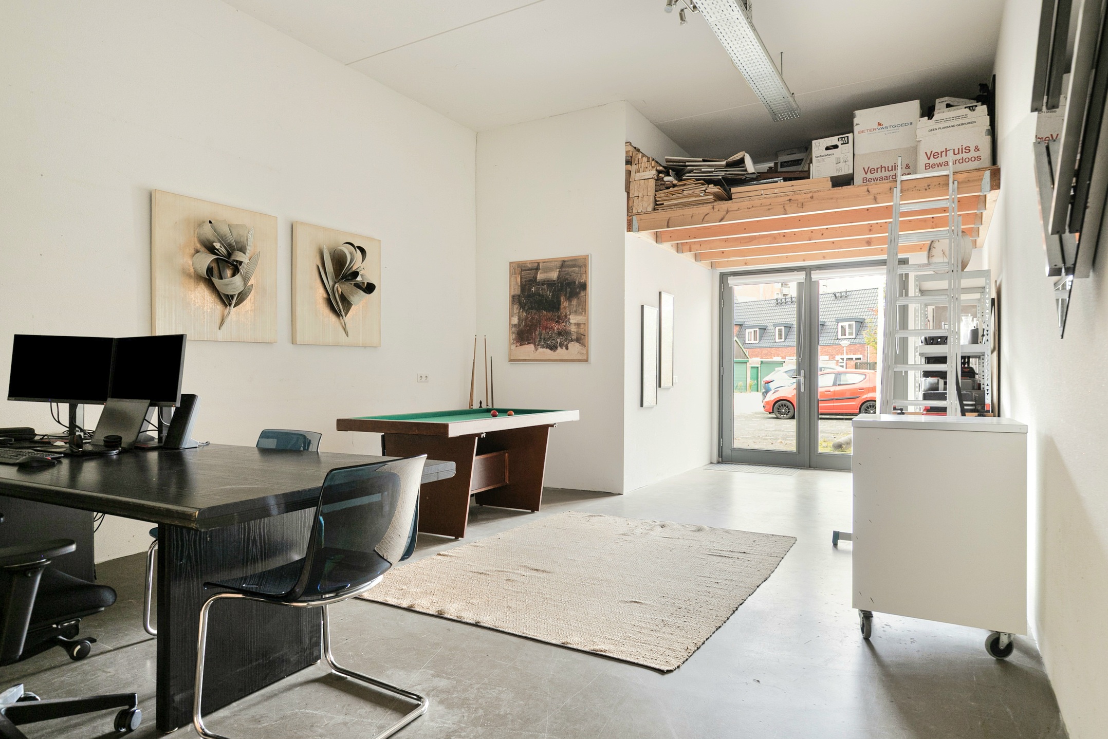De bedrijfsruimte heeft een aanrecht met warm- en koud water en een separaat toilet met een vrijhangend toilet en een fonteintje in meubel. De gietvloer is voorzien van vloerverwarming. Er zijn veel stopcontacten, zelfs in de vloer zodat je veel vrijheid hebt qua indeling en het plaatsen van apparatuur. Een handige vliering zorgt voor extra bergruimte. Een dubbele deur leidt je naar het parkeerterrein waar je je privéparkeerplaats en de deur naar de inpandige berging hebt voor nóg meer opslagcapaciteit.