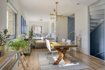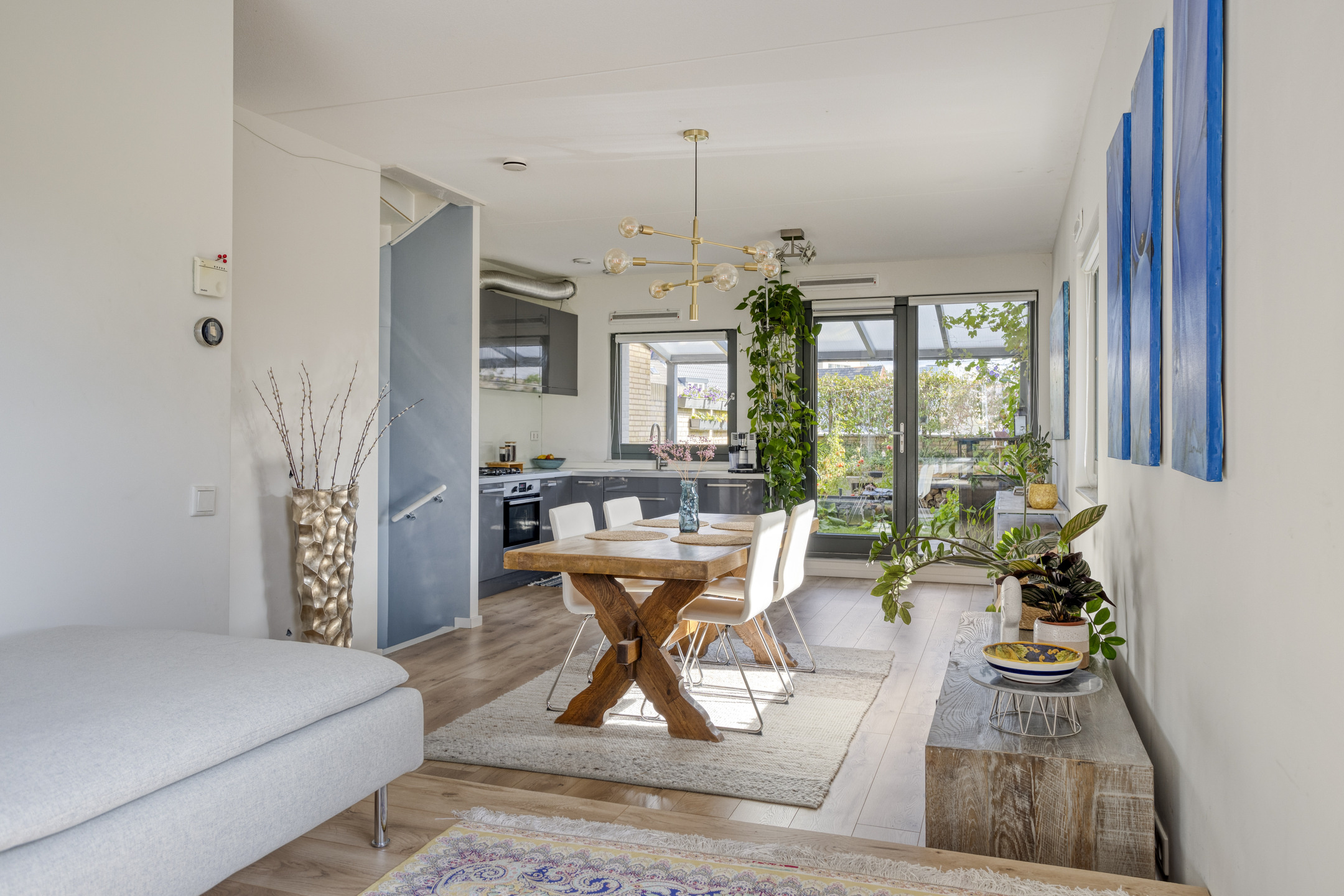 De trap leidt je naar de woonkamer met open keuken. Veel lichtinval vanwege de ramen in de voor-, zij- en achtergevel. Je hebt veel ruimte en tegelijk is het ook gezellig. Mede door het zitgedeelte dat op een iets hoger niveau ligt. Daardoor heb je vanuit de bank een heel leuk uitzicht op de stad en het Klokgebouw op Strijp S. Tussen de zitkamer en de open keuken is de eethoek met meer dan genoeg ruimte voor een grote eettafel.