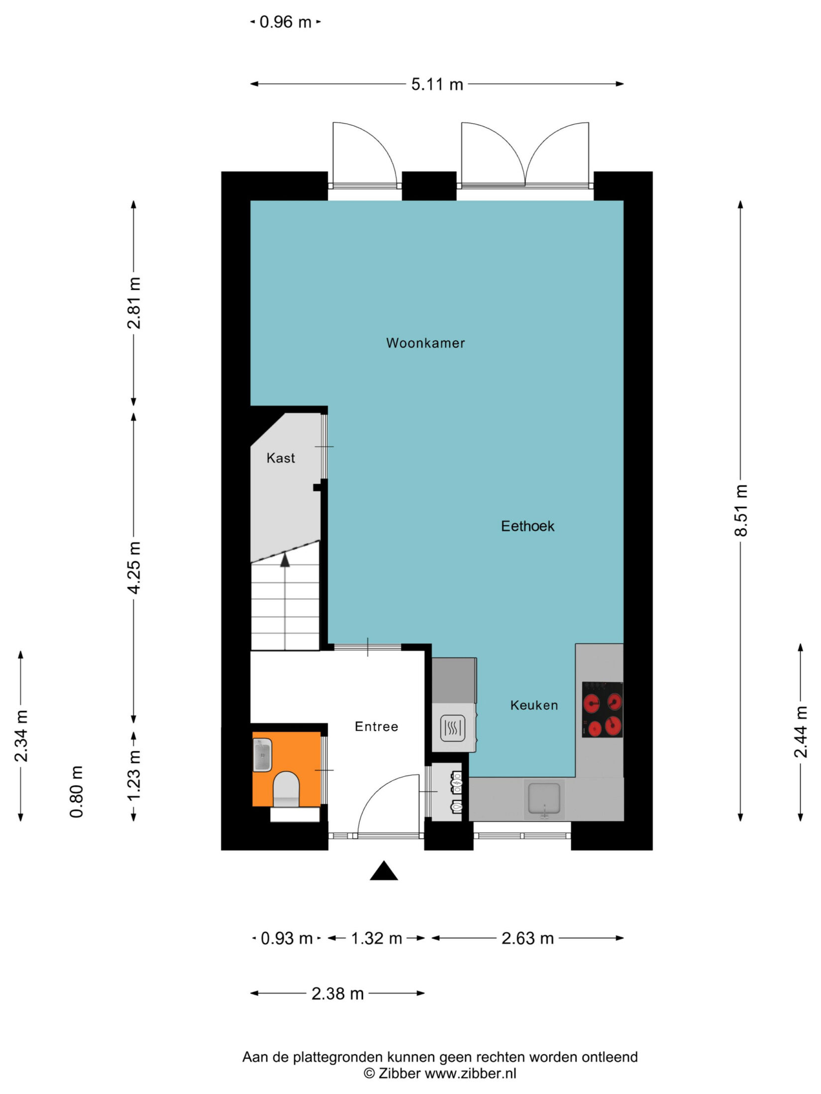 De woonkamer heeft een prettig formaat, waardoor er eenvoudig een gezellige zit- en eethoek kan worden ingericht. Er is een slimme nis gecreëerd voor een televisiemeubel met extra elektronische apparatuur, wat deze plek uitermate geschikt maakt voor de zithoek. Daarnaast biedt de ruimte volop plaats voor een eettafel met stoelen en eventueel een grote kast. Onder de trap bevindt zich bovendien een handige kastruimte, ideaal voor het opbergen van huishoudelijke spullen.