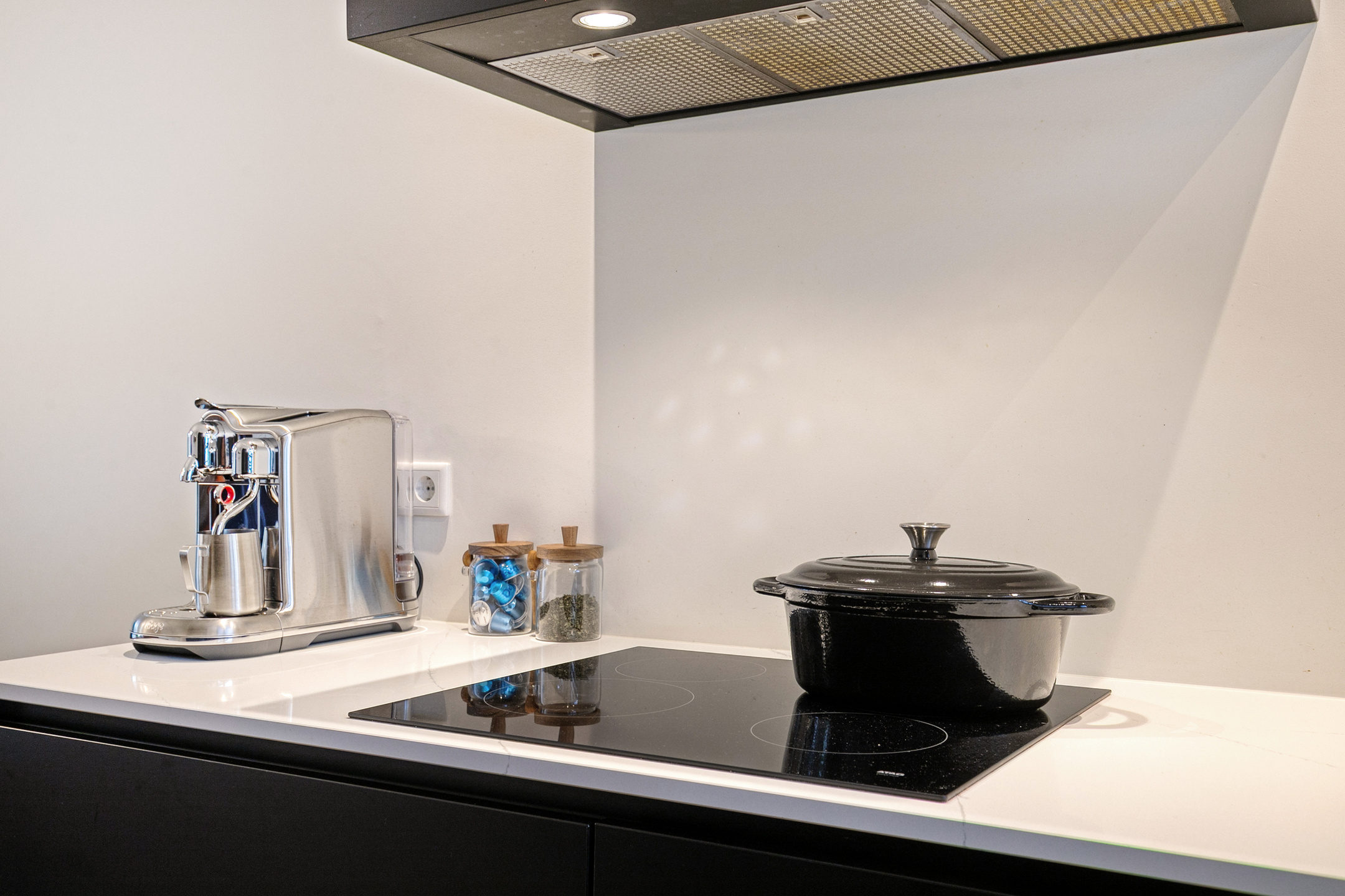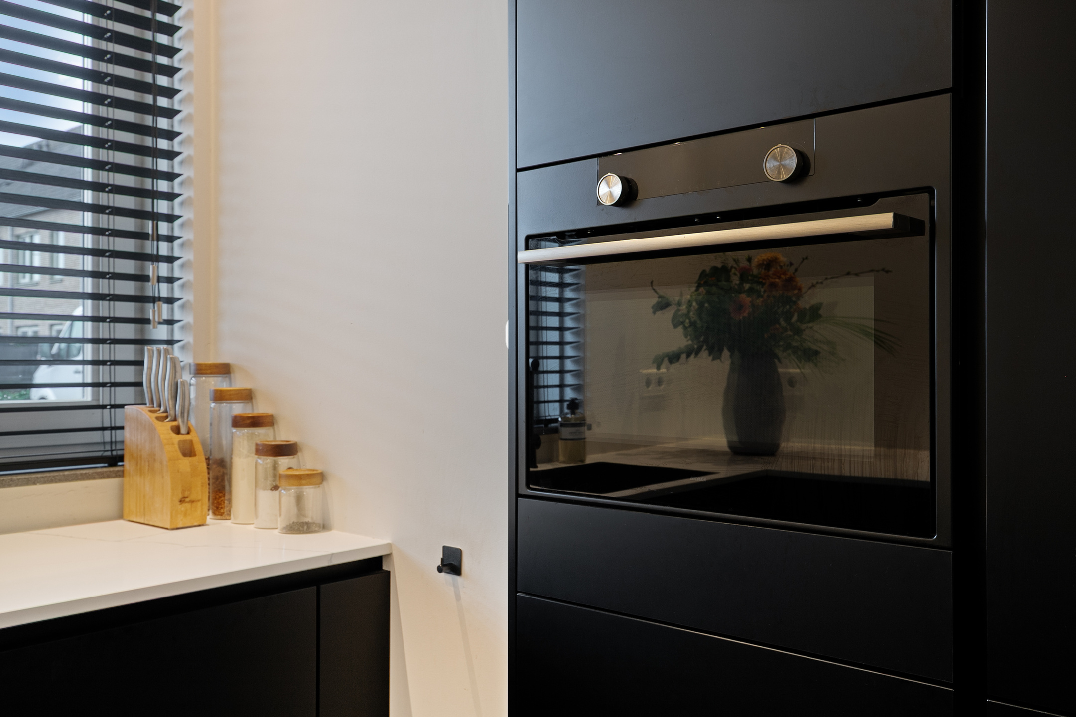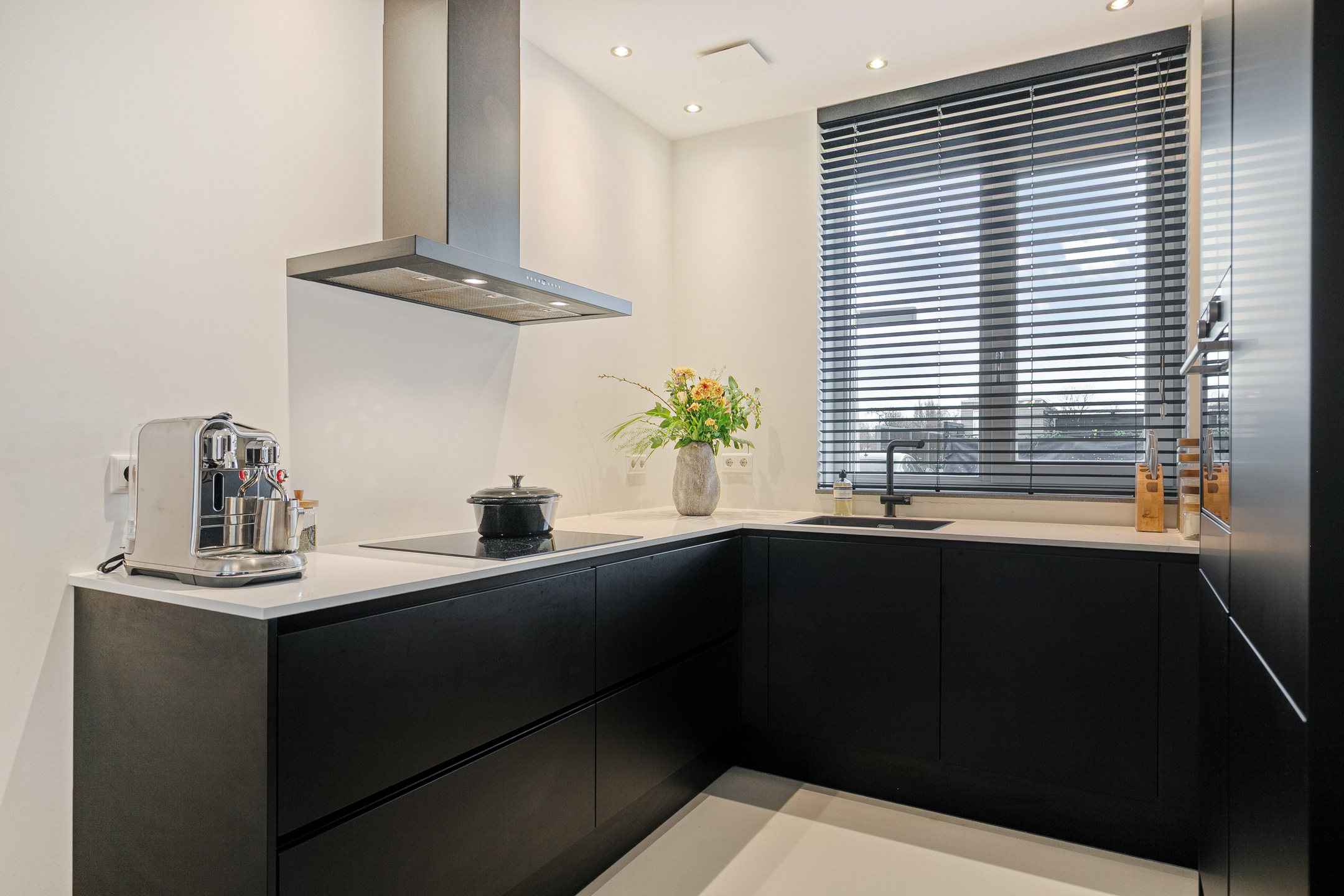 De woning beschikt over een open keuken die luxe en stijlvol is ingericht en naadloos aansluit op de woonkamer. De keuken is afgewerkt met matte keukenkastjes en een massief werkblad en uitgerust met hoogwaardige inbouwapparatuur. Tot de voorzieningen behoren een combi-oven, inductiekookplaat, afzuigkap, vaatwasser, koelkast, vriezer en een spoelbak. Dankzij het raam aan de voorzijde profiteert u hier van prettig veel daglicht en een fijne uitkijk op de straatzijde van de woning.
