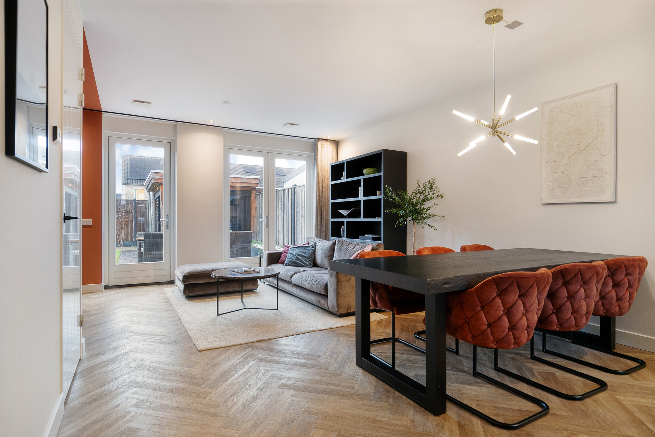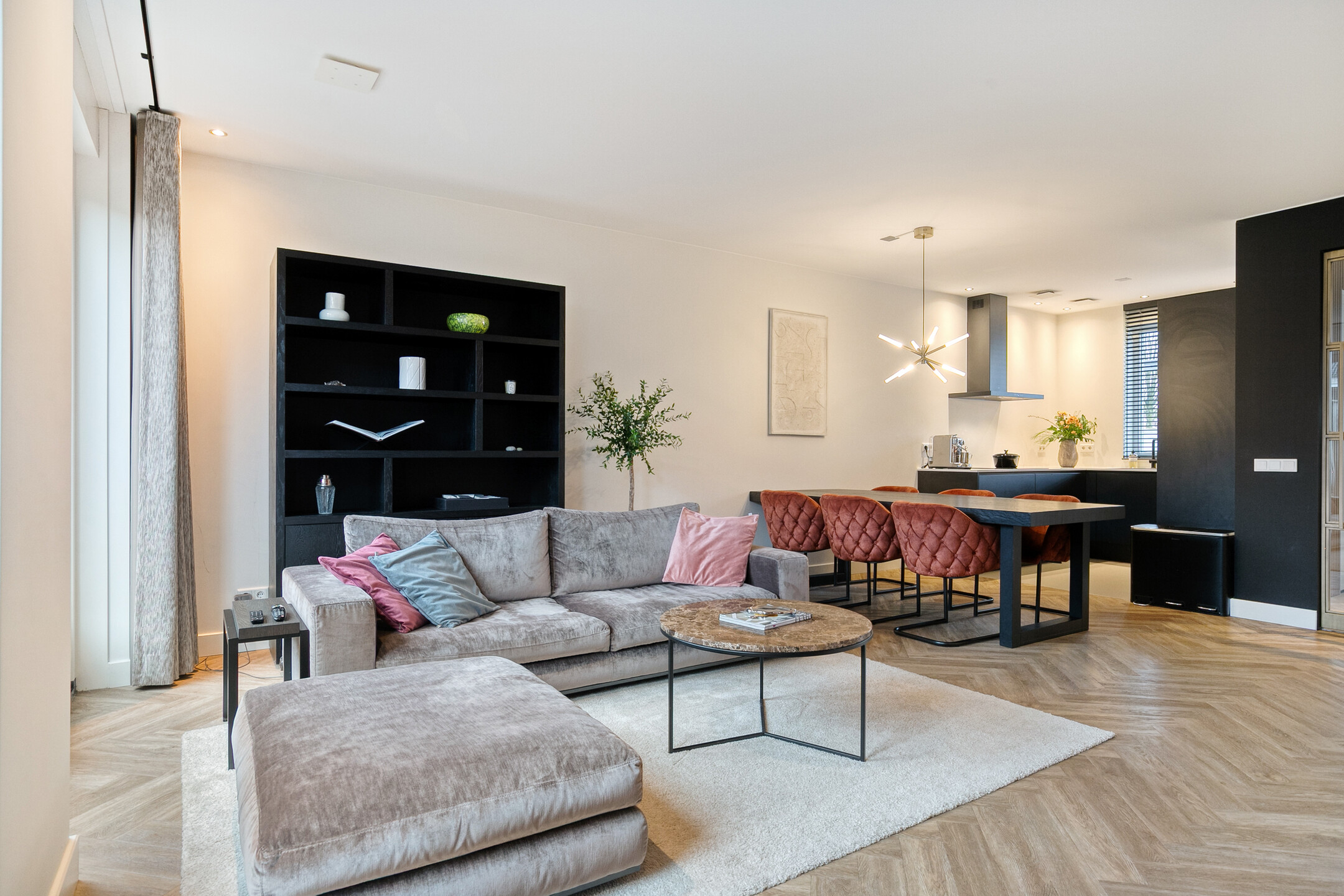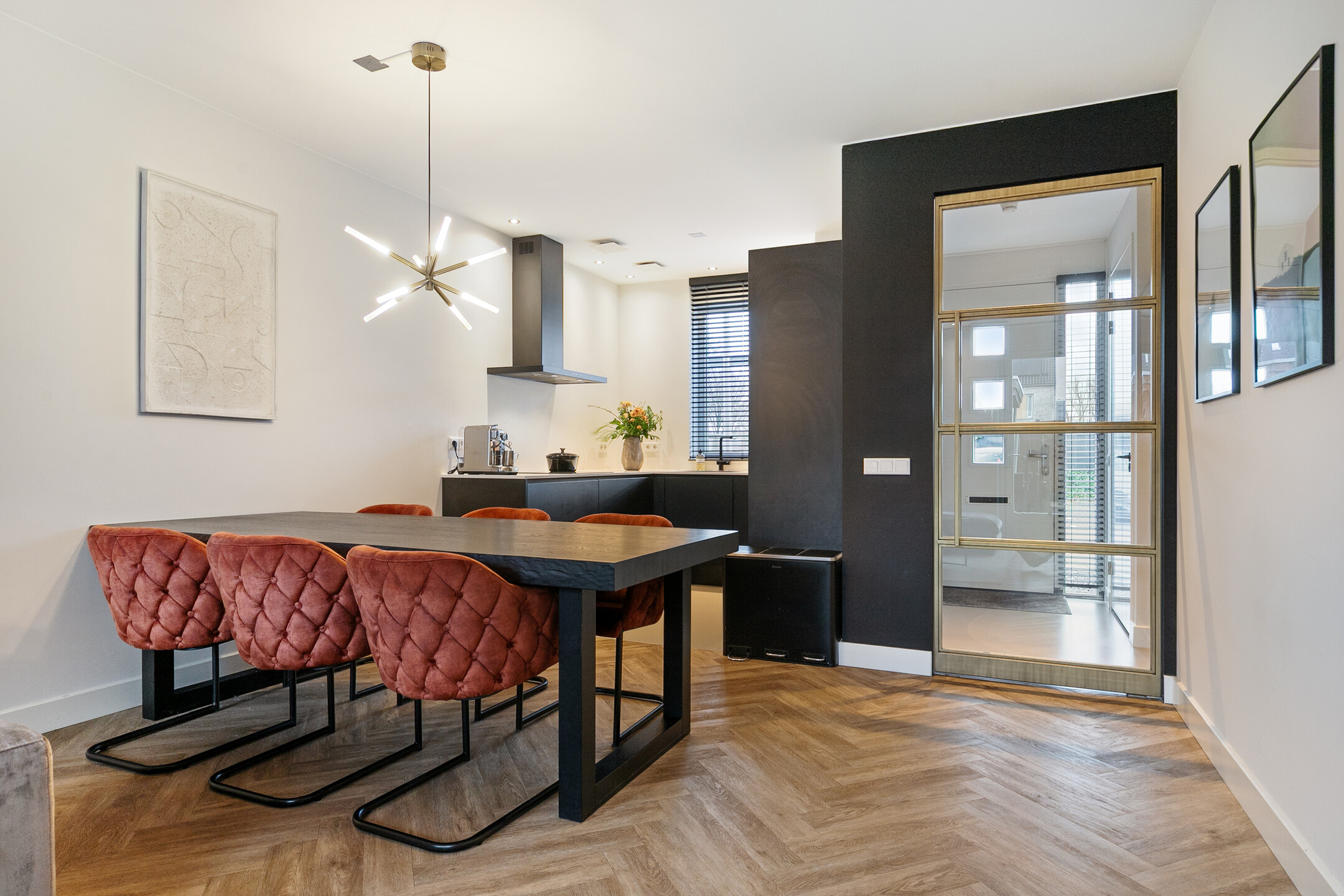 De woning beschikt over een open keuken die luxe en stijlvol is ingericht en naadloos aansluit op de woonkamer. De keuken is afgewerkt met matte keukenkastjes en een massief werkblad en uitgerust met hoogwaardige inbouwapparatuur. Tot de voorzieningen behoren een combi-oven, inductiekookplaat, afzuigkap, vaatwasser, koelkast, vriezer en een spoelbak. Dankzij het raam aan de voorzijde profiteert u hier van prettig veel daglicht en een fijne uitkijk op de straatzijde van de woning.