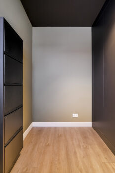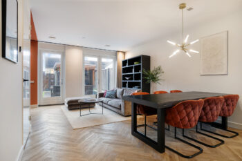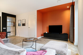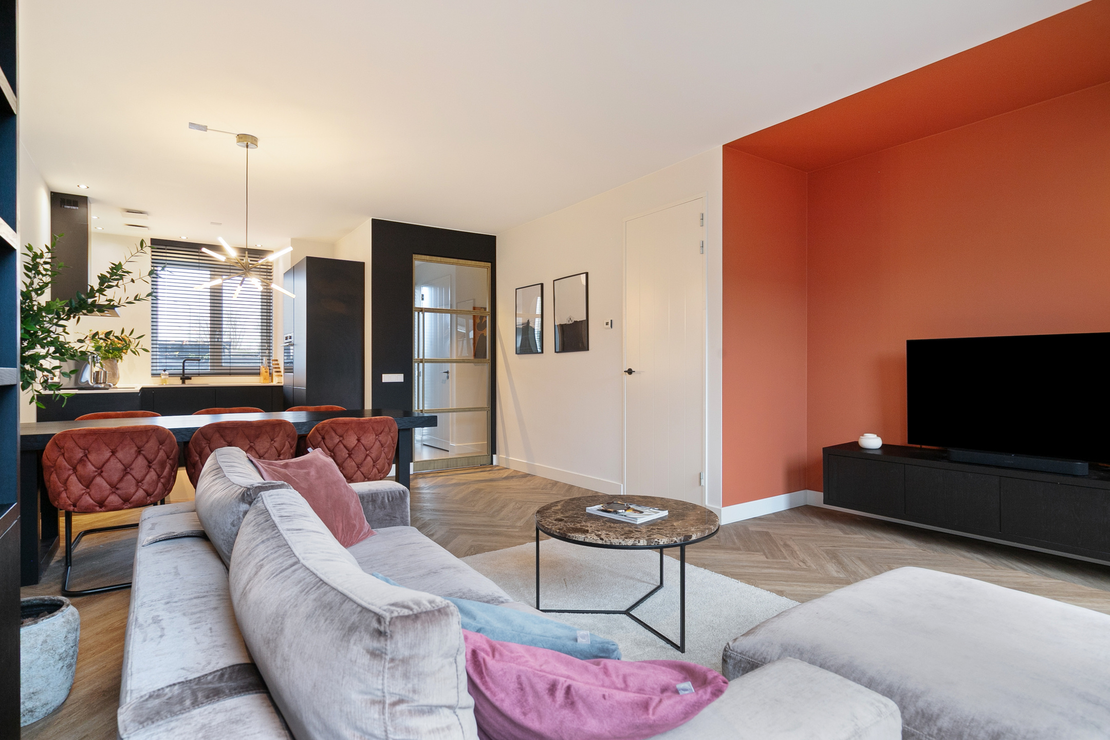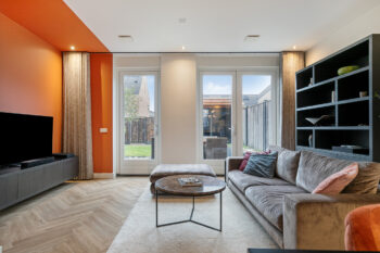 Via de grote stalen deur met glas betreedt u de fraai afgewerkte woonkamer. Direct valt de hoogwaardige afwerking op, met een stijlvolle PVC-visgraatvloer en strak gestucte wanden en plafonds, voorzien van ingebouwde spots.