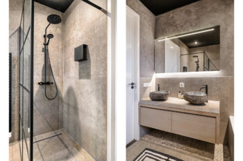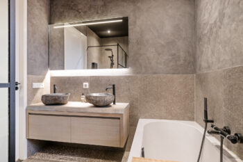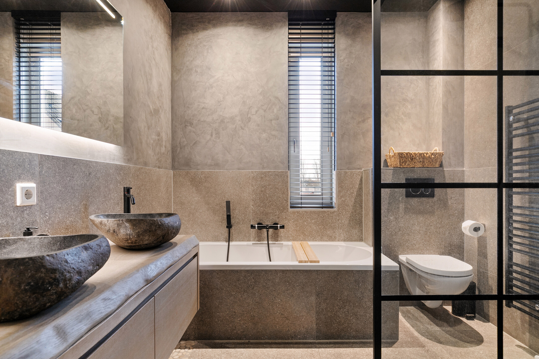 De luxe ingerichte badkamer is een echte eyecatcher en een prettige plek om te ontspannen. Het prachtige tegelwerk in combinatie met het hoogwaardige sanitair geeft de ruimte een stijlvolle en verzorgde uitstraling. De badkamer is voorzien van een ruime inloopdouche met stalen en glazen scheidingswand, een ligbad, een dubbele wastafel met een elegant meubel eronder, een toilet en een designradiator. Het raampje zorgt voor aangenaam daglicht en extra ventilatie, terwijl de inbouwspots de ruimte compleet maken en voor een sfeervolle verlichting zorgen.