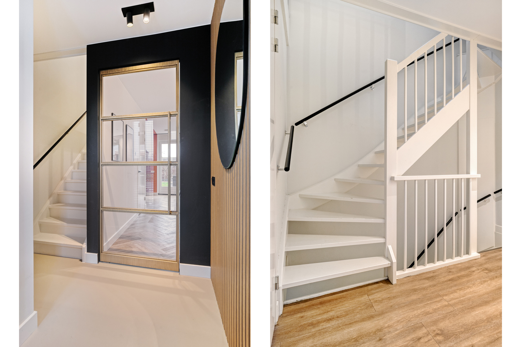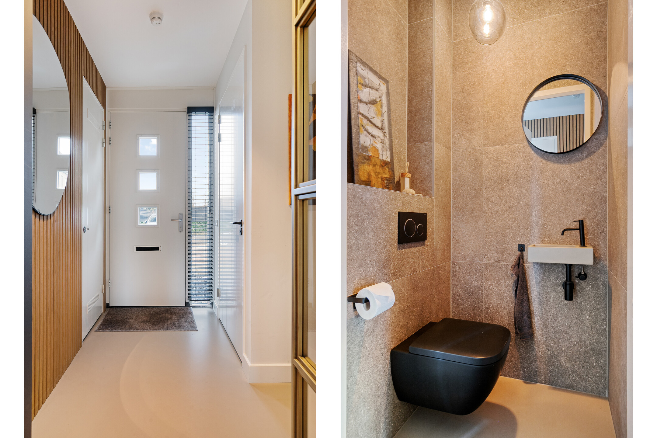 Bij binnenkomst wordt u verwelkomd in een verrassend ruime en stijlvol afgewerkte hal. Vanuit hier heeft u toegang tot de woonkamer, de moderne en uitgebreide meterkast en het gastentoilet. De toiletruimte is eigentijds uitgevoerd, voorzien van plafondhoge betegeling, een fonteintje en een charmant nisje. De hal is, net als het toilet, voorzien van een prachtige gietvloer.