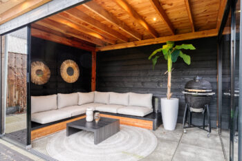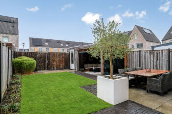 In de tuin bevindt zich een stijlvolle houten overkapping, de ideale plek om het hele jaar door van het buitenleven te genieten. De overkapping is volledig afsluitbaar dankzij een stalen en glazen schuifconstructie, waardoor u zowel in de zomer als in de winter comfortabel kunt vertoeven in de loungeset. Bovendien is er sfeervolle verlichting aanwezig, waardoor de overkapping ook ’s avonds een prachtig geheel vormt. Naast de overkapping bevindt zich een praktisch schuurtje, direct aangebouwd en ideaal voor het opbergen van tuingereedschap en andere buitenspullen. Het schuurtje is voorzien van elektra, waardoor het ook geschikt is voor een extra koelkast of vriezer – perfect voor wie veel tijd in de overkapping doorbrengt en alles binnen handbereik wil hebben.