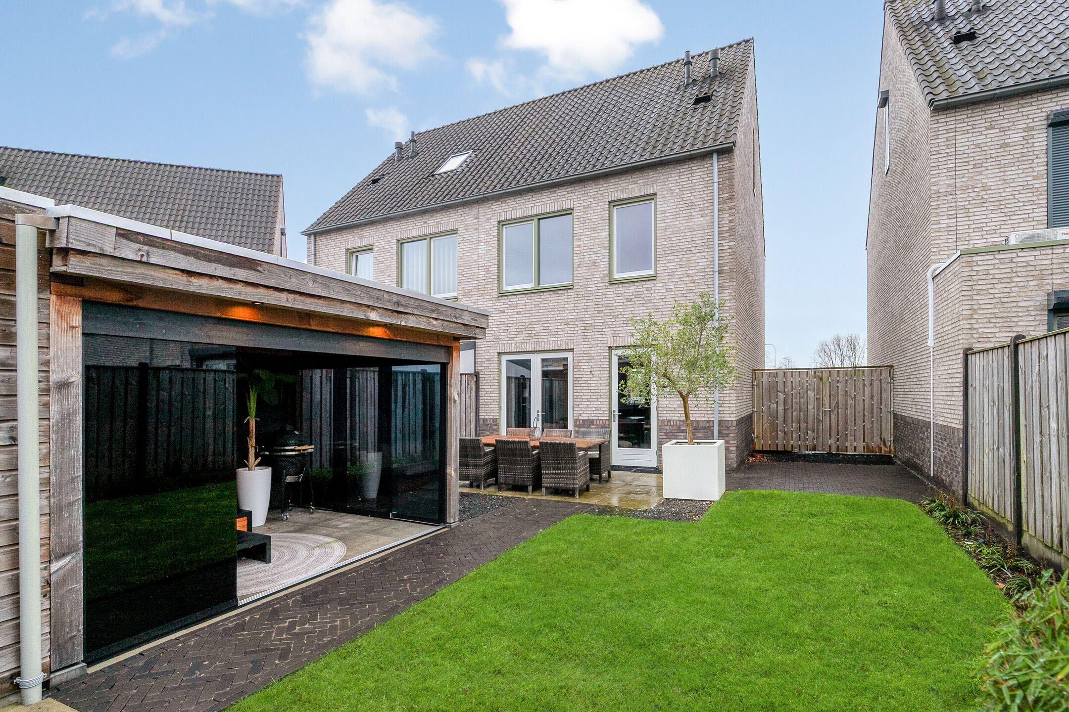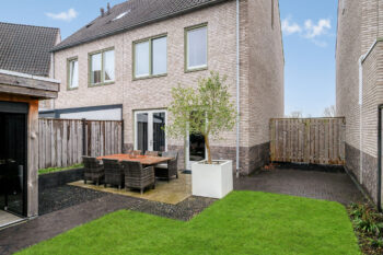 Direct tegen de woning is een terras gerealiseerd, waar eenvoudig een tuintafel met stoelen geplaatst kan worden. Praktisch zijn de twee ingangen achterom, zowel aan de zijkant van de woning als aan de achterzijde van het perceel. De doorgang aan de zijkant is extra ruim en volledig open te slaan, ideaal voor het achterom rijden van een groter voertuig of een aanhanger.