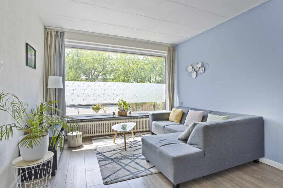 De woonkamer kijkt aan de voorkant uit over het plantsoen en speelveld. Het is heel ruimtelijk vanwege de open verbinding met de keuken en de grote uitbouw. Een mooie, lichte kamer waarvan de lange muur opnieuw is gestuct. De uitbouw over de volle breedte geeft je extra ruimte voor bijvoorbeeld een grote eethoek, werkruimte of nóg een zithoek.