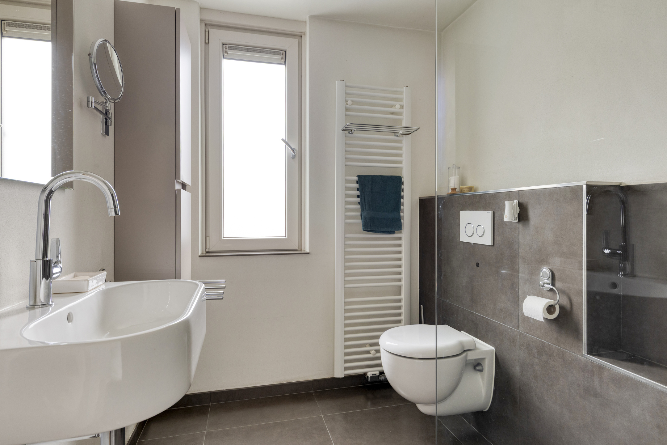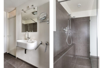 Aan de achterzijde van de eerste verdieping bevindt zich de badkamer. Deze badkamer is modern, voorzien van strak tegelwerk, vloerverwarming en zeer goed onderhouden! Aan sanitair treffen we een wandcloset, inloopdouche en wastafel.