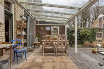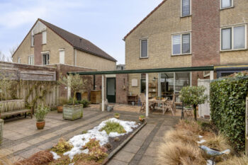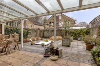 Vanuit de eetruimte in de woonkamer krijgt u via de schuifpui toegang tot de diepe en brede achtertuin. Deze woning wordt gekenmerkt door zijn fijne tuin, voorzien van een grote over de volledige breedte uitgevoerde terrasoverkapping met uitzicht over de gehele achtertuin. Deze tuin beschikt over diverse plantenborders, fraai straatwerk en een mooie omheining welke privacy biedt.