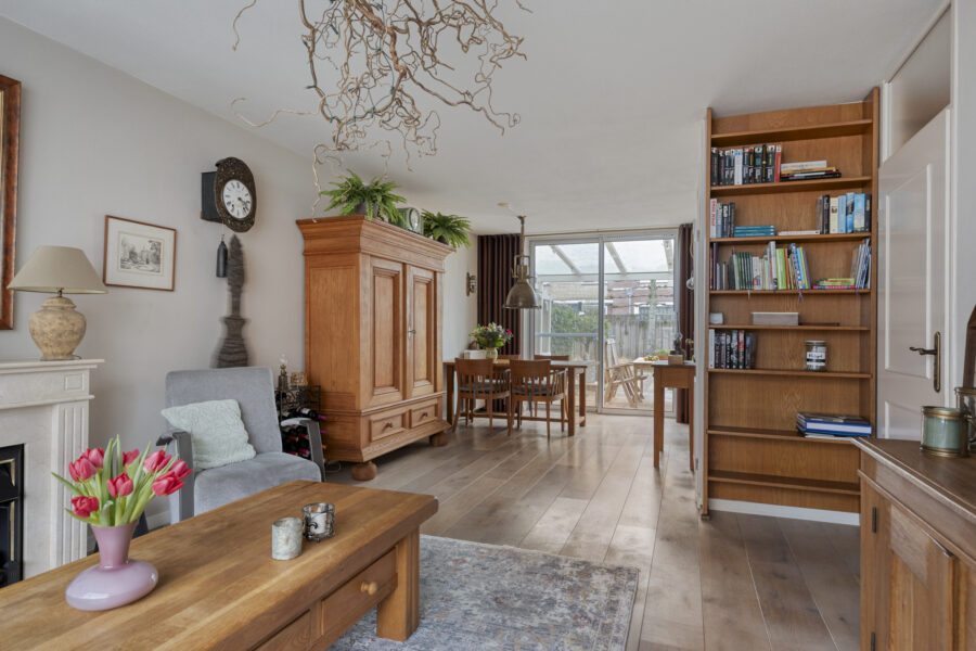Bij binnenkomst in de woonkamer ervaart u direct het fraaie natuurlijke daglichtinval dankzij de aanwezige van de grote raamkozijnen en de aluminium schuifpui. Het prachtige lichtinval tezamen met de ruime opzet verzorgen prettige indelings- en gebruiksmogelijkheden in deze fijne woonkamer. Voor wat betreft afwerking beschikt deze woonkamer over strak stucwerk en een eiken lamelparketvloer. De voorzijde van de woonkamer is ingericht als zithoek en aan de achterzijde bevindt zich de eetruimte welke in open verbinding staat met de keuken. Tussen de zit- en eetruimte