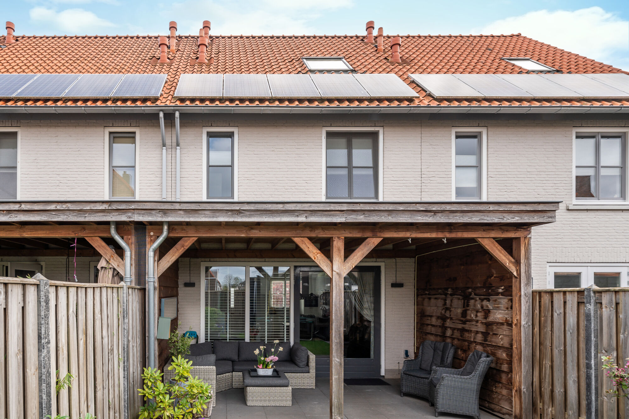 De tuin is prettig van formaat en gunstig gelegen op het westen, waardoor u hier volop kunt genieten van de middag- en avondzon. Via de openslaande tuindeuren in de woonkamer bereikt u direct de sfeervolle, hoogwaardige houten overkapping. Hier is een royaal terras gerealiseerd met voldoende ruimte voor een grote loungeset — ideaal voor lange, gezellige avonden.