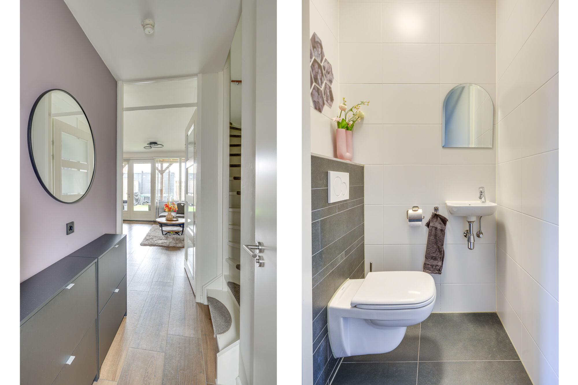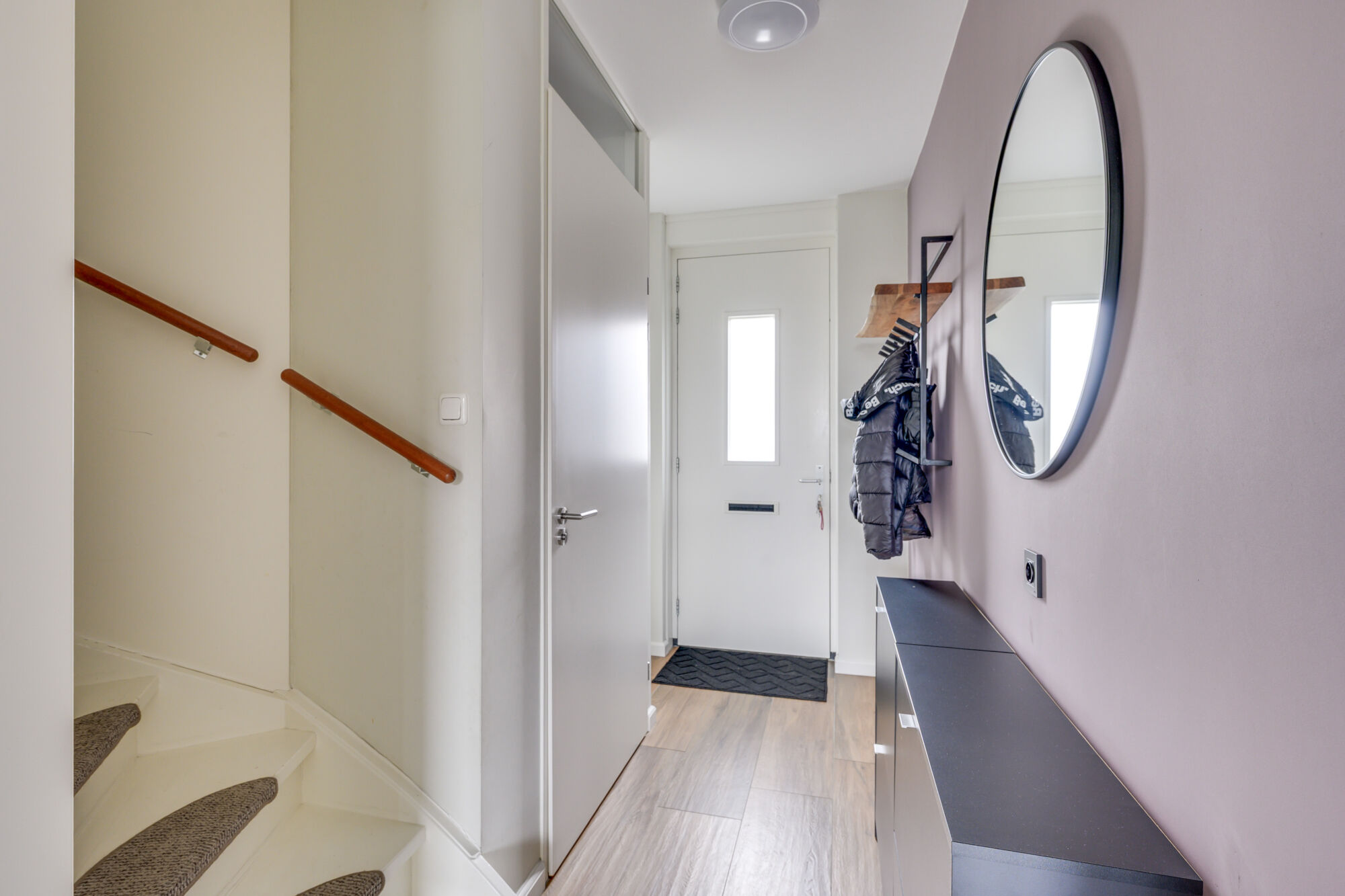 Via de voordeur betreedt u de woning en komt u in de verzorgde entreehal. De hal is modern afgewerkt met glad gestucte wanden en plafonds. Hier bevinden zich de meterkast en het moderne gastentoilet, voorzien van een fonteintje.