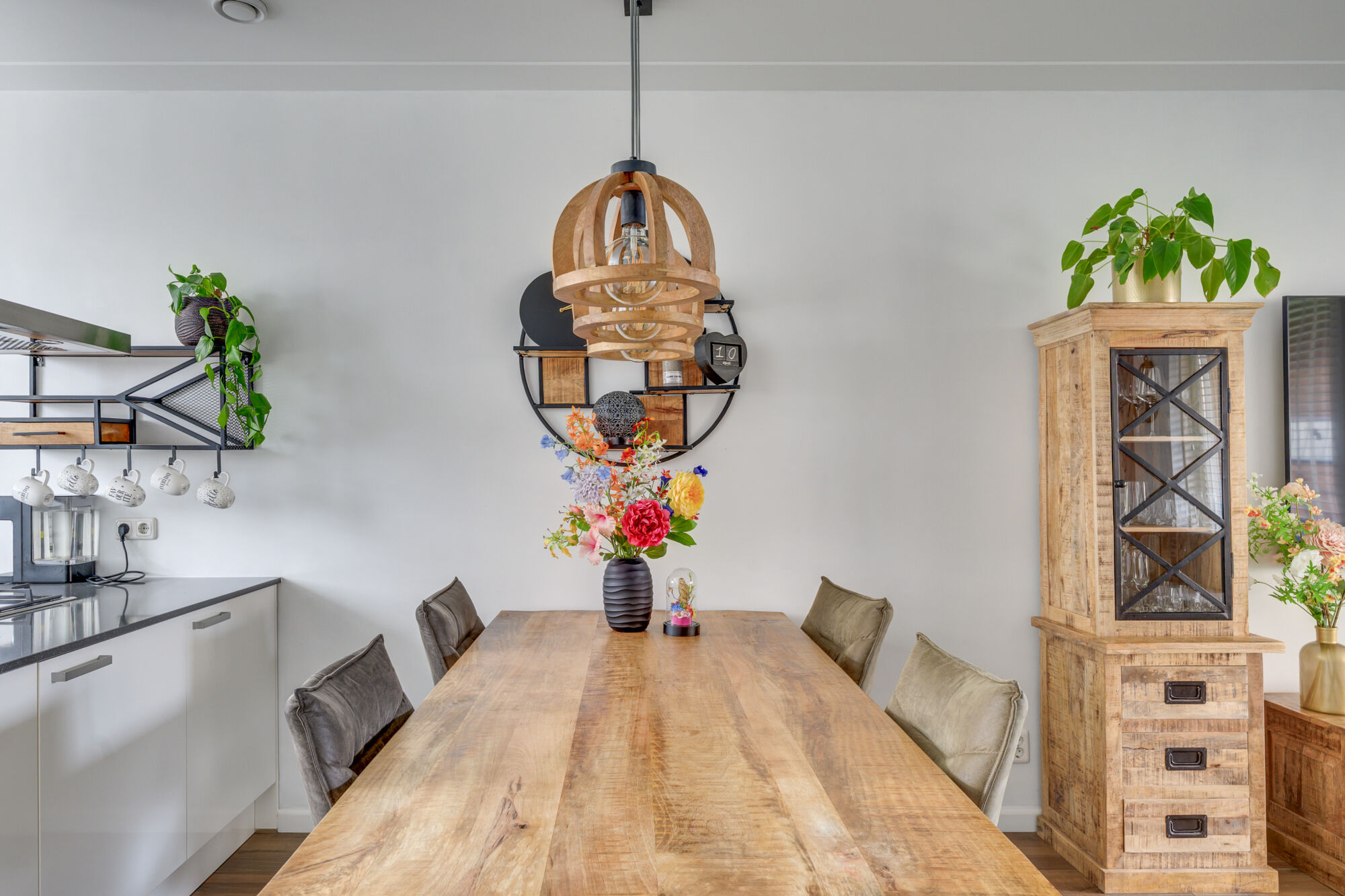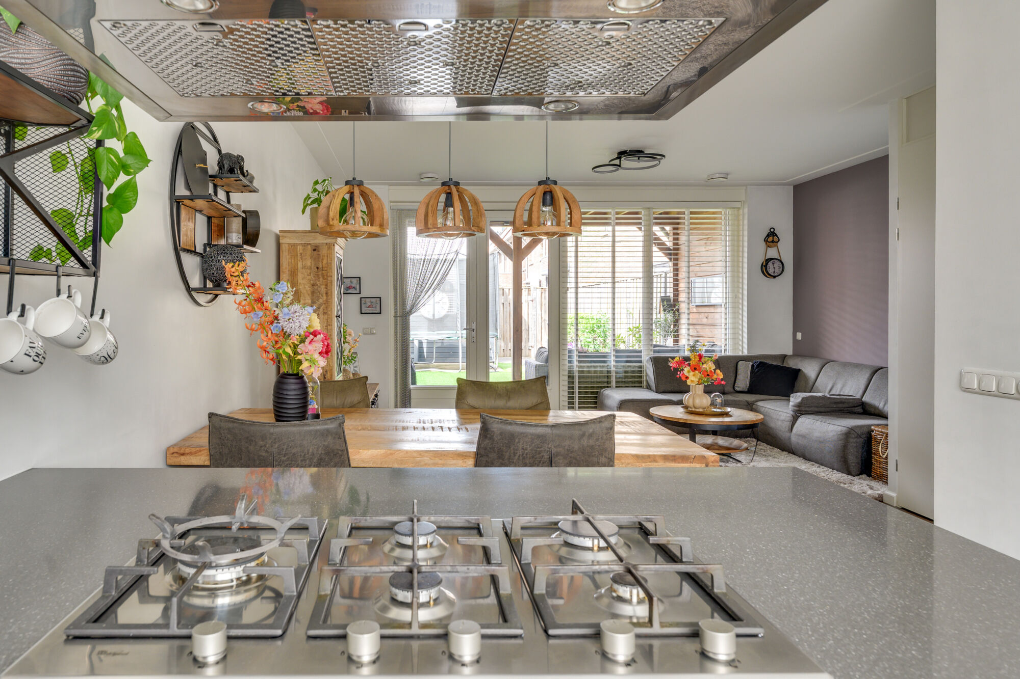 De keuken is compleet uitgerust met diverse inbouwapparatuur, waaronder een 5-pits gaskookplaat, afzuigkap, combi-oven, vaatwasser, koelkast en een spoelbak. Vanuit het raampartij heeft u een prettig uitzicht op de voorzijde van de woning — ideaal om een oogje in het zeil te houden of om te zien wanneer gasten arriveren.