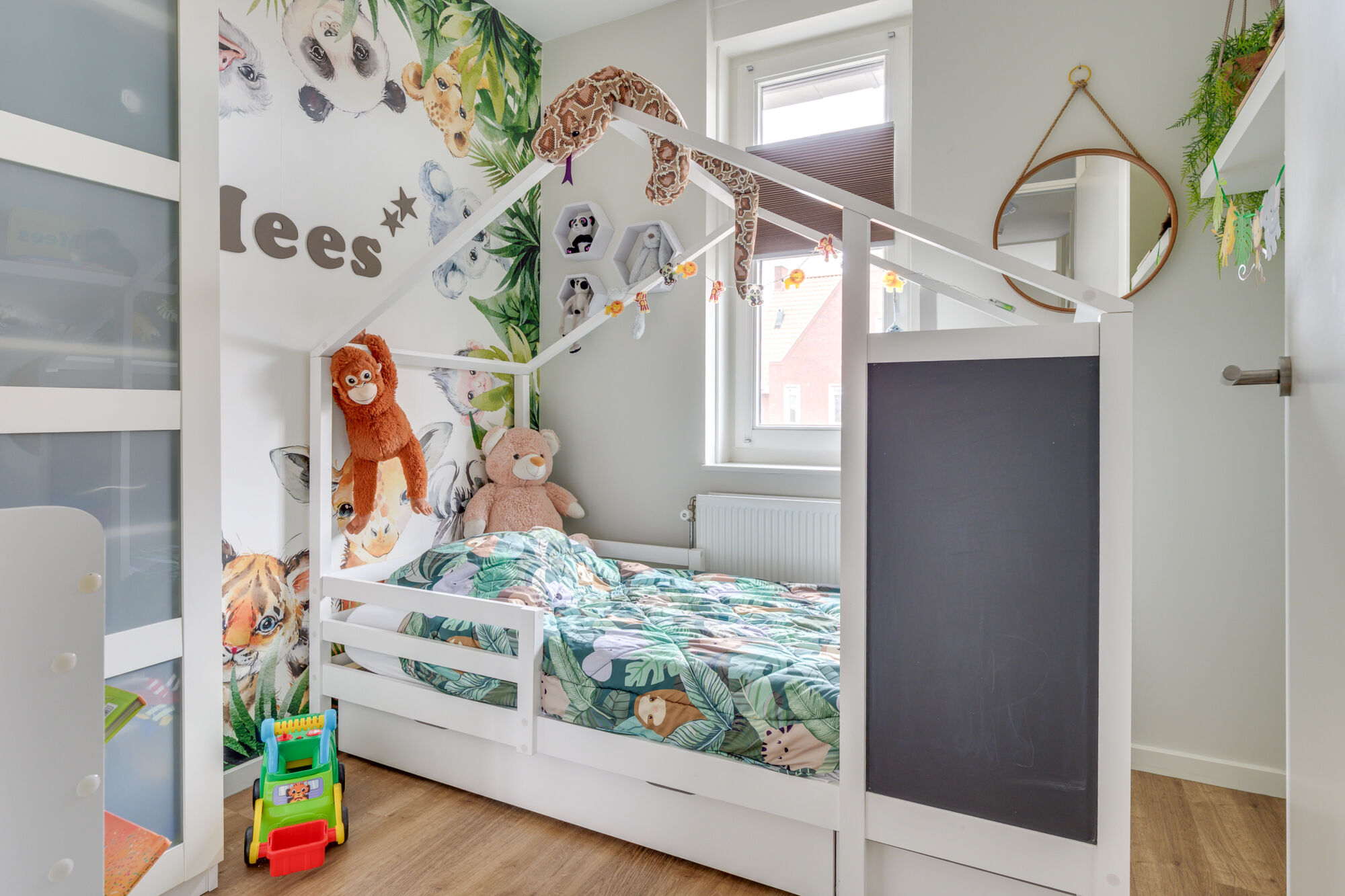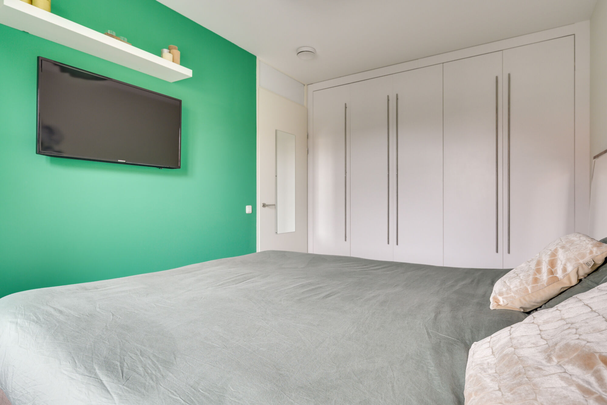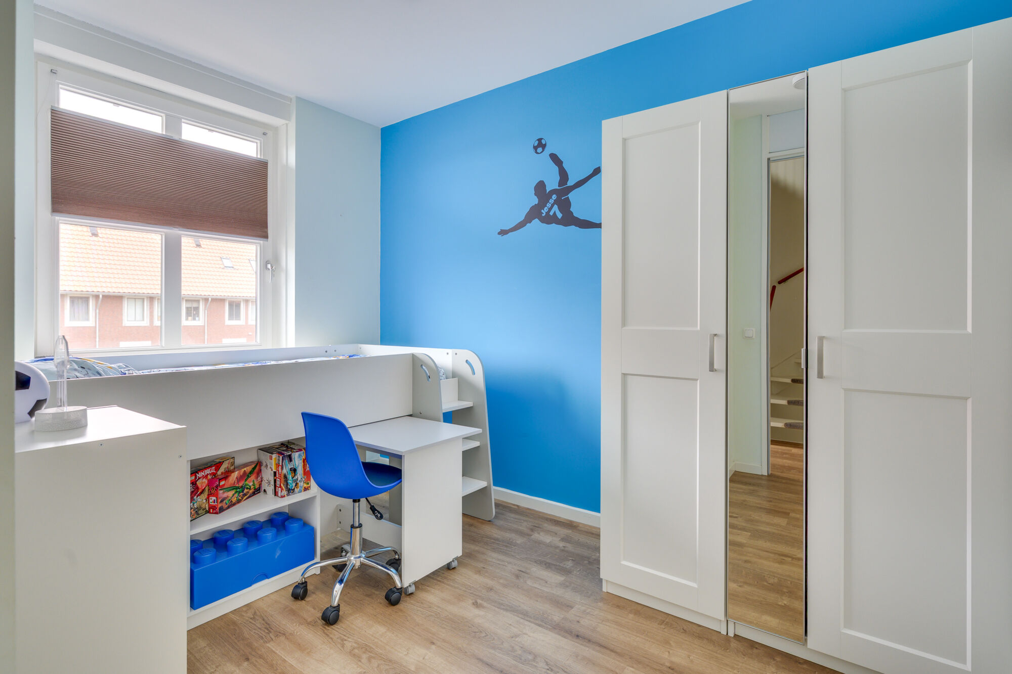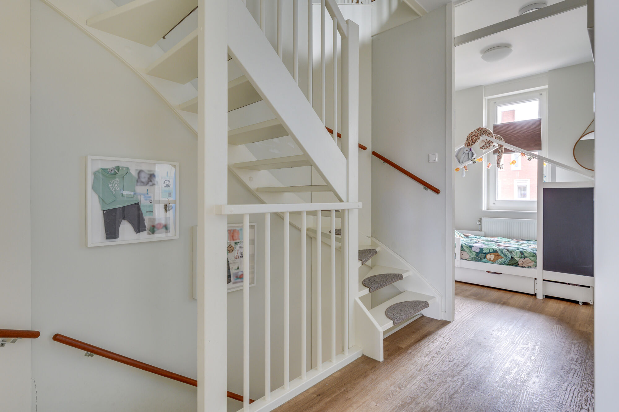 Daarnaast bevindt zich hier de vierde slaapkamer van de woning, met een oppervlakte van circa 19 m². Dankzij het grote dakraam, voorzien van een verduisterend doek, geniet deze kamer van veel natuurlijk daglicht.
