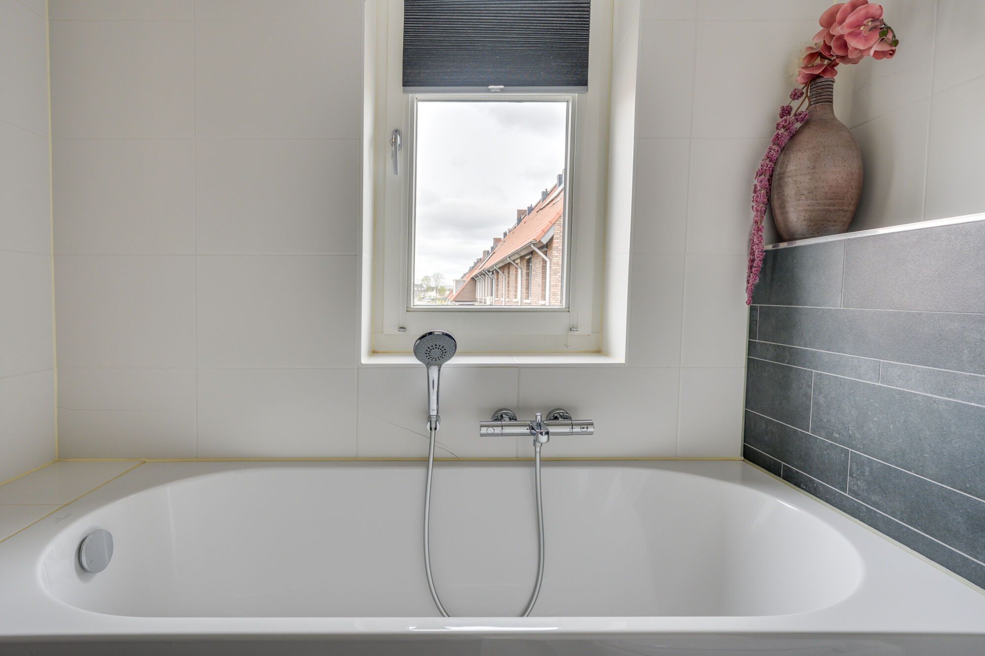 De badkamer is uitgevoerd in een neutrale en tijdloze kleurstelling, waarbij de combinatie van grijze en witte tegels zorgt voor een rustige en ontspannen sfeer. De ruimte is compleet ingericht en biedt alles voor optimaal comfort. Zo beschikt de badkamer over een ruime inloopdouche met scheidingswand en glazen deur, evenals een comfortabel ligbad.