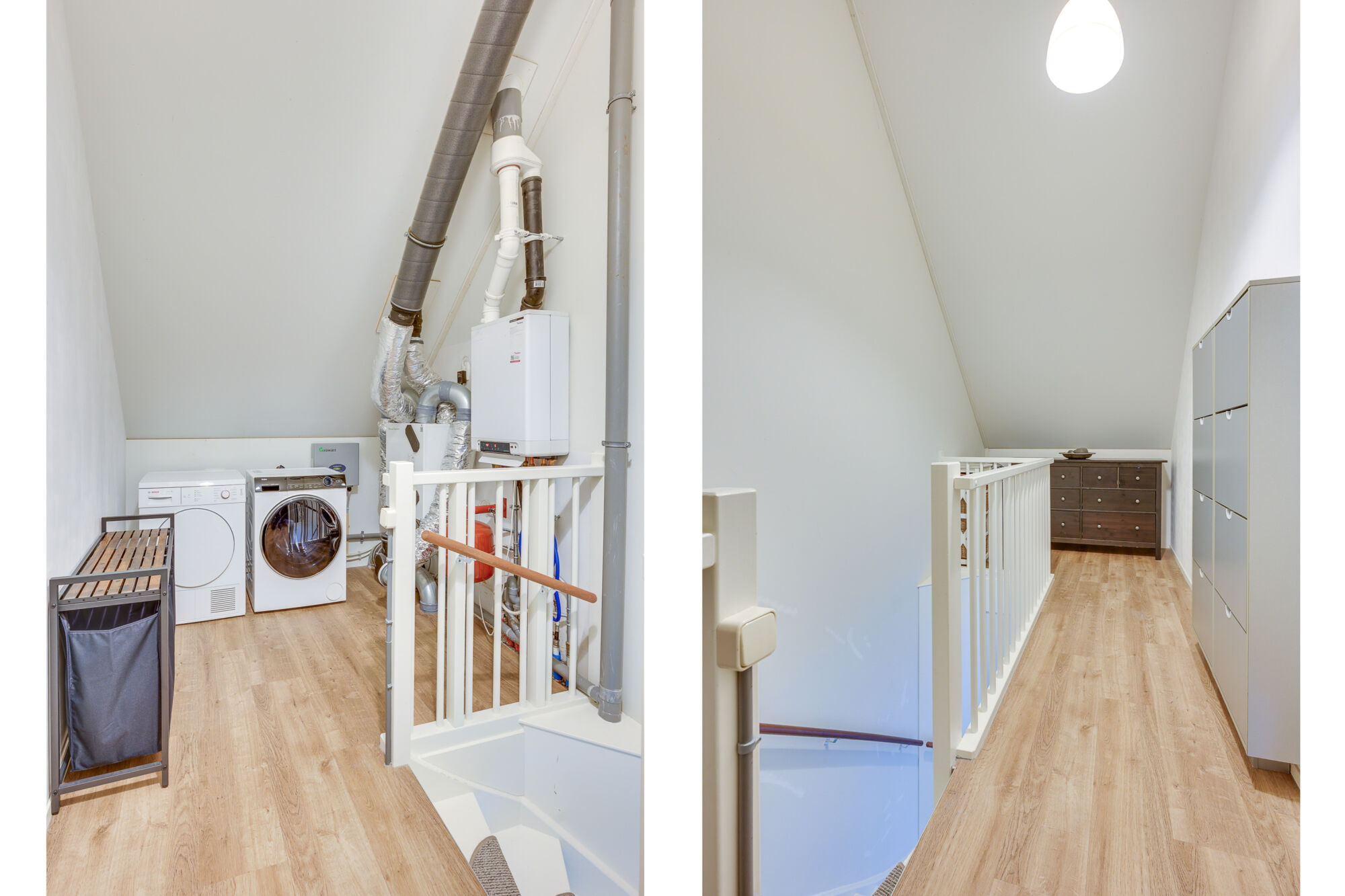 De tweede verdieping is bereikbaar via een vaste trap en biedt een ruime en praktische indeling. Hier treft u een royale voorzolder met aansluitingen voor de wasmachine en droger, evenals de opstelling van de technische installaties.