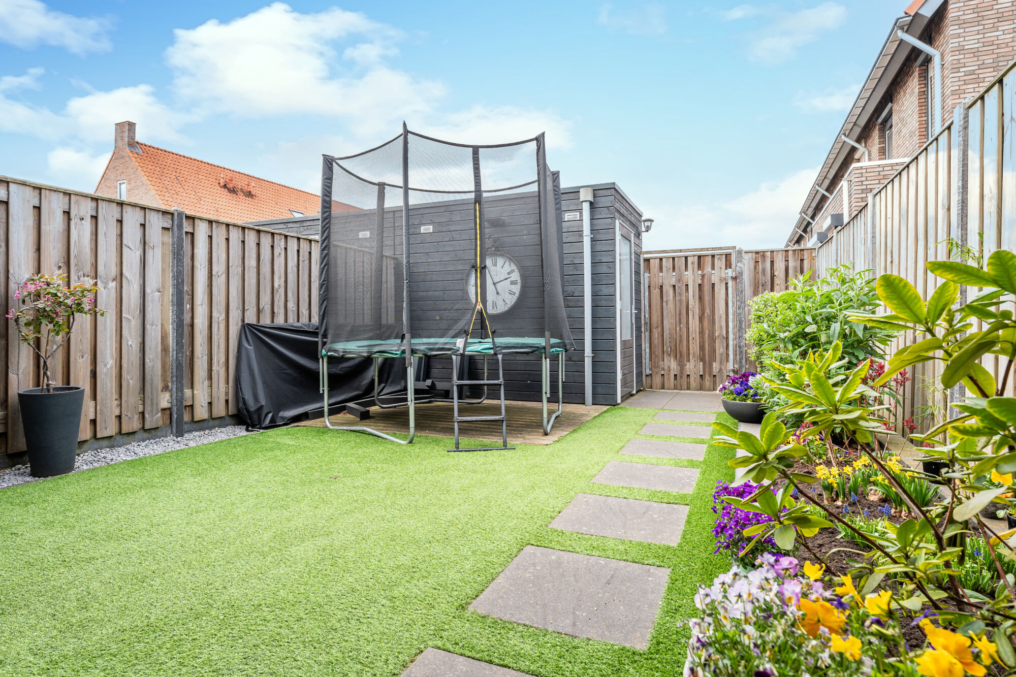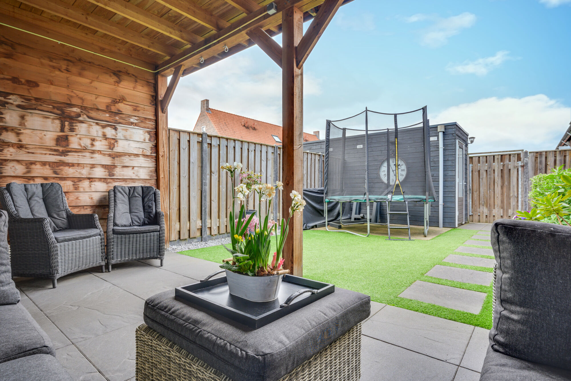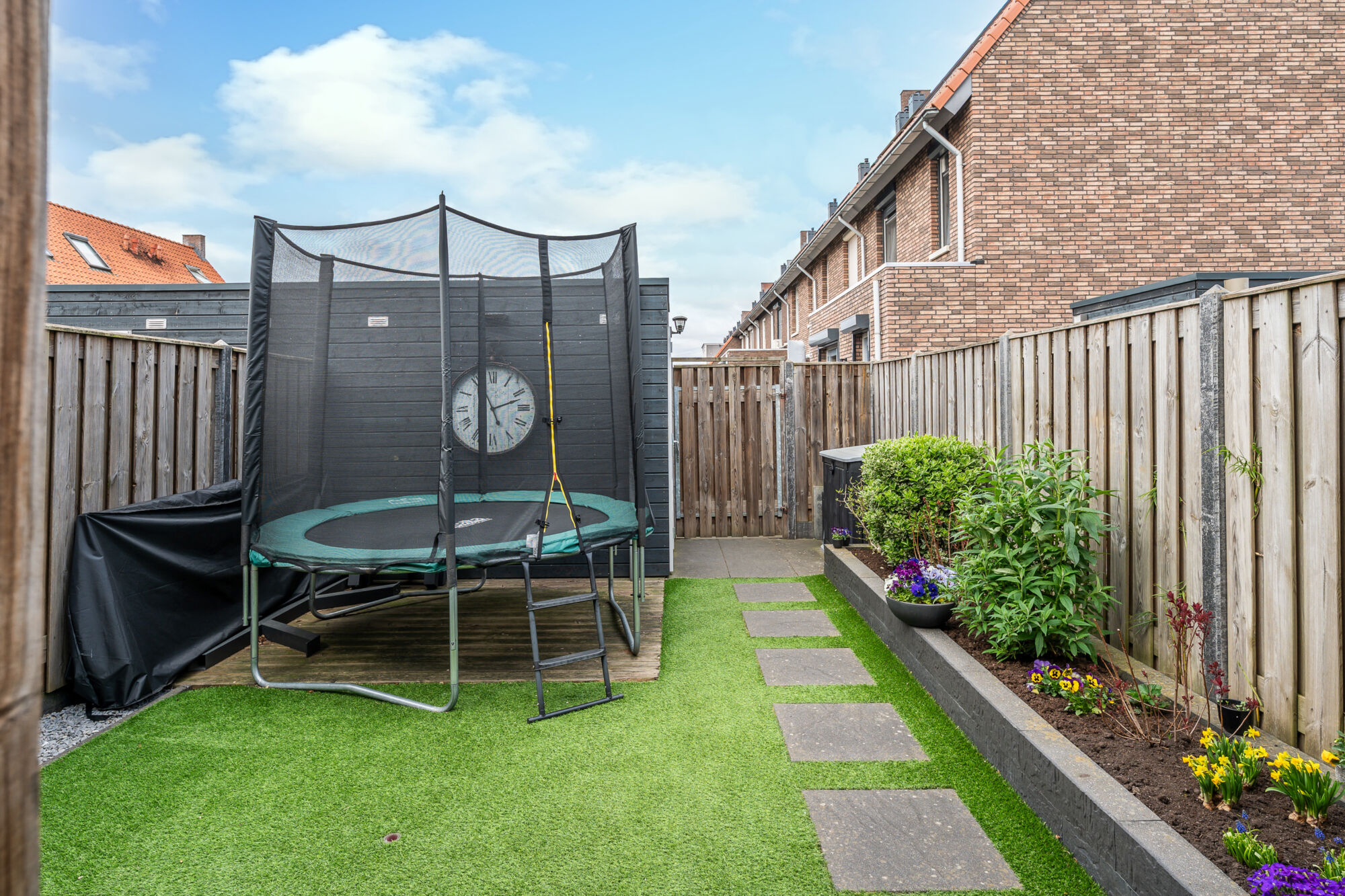 Daarnaast is er elektra aanwezig, wat het eenvoudig maakt om bijvoorbeeld een buitenkeuken of terrasverwarming te plaatsen. De tuin is verder onderhoudsvriendelijk aangelegd met kunstgras, borders en bestrating, wat zorgt voor een moderne en verzorgde uitstraling. Tot slot beschikt de tuin over een praktische achterom via een houten poort.