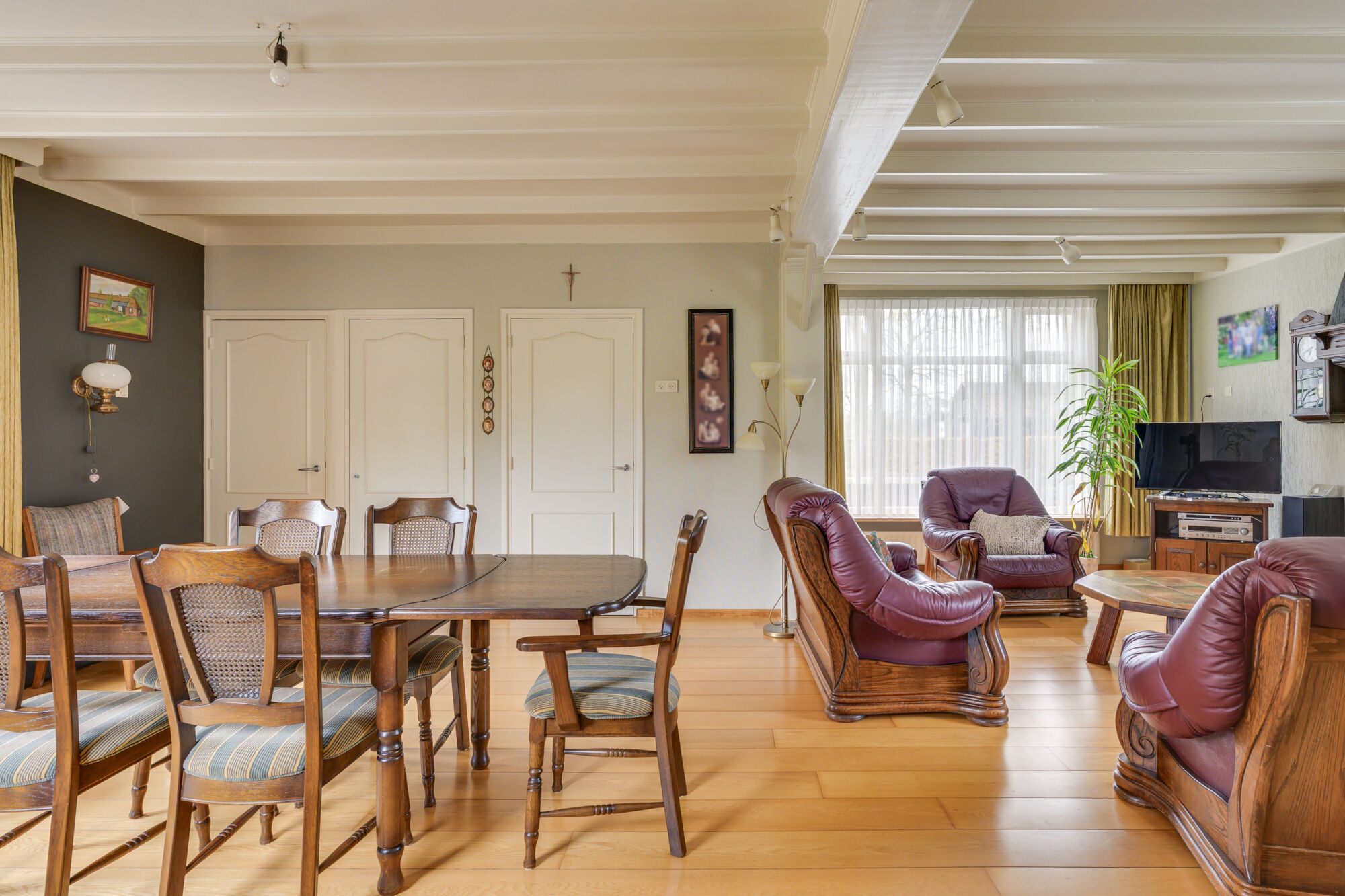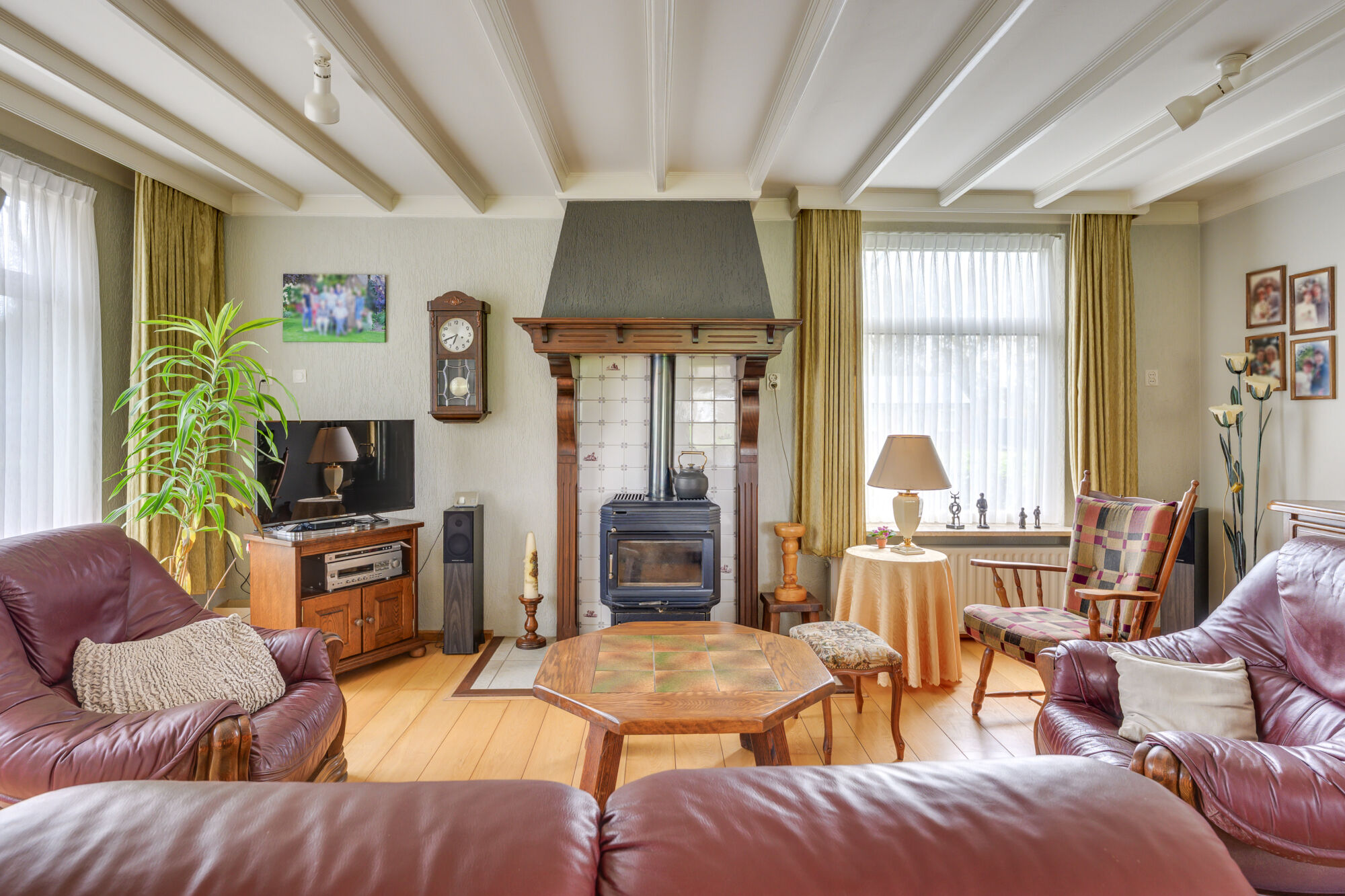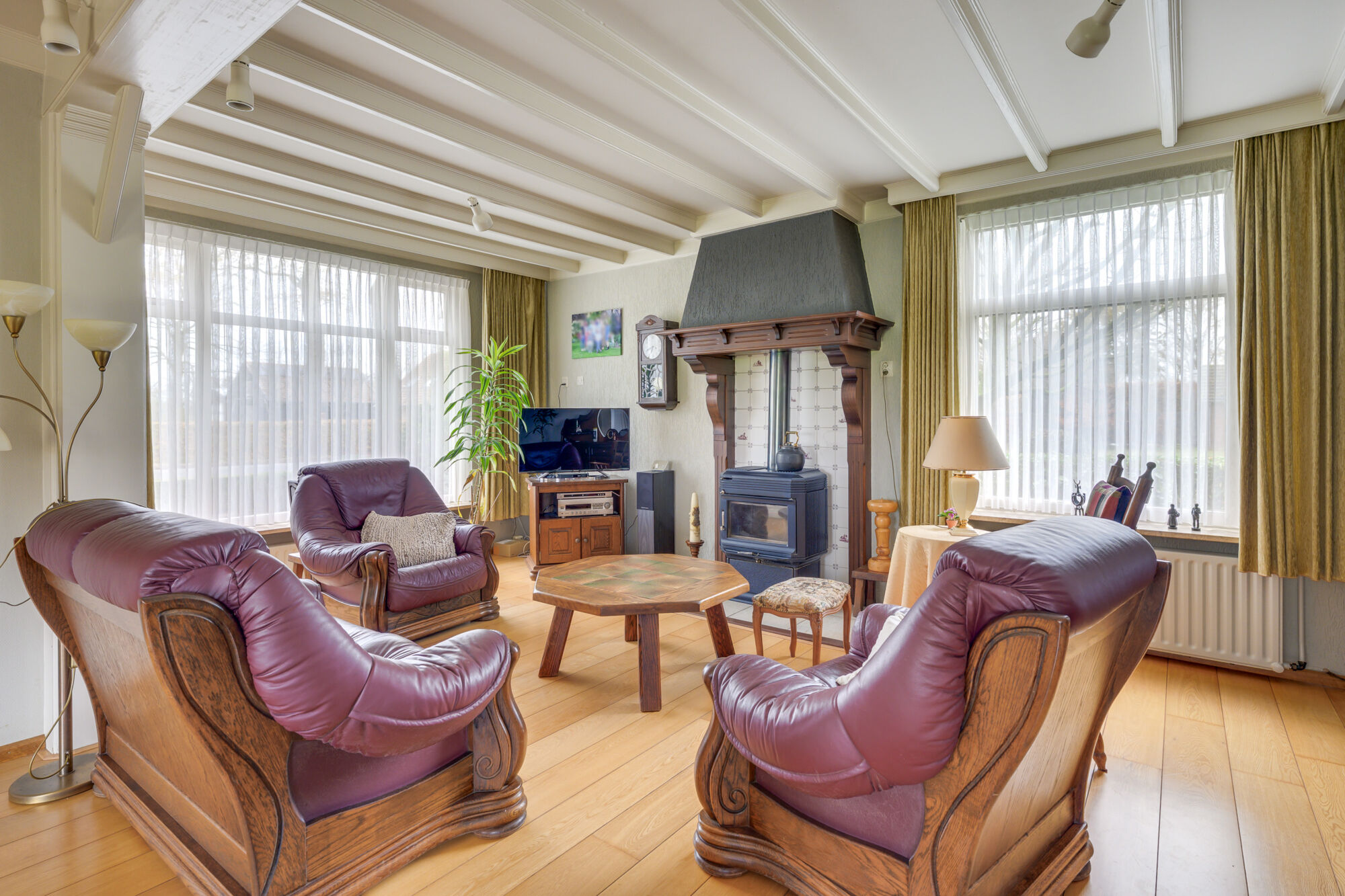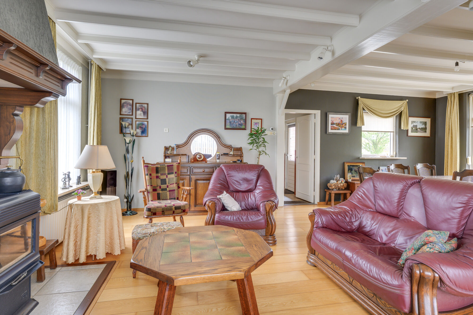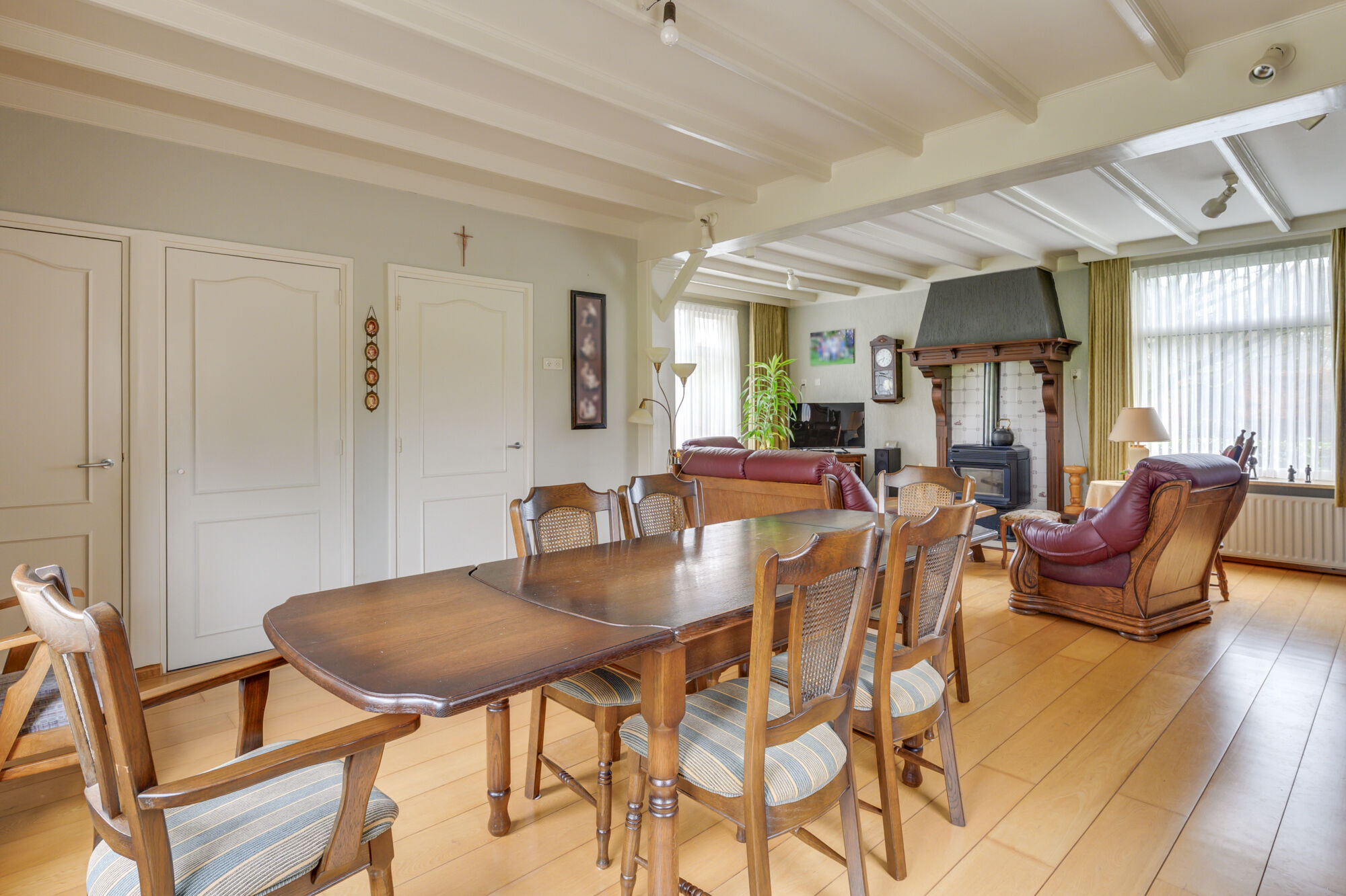 Deze gezellig living kent daarnaast ook nog eens opvallend veel lichtinval door de ramen rondom. De vloer is belegd met fraaie houtendelen. U kunt hier zowel een royale zithoek als eethoek opstellen waarbij de kachel in de zithoek voor extra gezelligheid zorgt! In de hoek waar de eettafel staat is een deur naar keldertje. Via 3 treden naar beneden bereikt u de droge kelder.