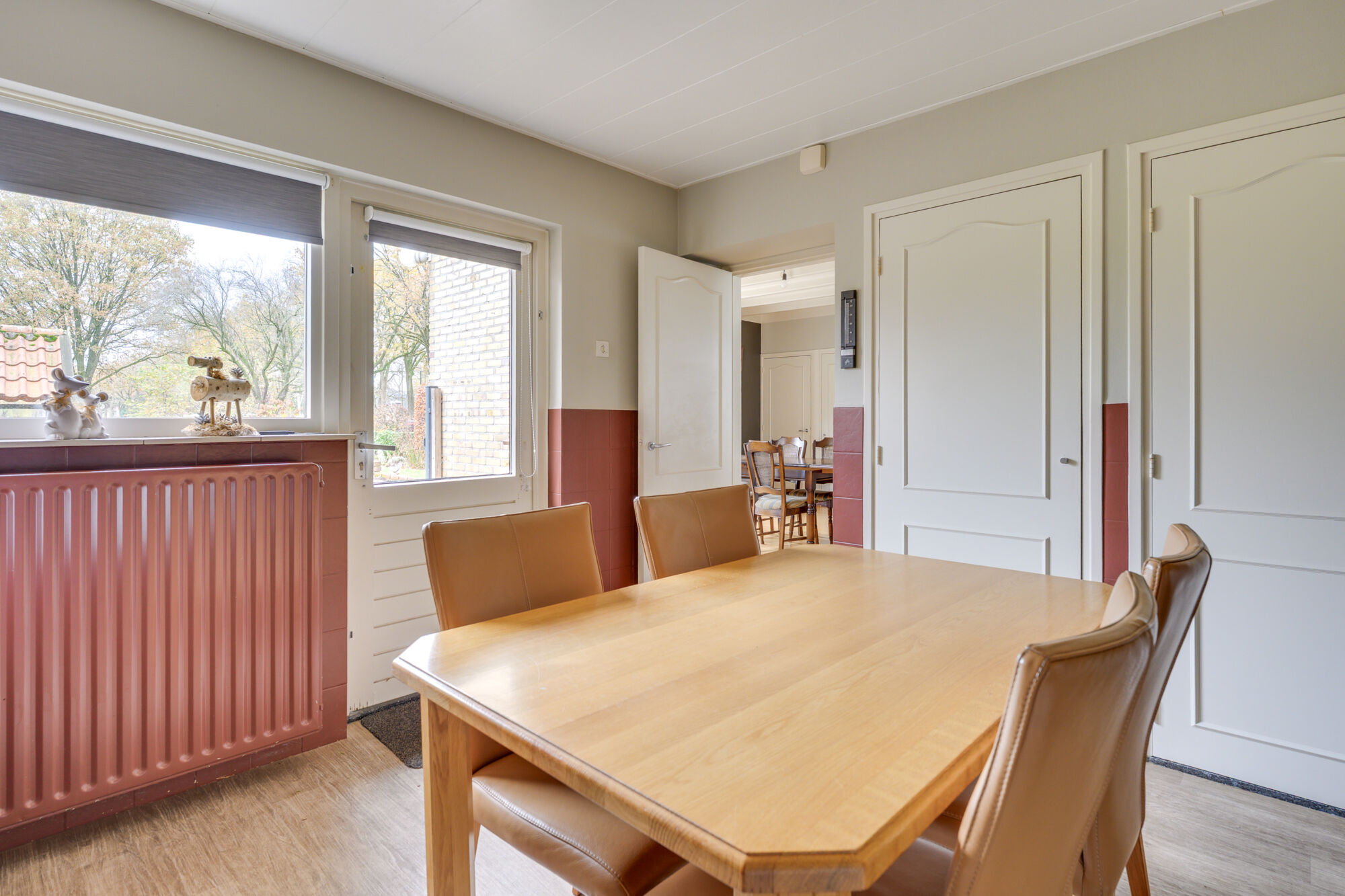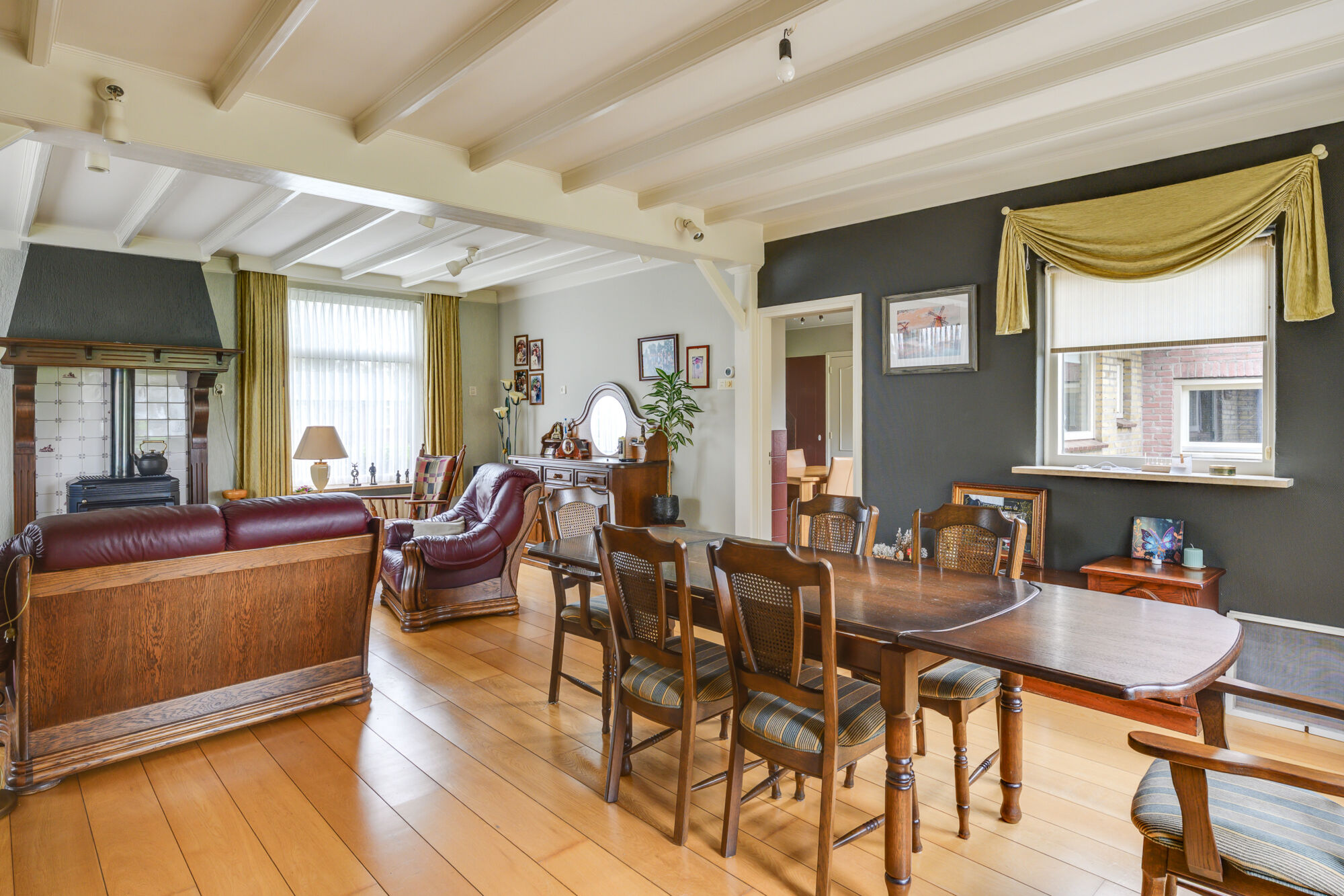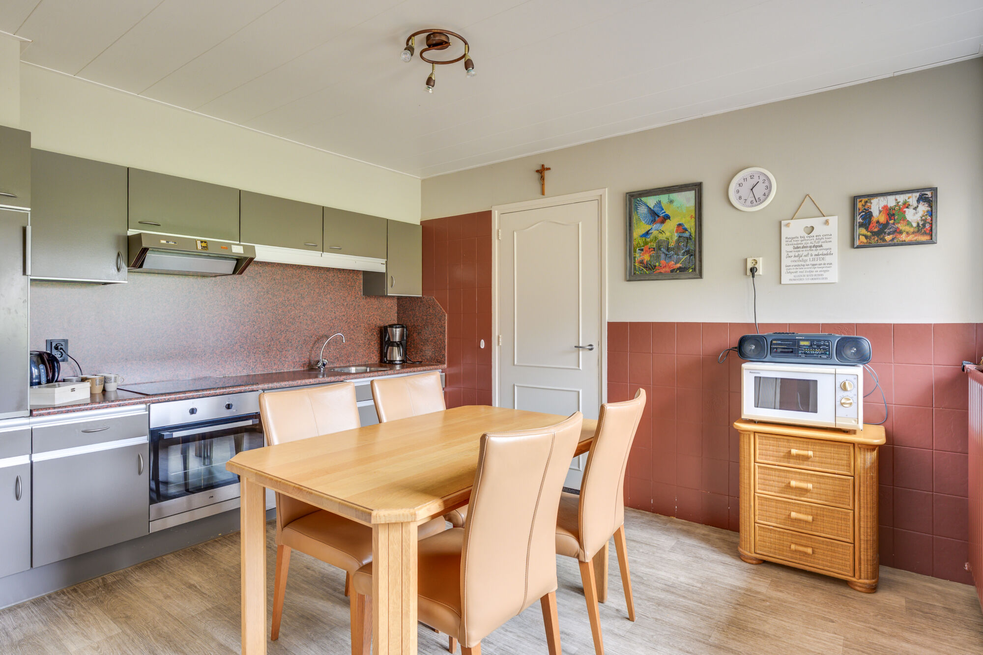 Aansluitend komt u in de eetkeuken, waar voldoende ruimte is om een eettafel te plaatsen, zoals zichtbaar op de foto’s. De keukeninrichting (2000) is uitgevoerd in een praktische wandopstelling en uitgerust met grotendeels in 2021 vernieuwde inbouwapparatuur, waaronder een inductiekookplaat, oven, vaatwasser, koelkast en afzuigkap.