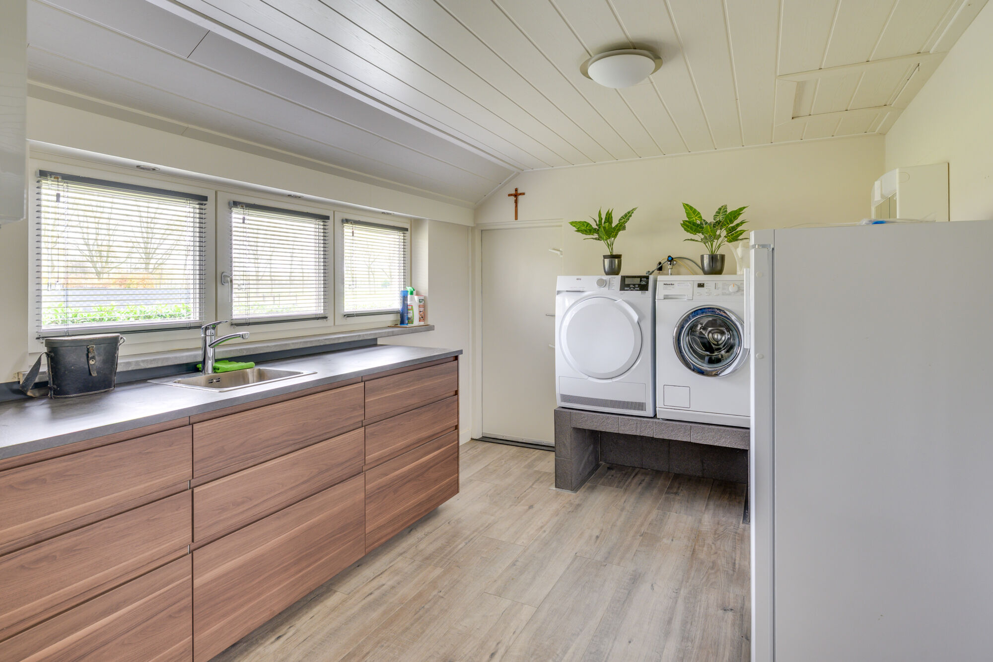 Aansluitend bevindt zich de doucheruimte met inloopdouche en de toiletruimte. Dit gedeelte van de woning, samen met de aansluitende tweede keuken/bijkeuken en slaapkamer, is in 2018 gerealiseerd. Deze fijne ruimte beschikt over een tweede keukenblok en biedt tevens de mogelijkheid om de was te doen. Hier hangt ook de HR-combiketel, die in 2022 is vernieuwd.