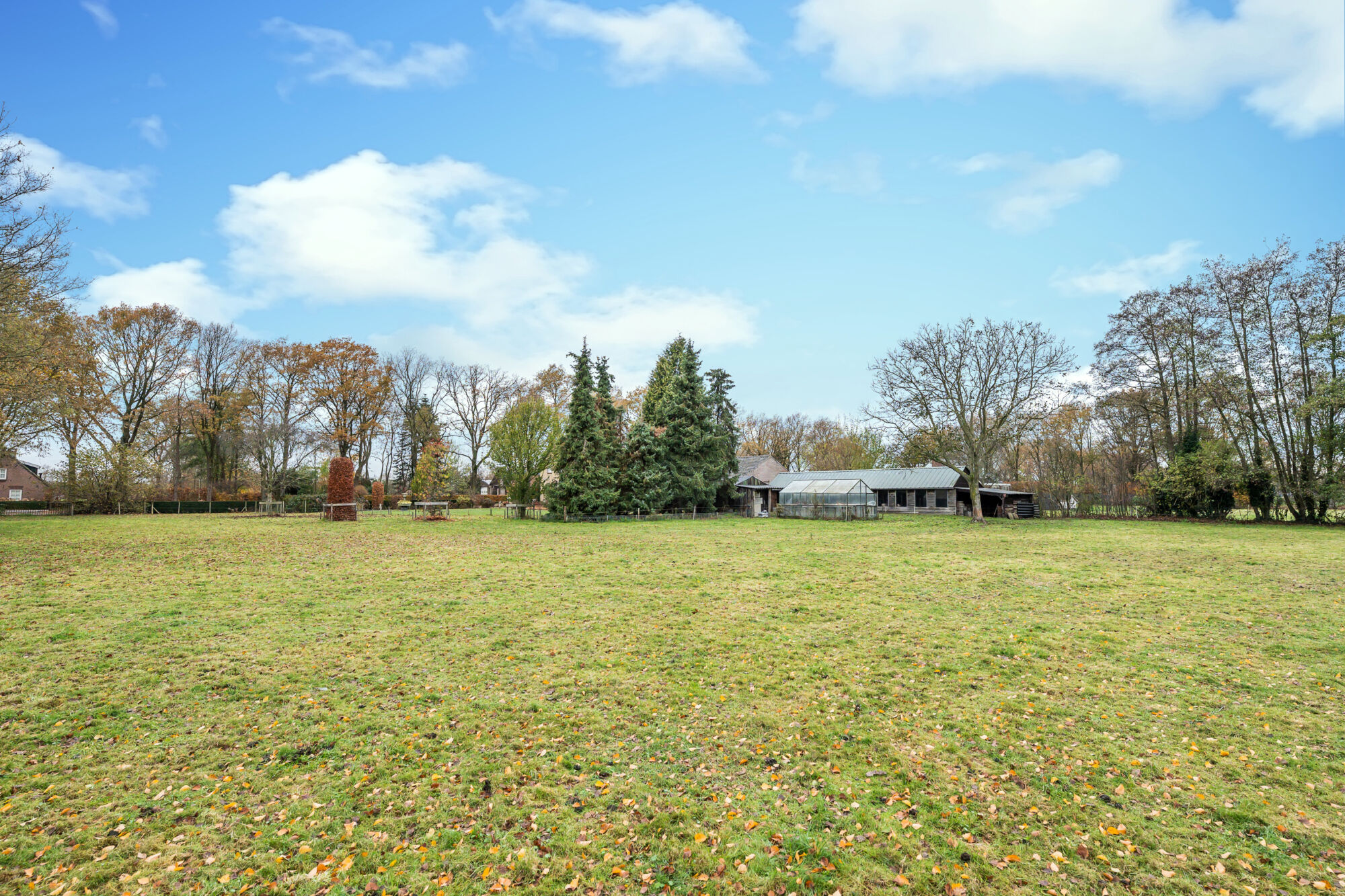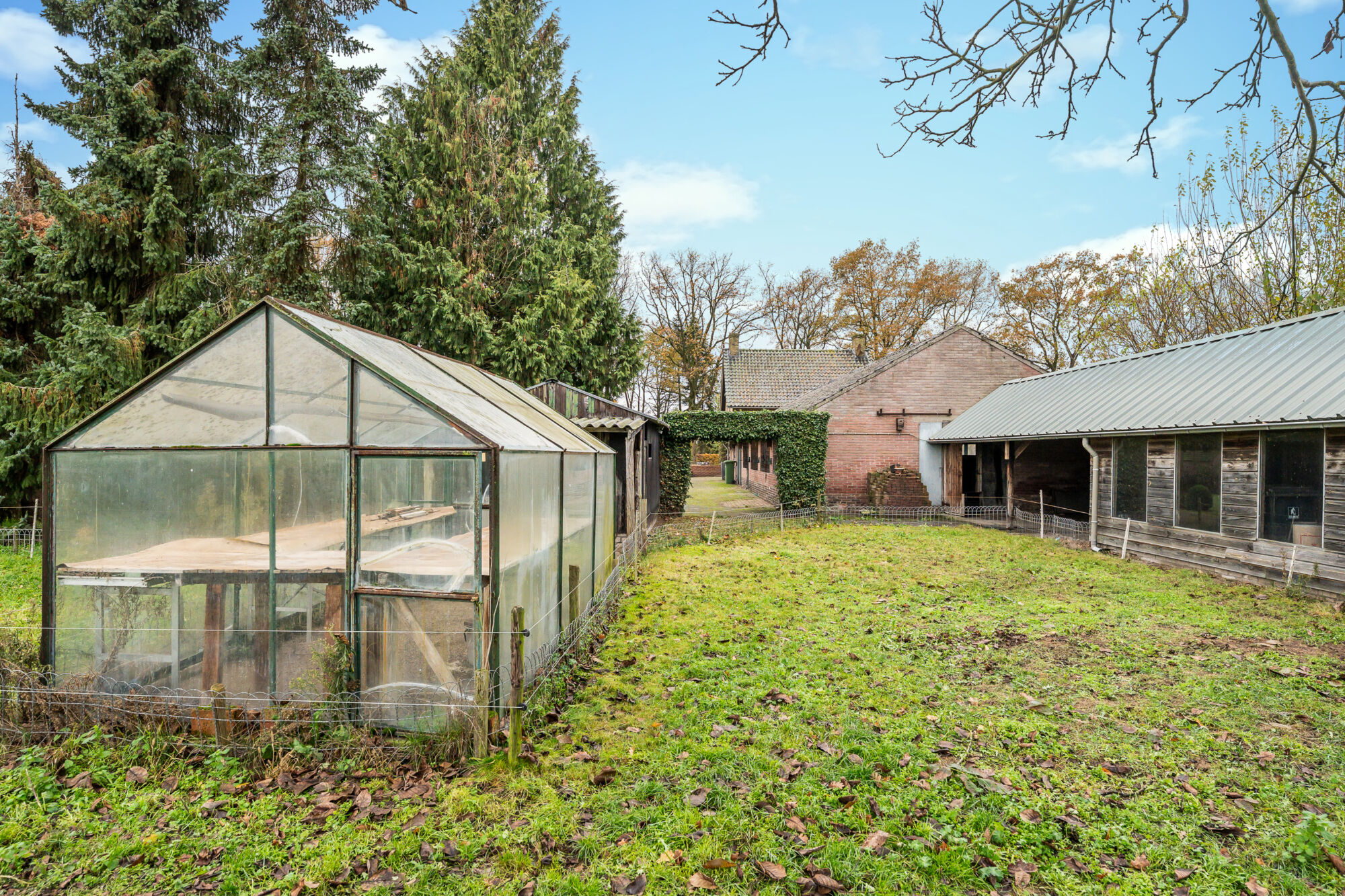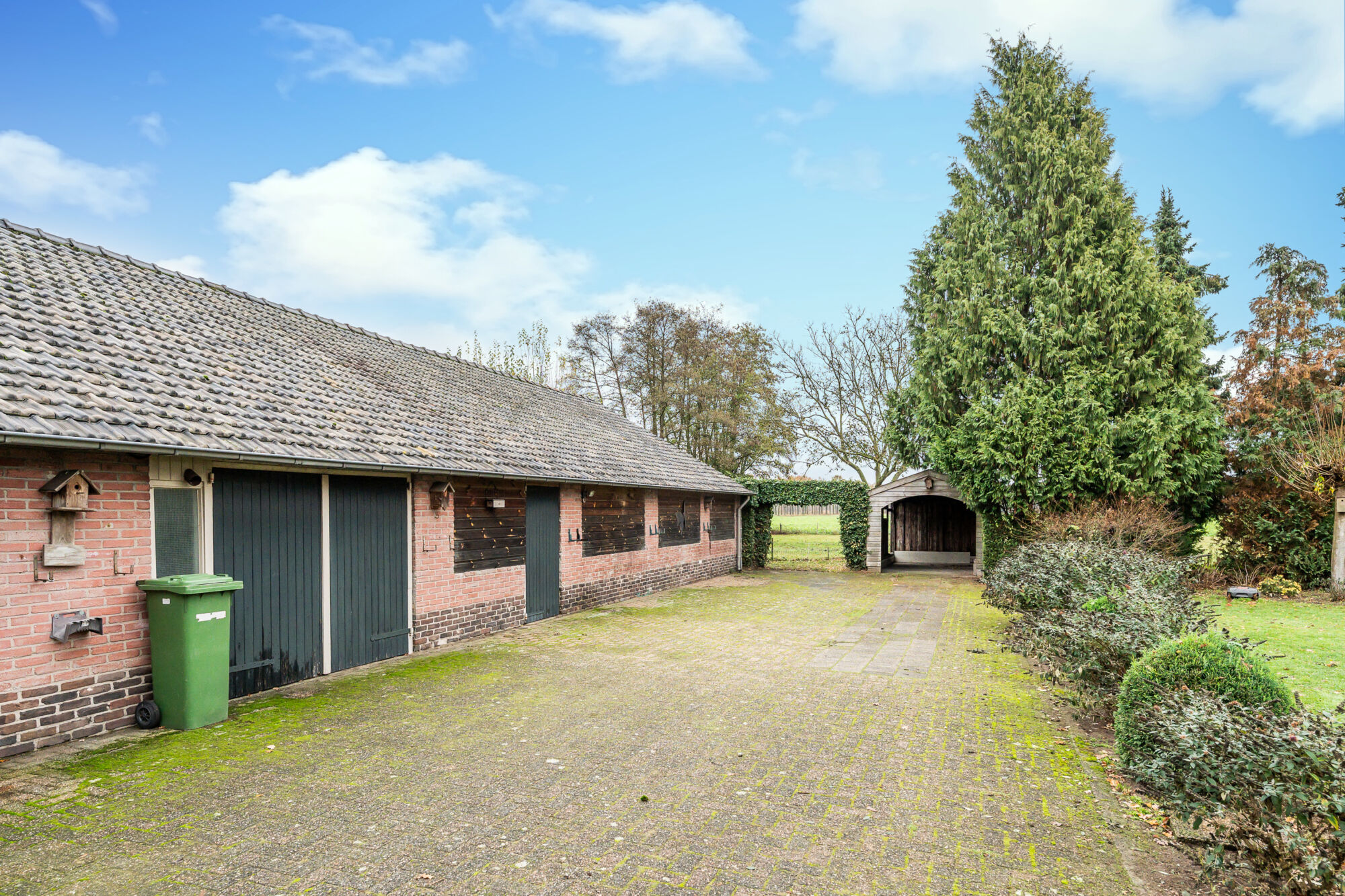 Achteraan de oprit bevinden zich nog een carport en een kas. In het veld is de afbakening van het perceel duidelijk zichtbaar door middel van paaltjes.