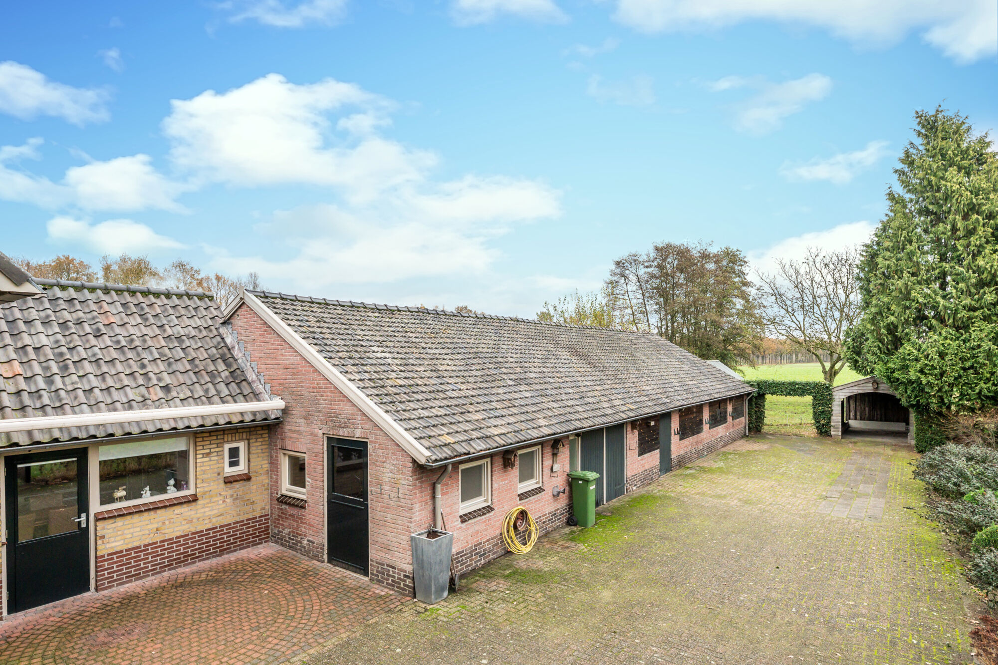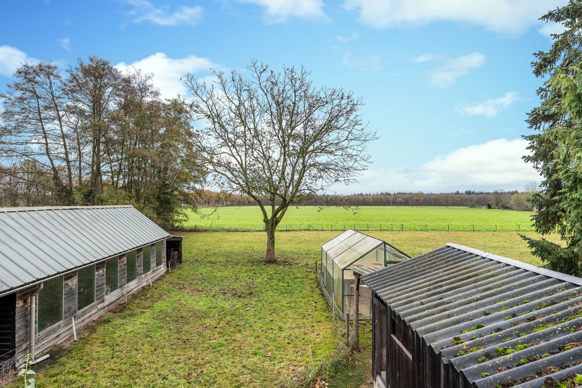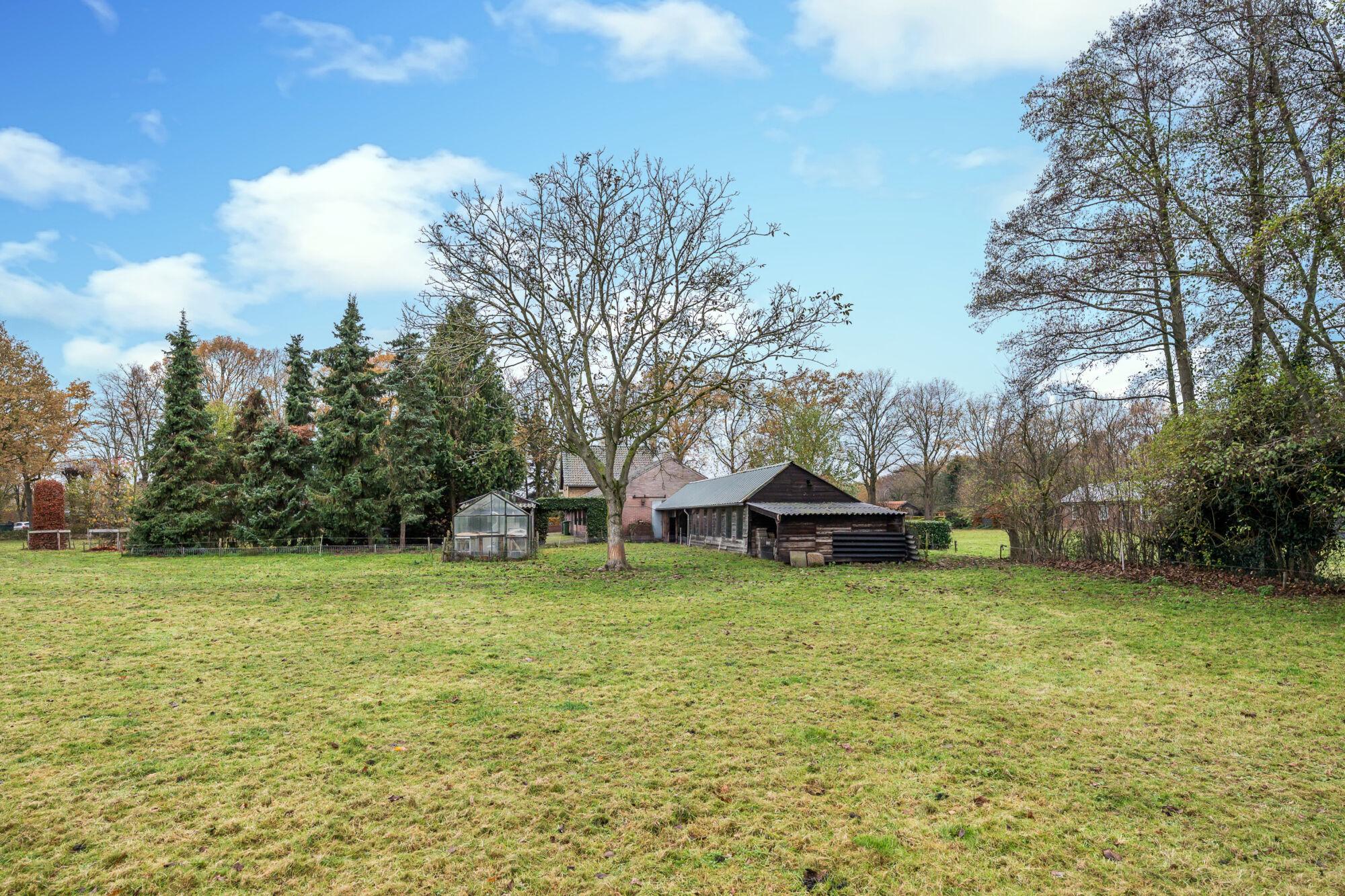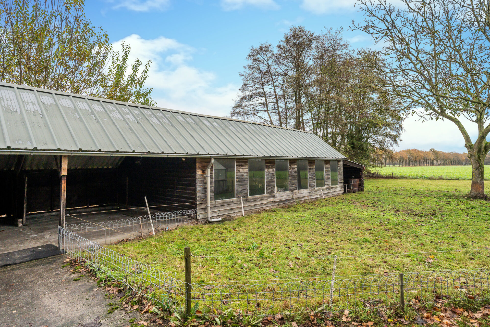 Achteraan de oprit bevinden zich nog een carport en een kas. In het veld is de afbakening van het perceel duidelijk zichtbaar door middel van paaltjes.