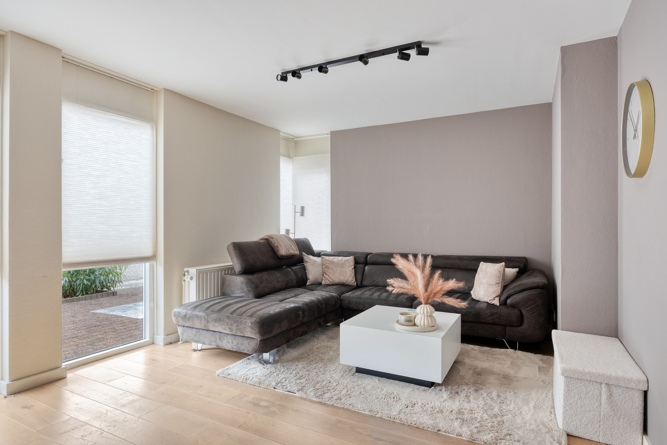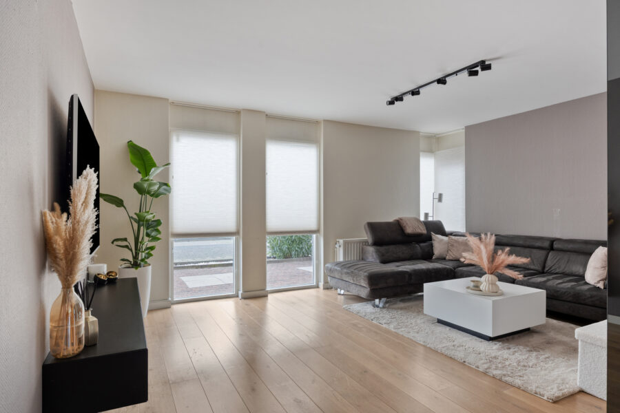 De woonkamer bevindt zich aan de zonnige zuidzijde en dankzij de grote ramen geniet je hier de hele dag van natuurlijk licht.