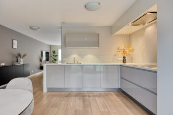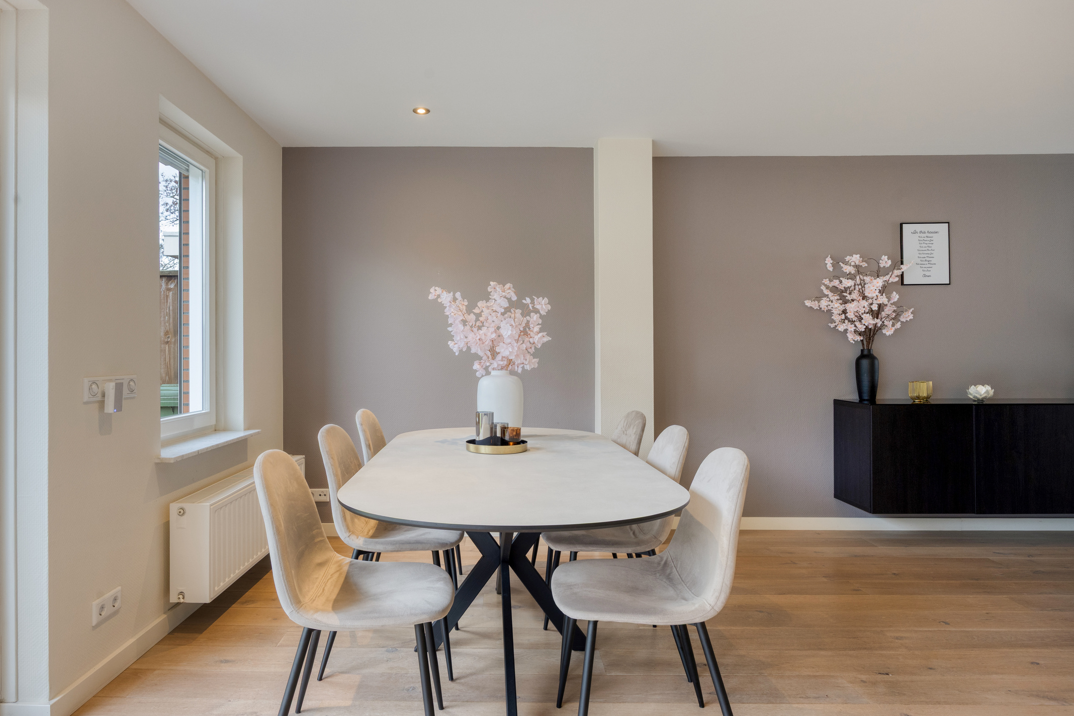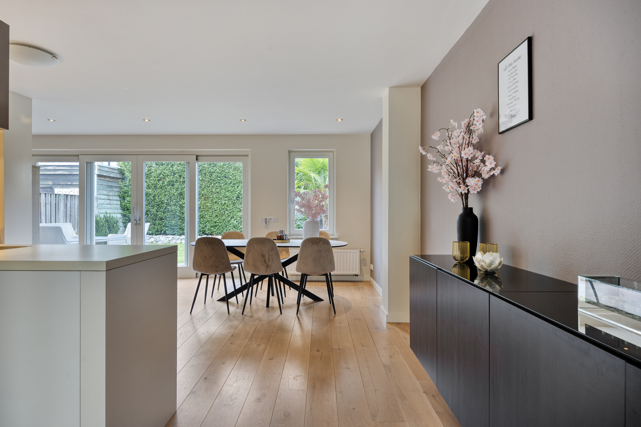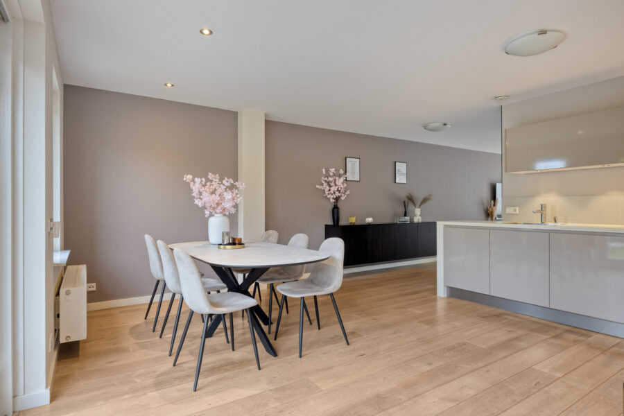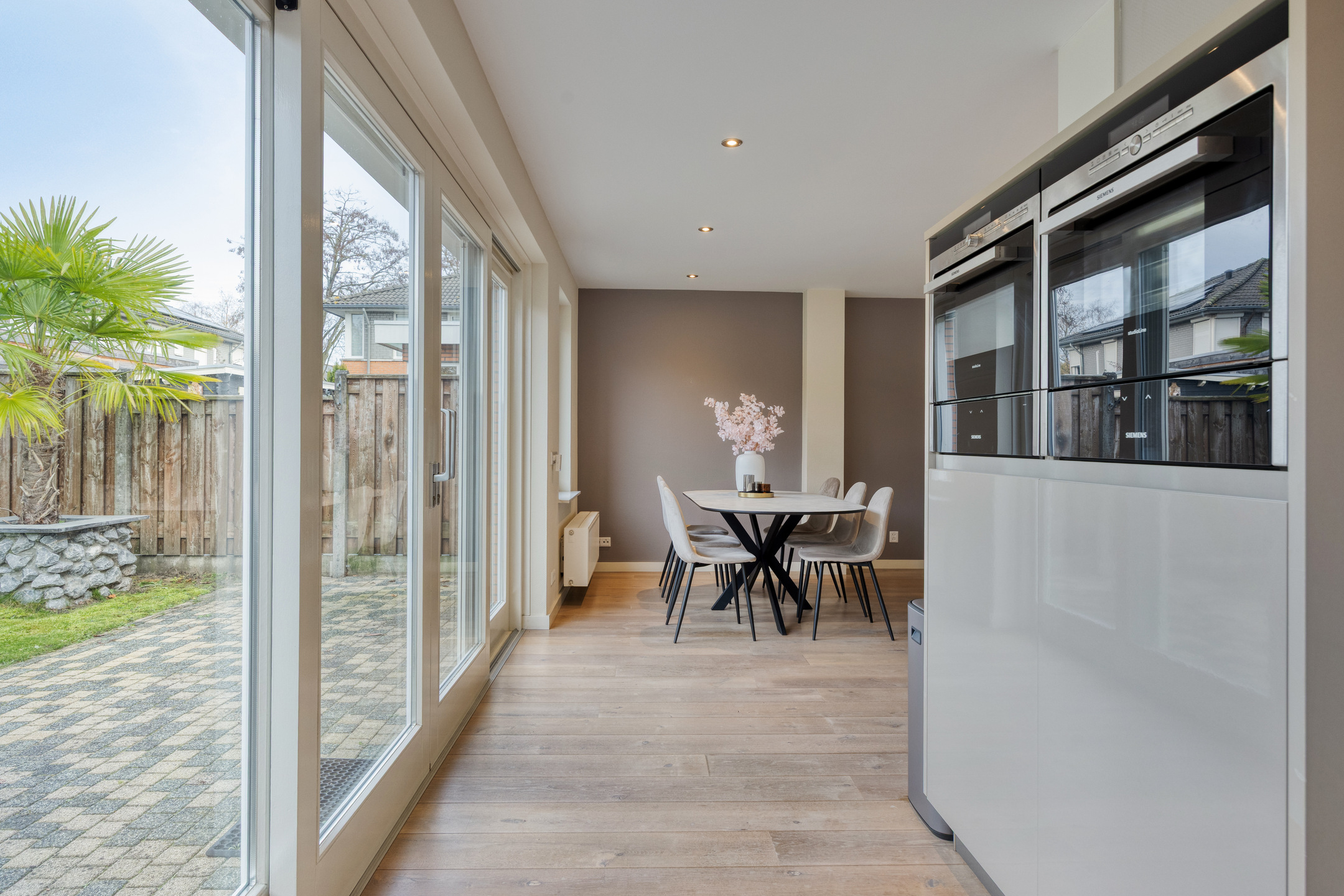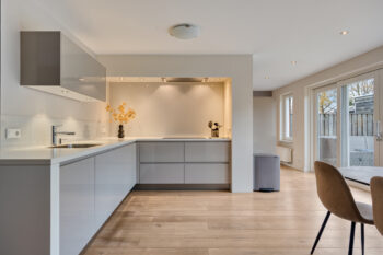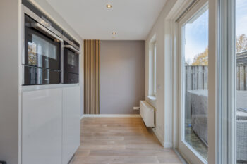 Aan de tuinzijde ligt de moderne leefkeuken. Alles is hier licht en strak afgewerkt, met een zachte taupe kleurstelling en een ruim wit L-vormig werkblad. Koken doe je op een inductieplaat met vijf kookzones, inclusief een verzonken afzuigsysteem in het plafond. Alle inbouwapparatuur is Siemens Studioline – inclusief twee ovens, een combimagnetron, grote koel-vriescombinatie én twee warmhoudlades. Vanuit de eethoek kijk je lekker de tuin in, en door de schuifdeuren stap je zó het terras op.