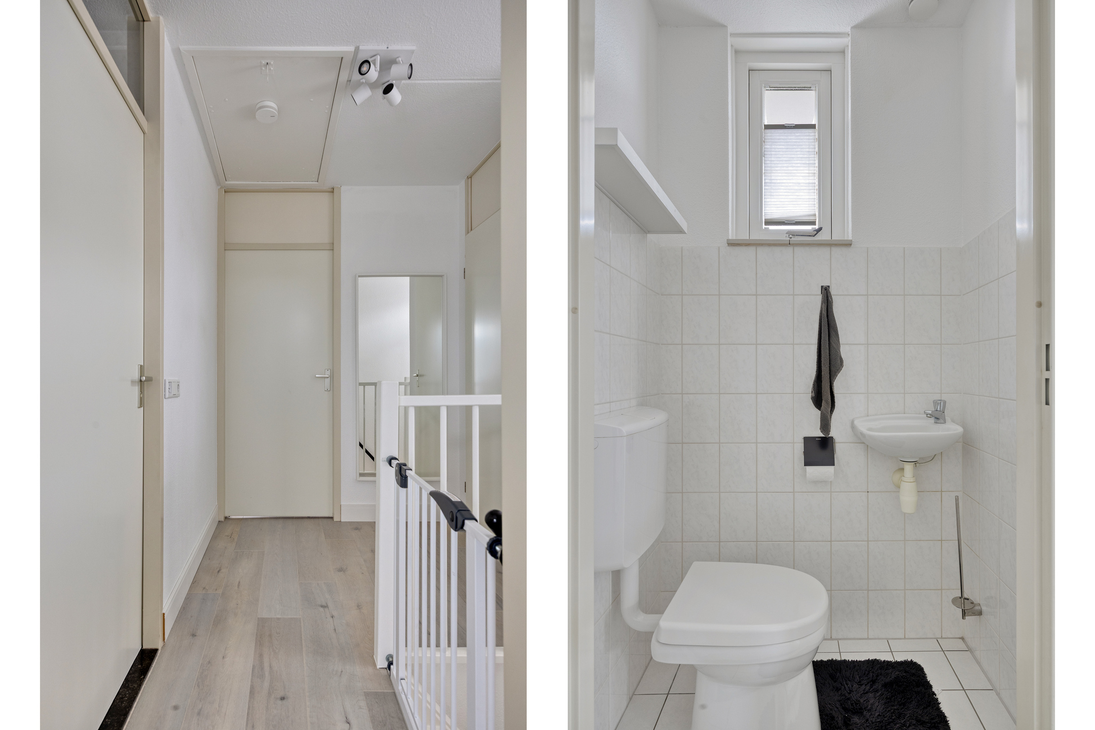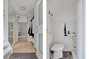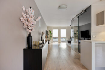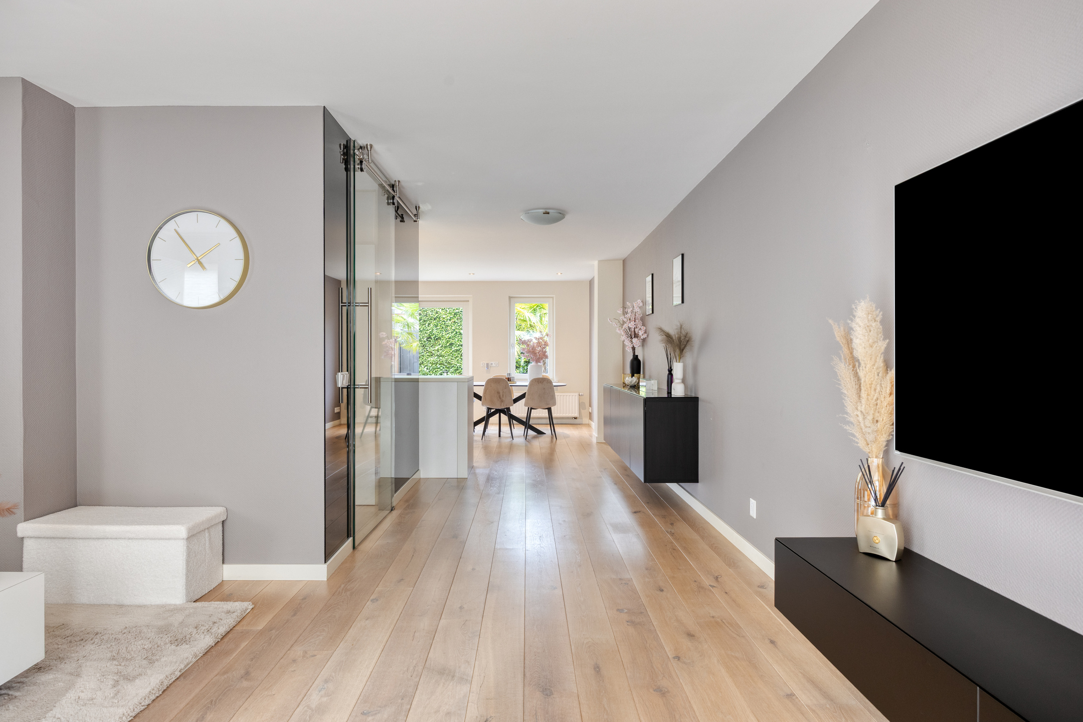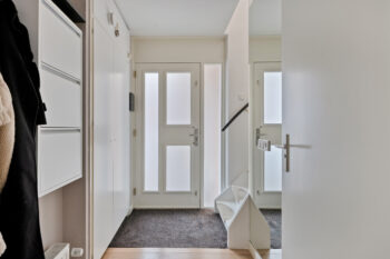 In de lichte ontvangsthal vind je de trap, meterkast, toilet en een prachtige glazen schuifdeur naar de living.