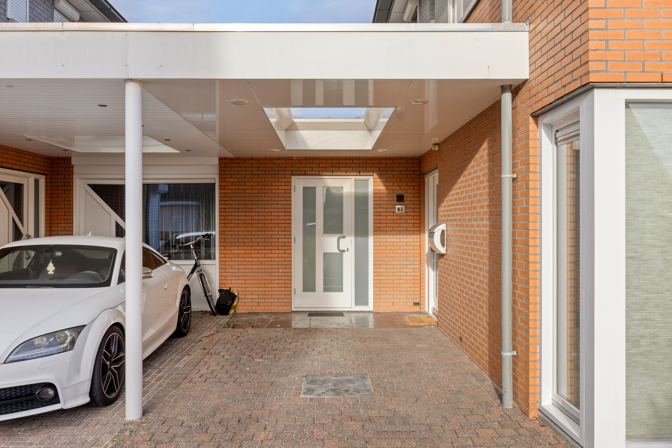 Onder de luxe carport met verlichting vind je twee voordeuren: via de rechter stap je binnen in de hal, via de linker kom je in de ruime bijkeuken.