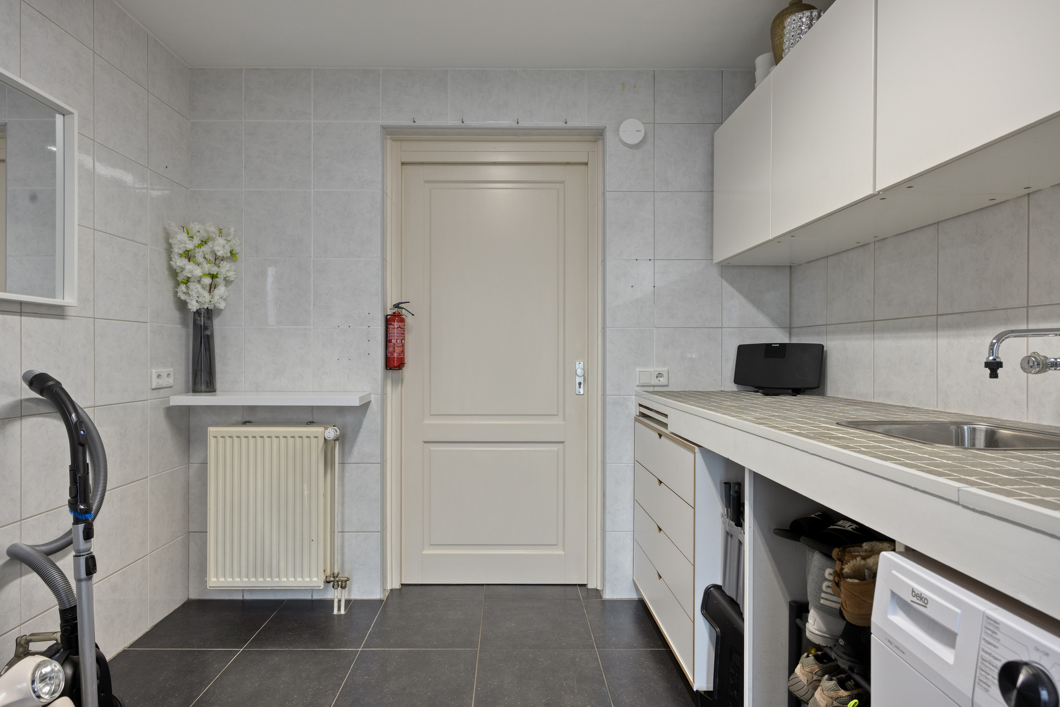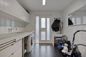 Via de keuken loop je door naar de bijkeuken: een ideale ruimte met aanrecht, spoelbak, volop kastruimte en aansluitingen voor wasmachine en droger. Hier is zelfs ruimte voor fietsen én een tweede deur naar buiten.