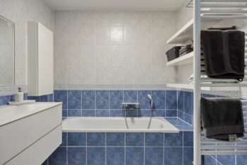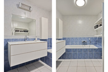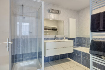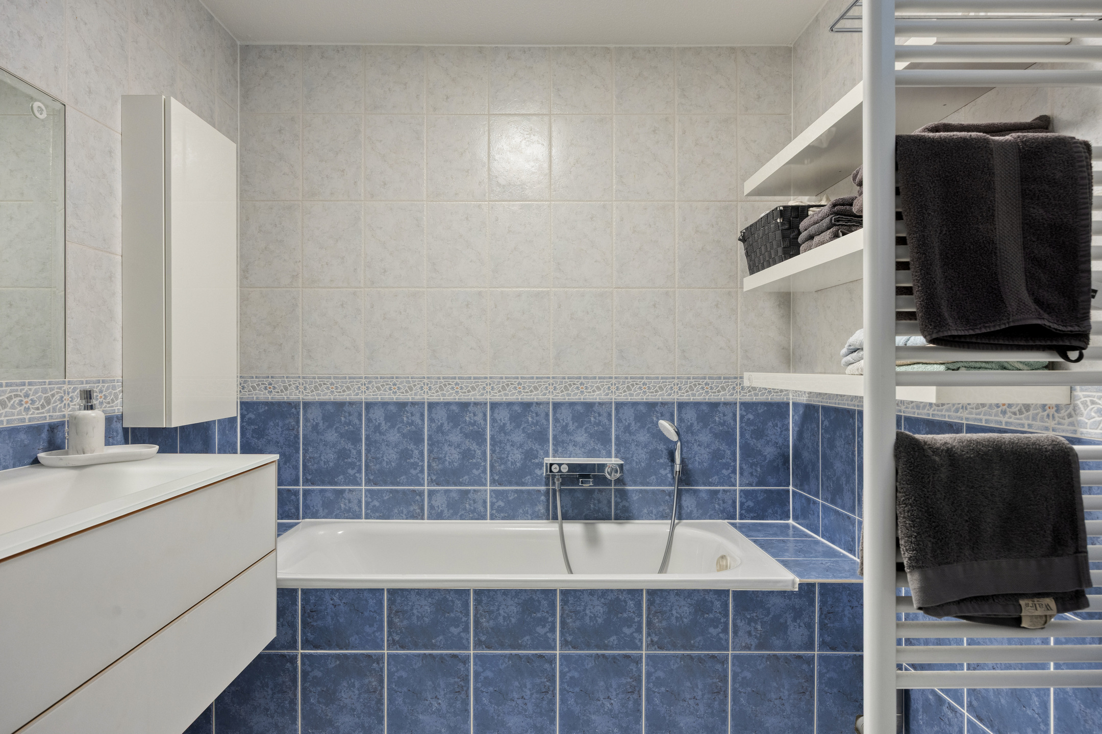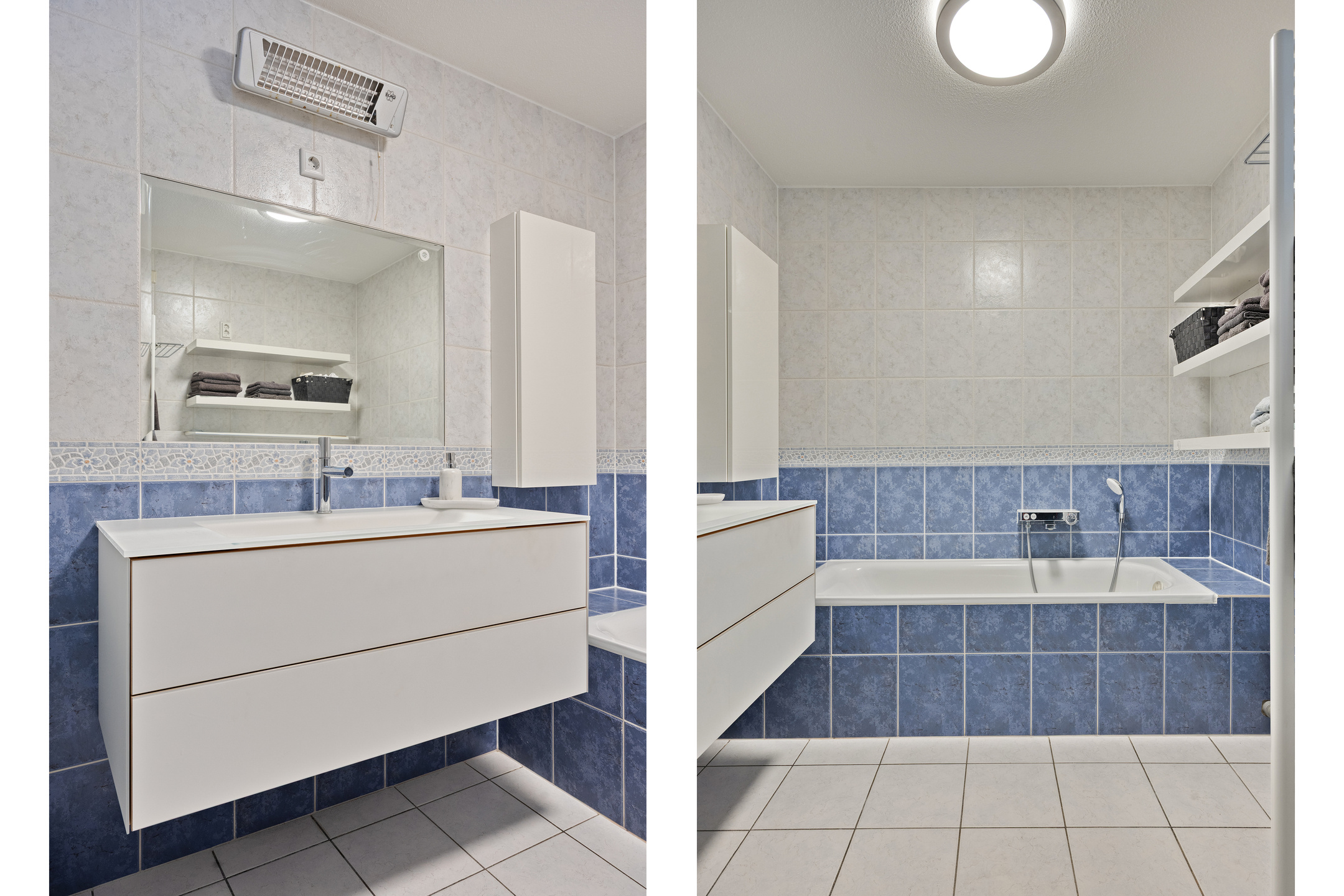 De badkamer is royaal opgezet en beschikt over een ligbad, een aparte douchecabine en een breed wastafelmeubel.