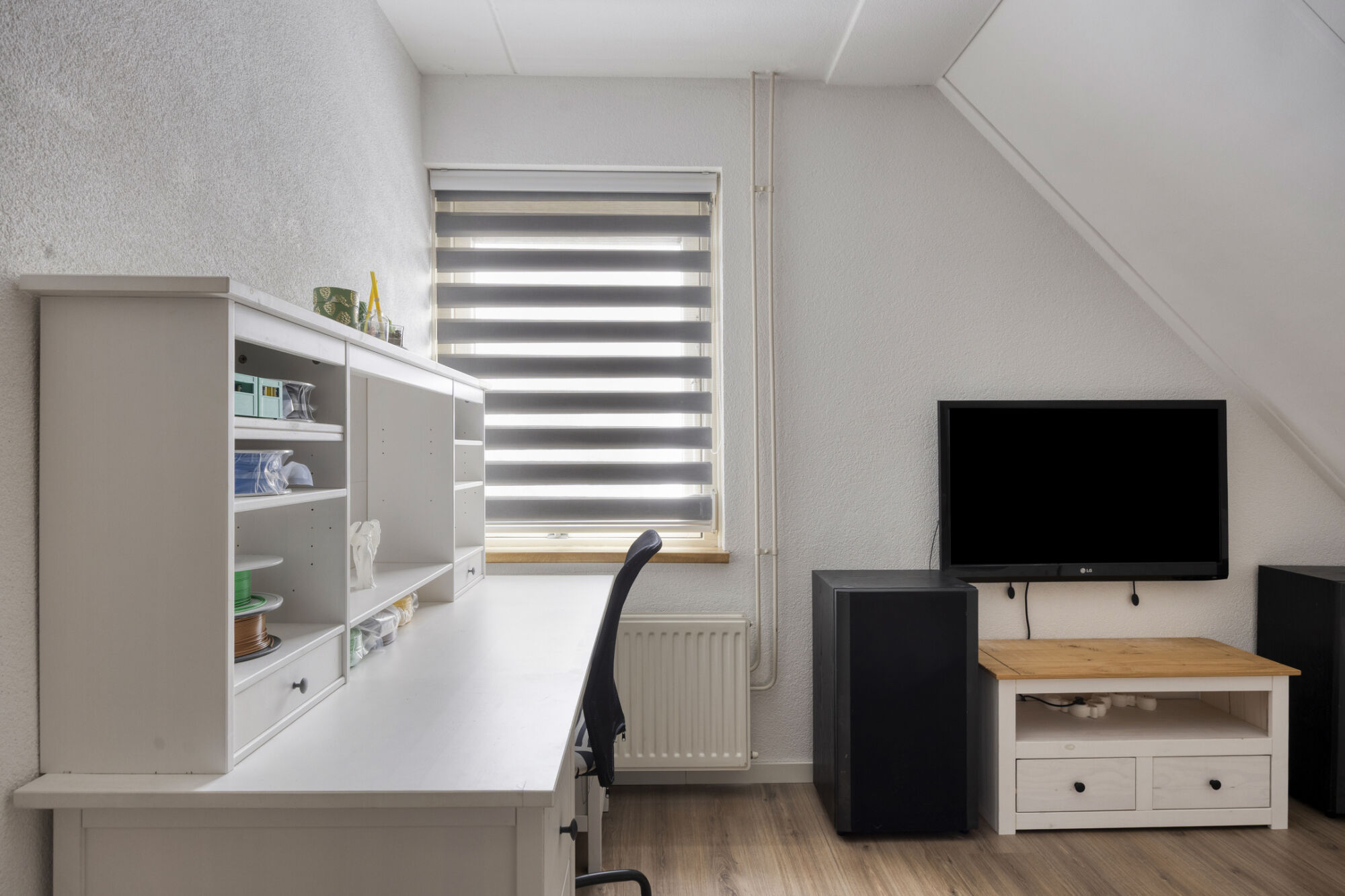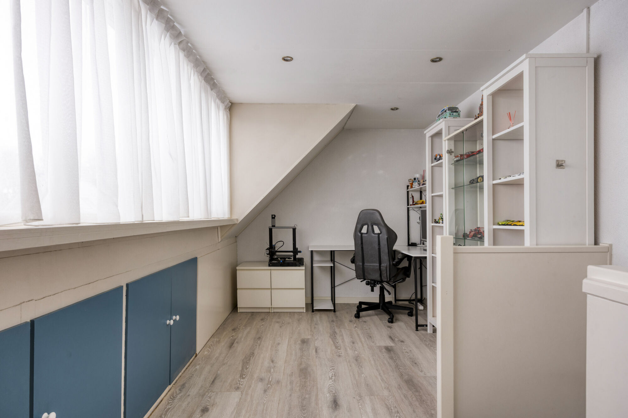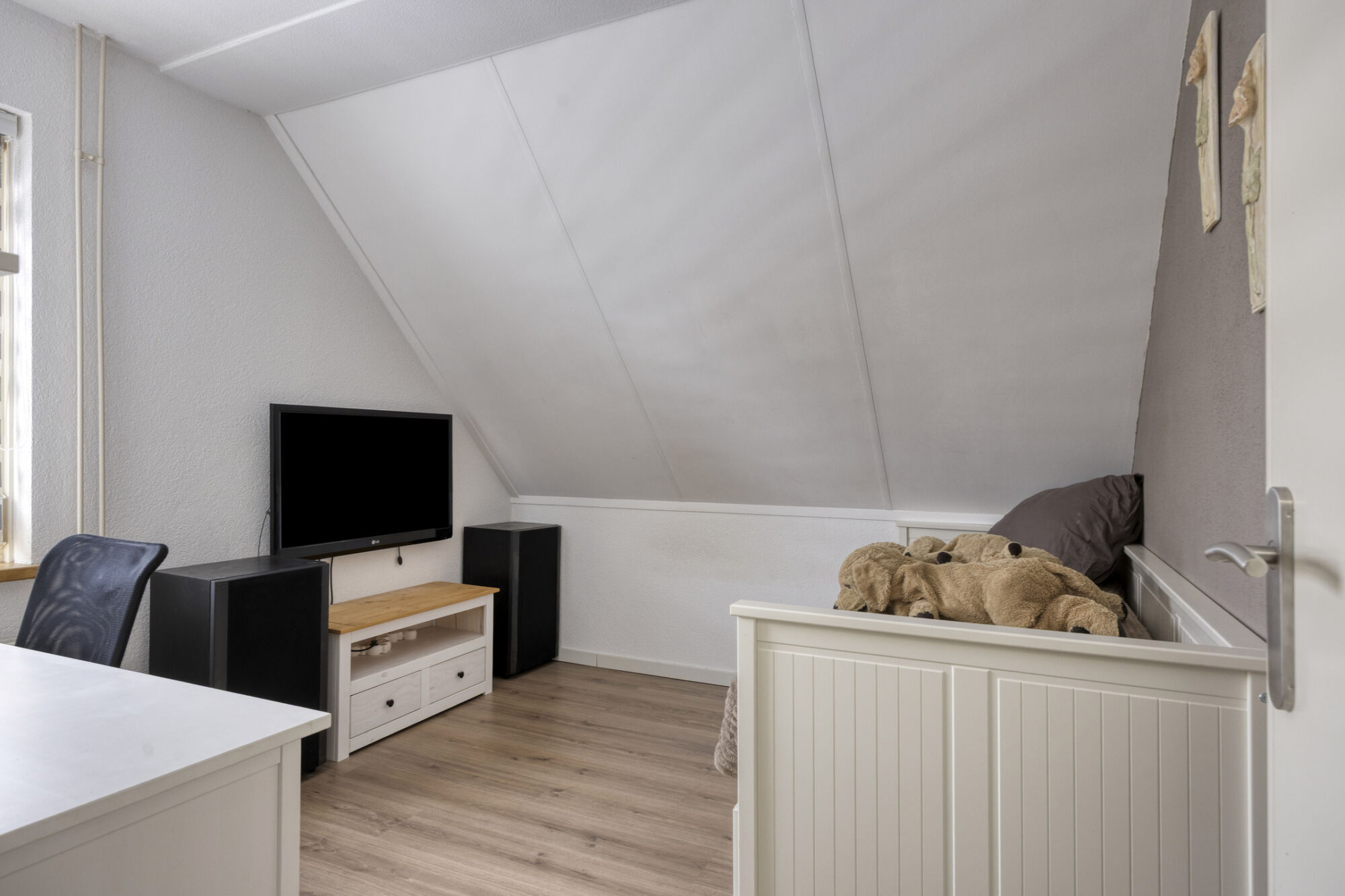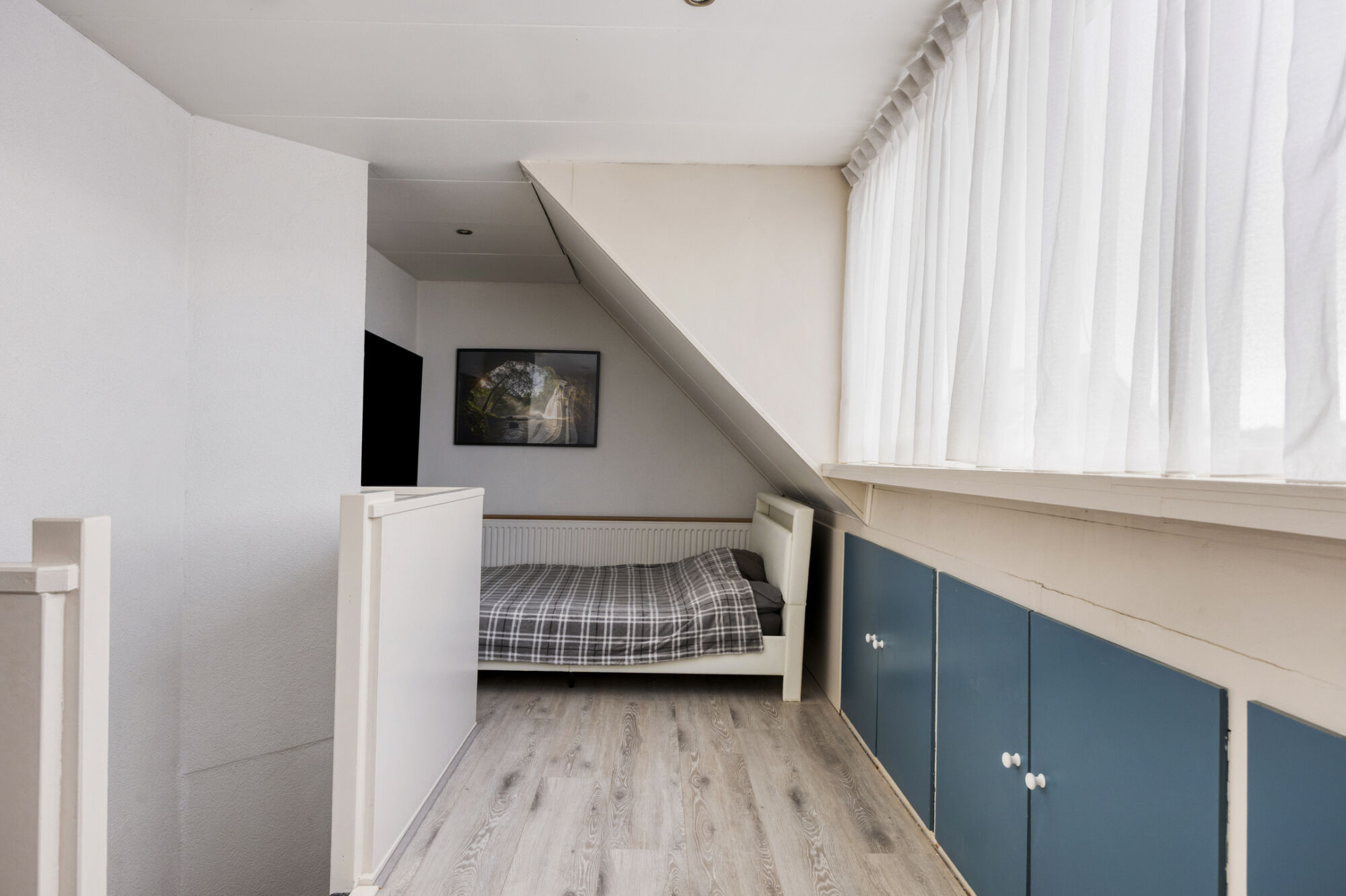 Via een vaste trap bereiken we de volwaardige tweede verdieping van de woning. Hier bevindt zich de vierde slaapkamer, een ruime kamer die mede dankzij de brede dakkapel extra groot is. De slaapkamer biedt voldoende plaats voor een tweepersoonsbed en diverse andere meubels. Momenteel is er zelfs een praktische studeer- of werkhoek ingericht. Onder de knieschotten zijn meerdere kasten geplaatst, waardoor deze verdieping tevens beschikt over extra opbergruimte.