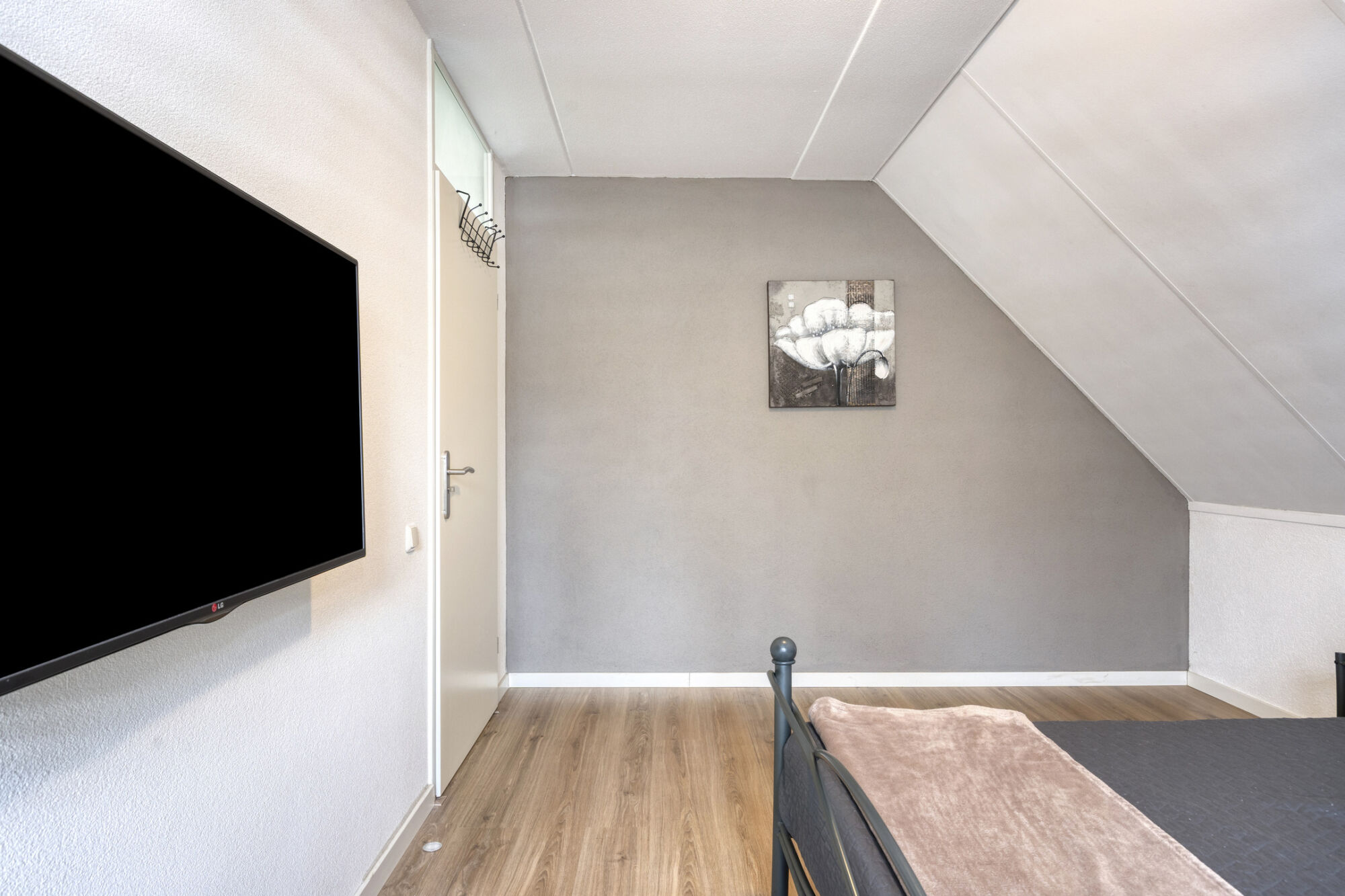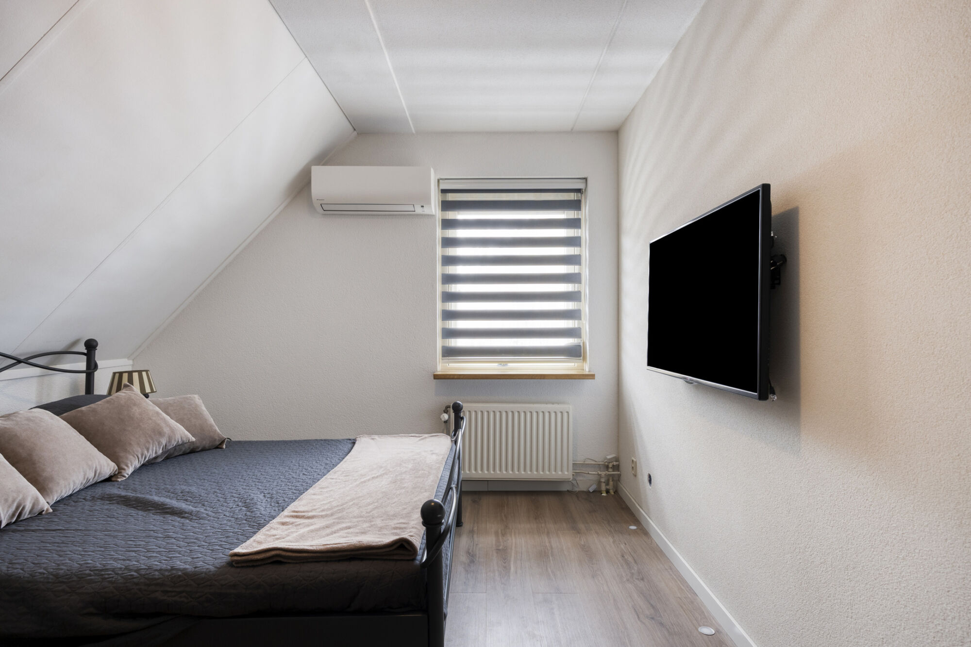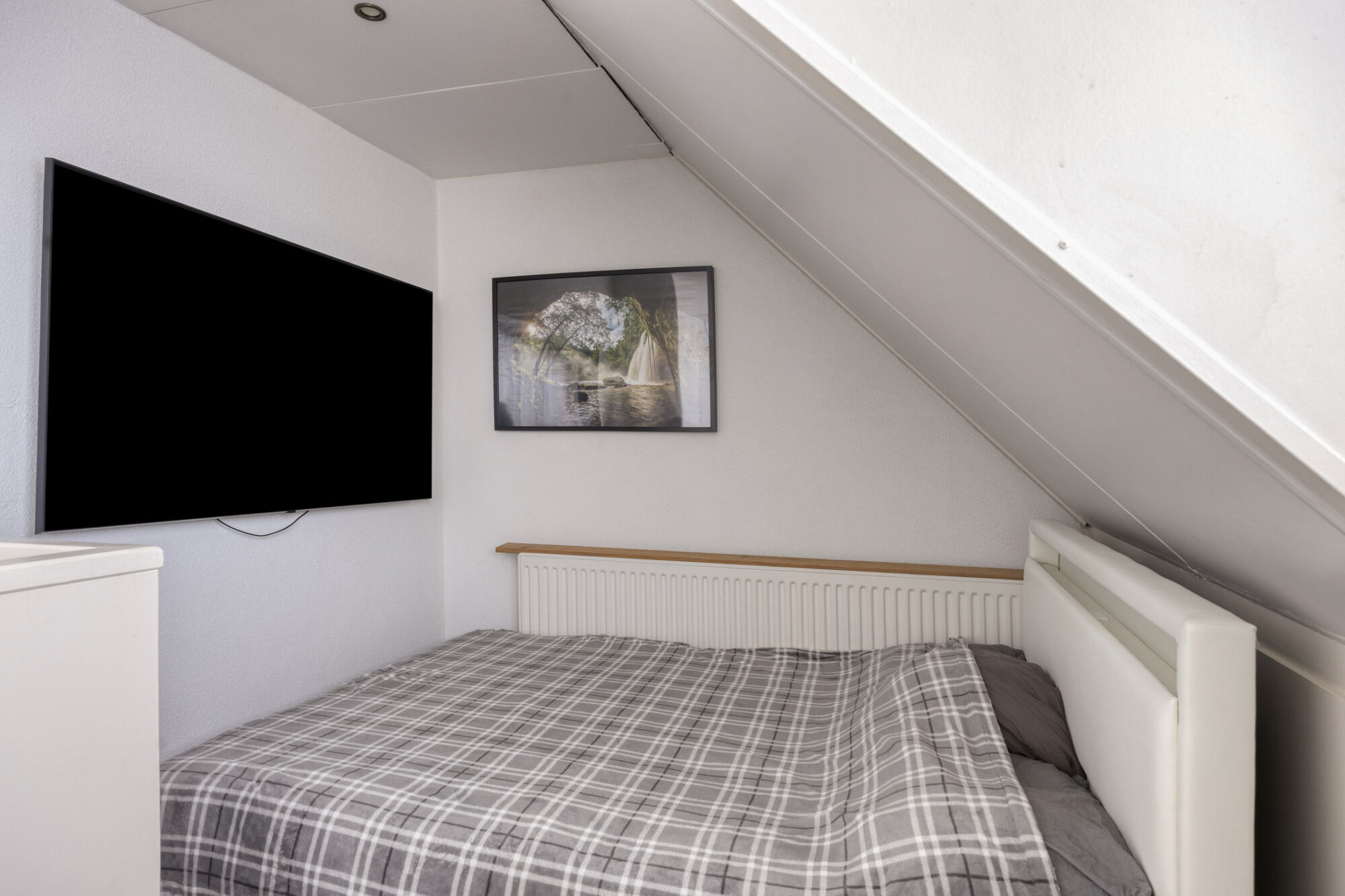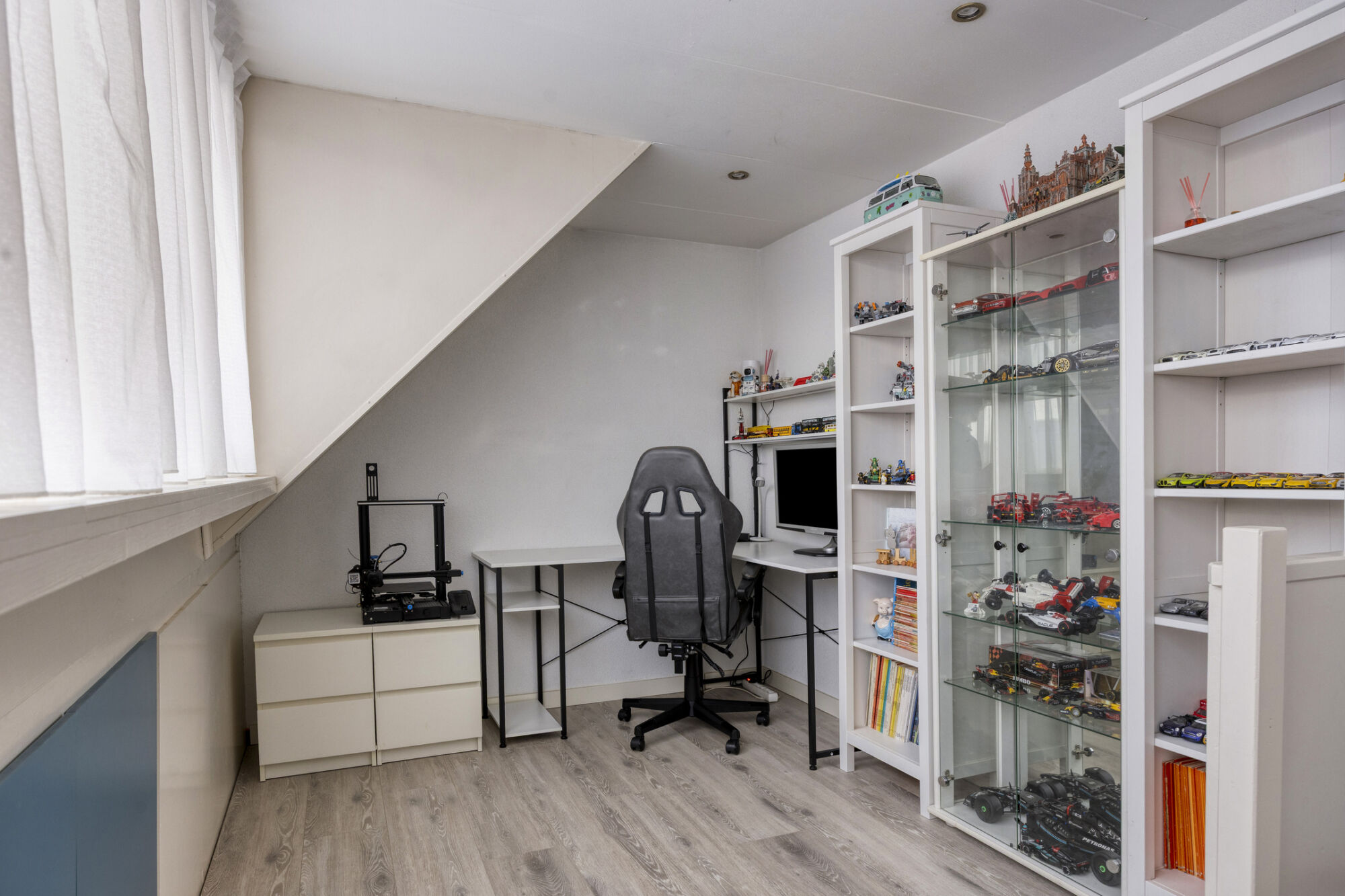 Via een vaste trap bereiken we de volwaardige tweede verdieping van de woning. Hier bevindt zich de vierde slaapkamer, een ruime kamer die mede dankzij de brede dakkapel extra groot is. De slaapkamer biedt voldoende plaats voor een tweepersoonsbed en diverse andere meubels. Momenteel is er zelfs een praktische studeer- of werkhoek ingericht. Onder de knieschotten zijn meerdere kasten geplaatst, waardoor deze verdieping tevens beschikt over extra opbergruimte.